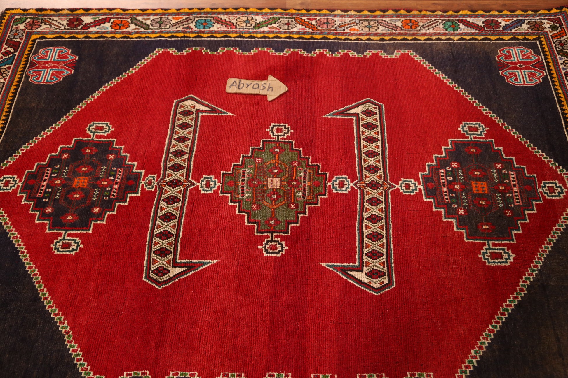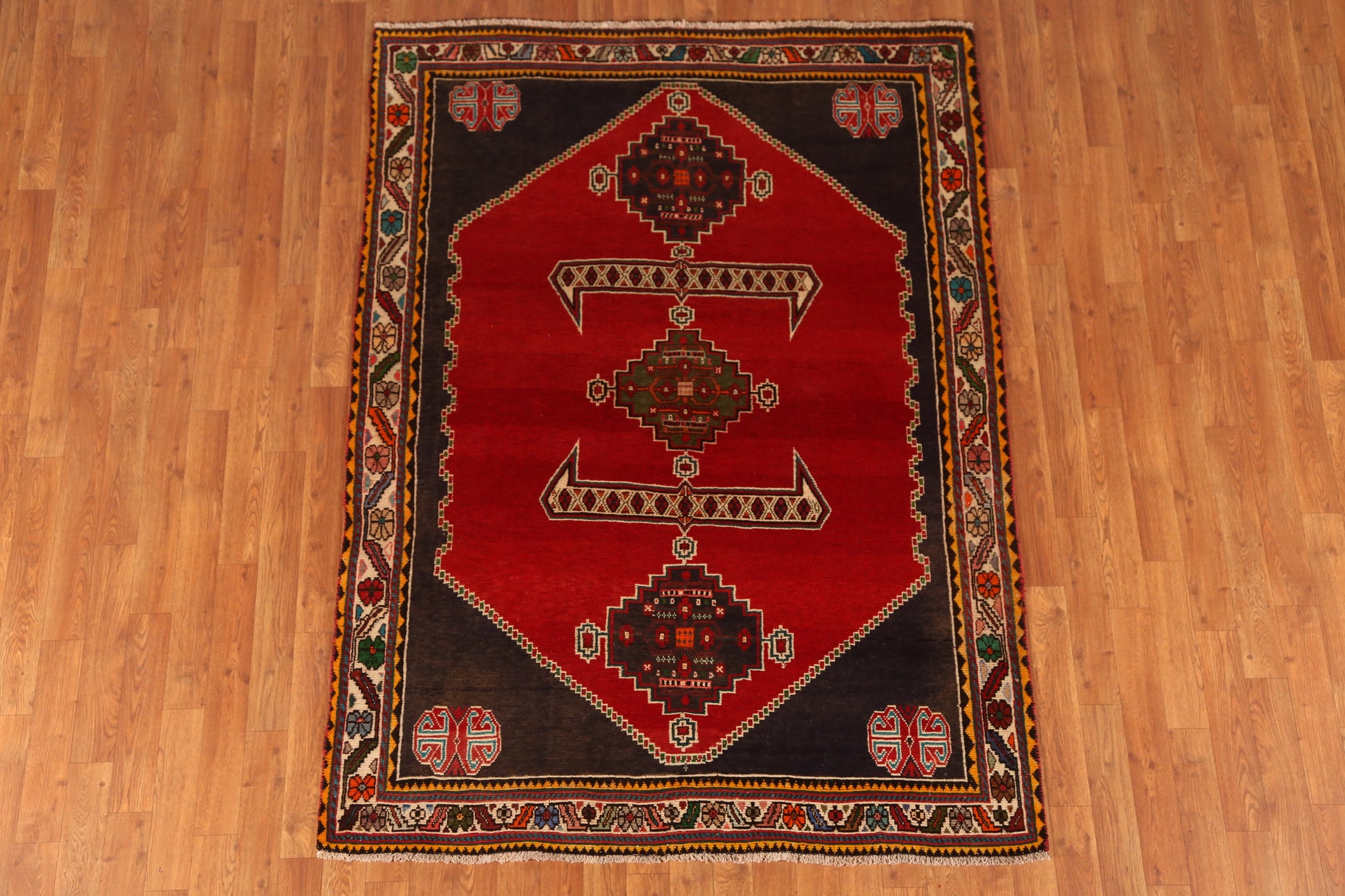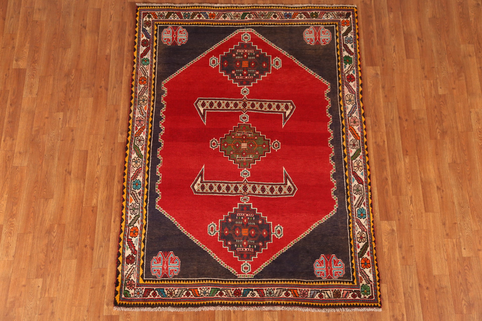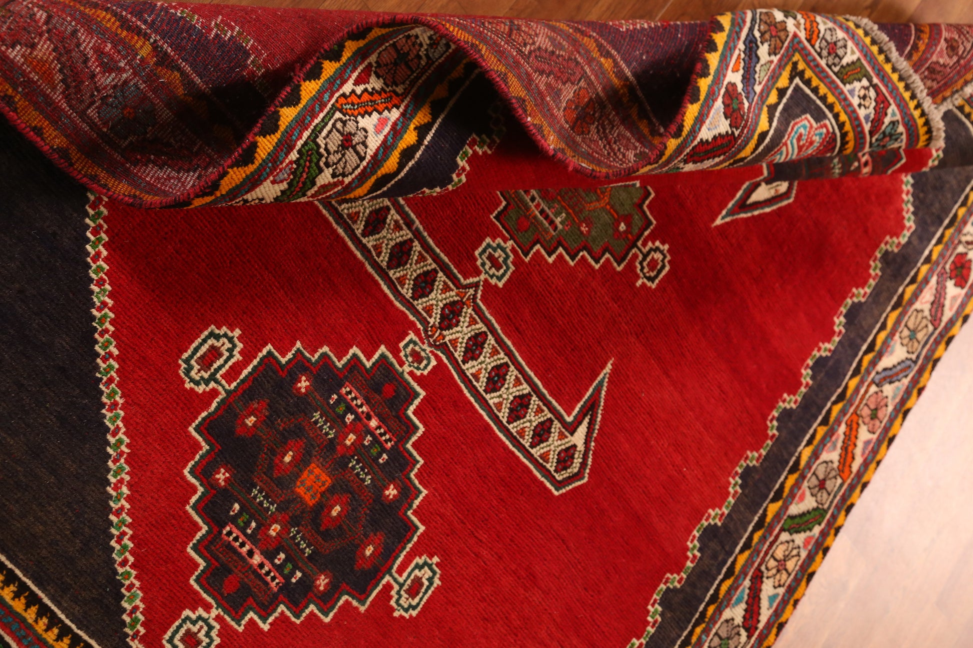 A Beautiful Genuine Persia ( Persia ) Shiraz rug is Hand Knotted by skillful weavers in Persia ( Persia ) with 100% Wool Material. This rug is in Very Good (Abrash) condition. dimensions are 6' 4'' X 4' 7'' in foot and 193 X 140 in centimeter. the primary color is Red.
