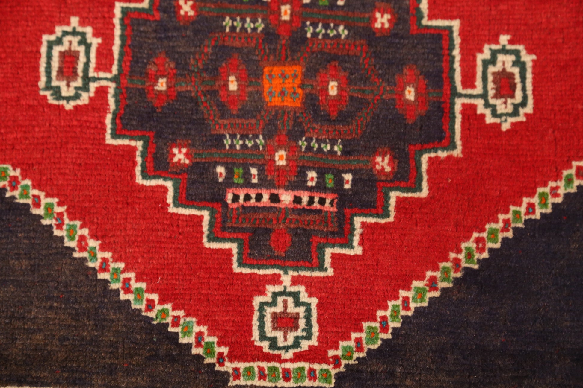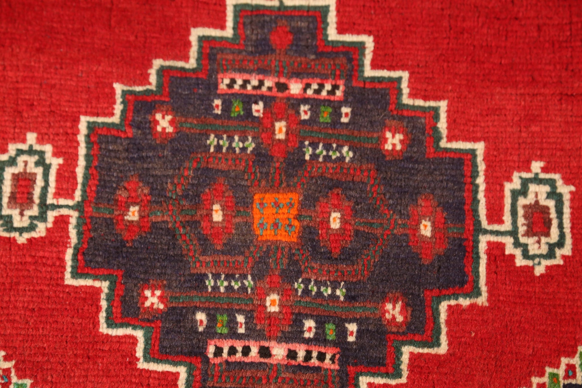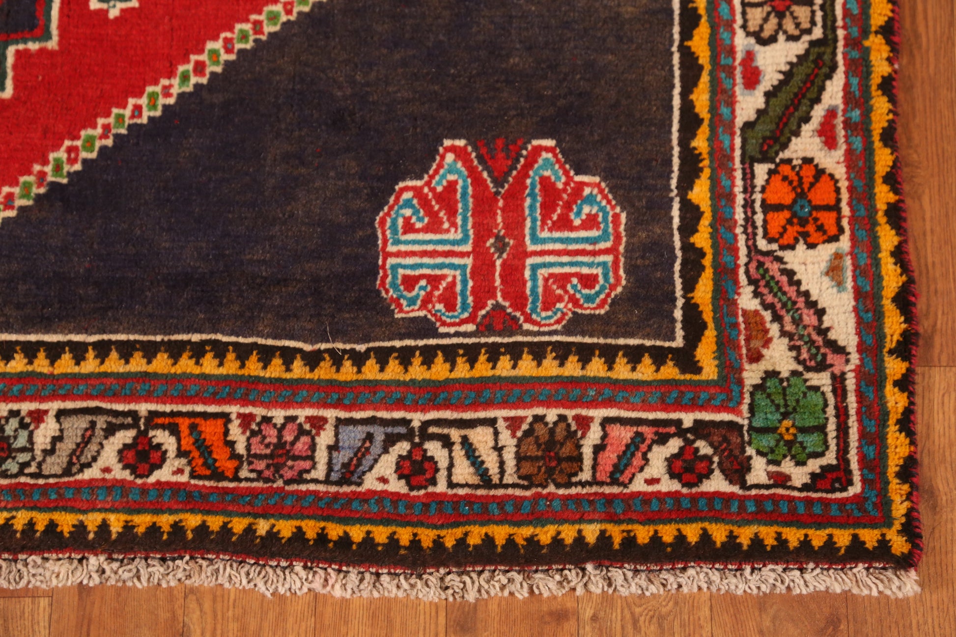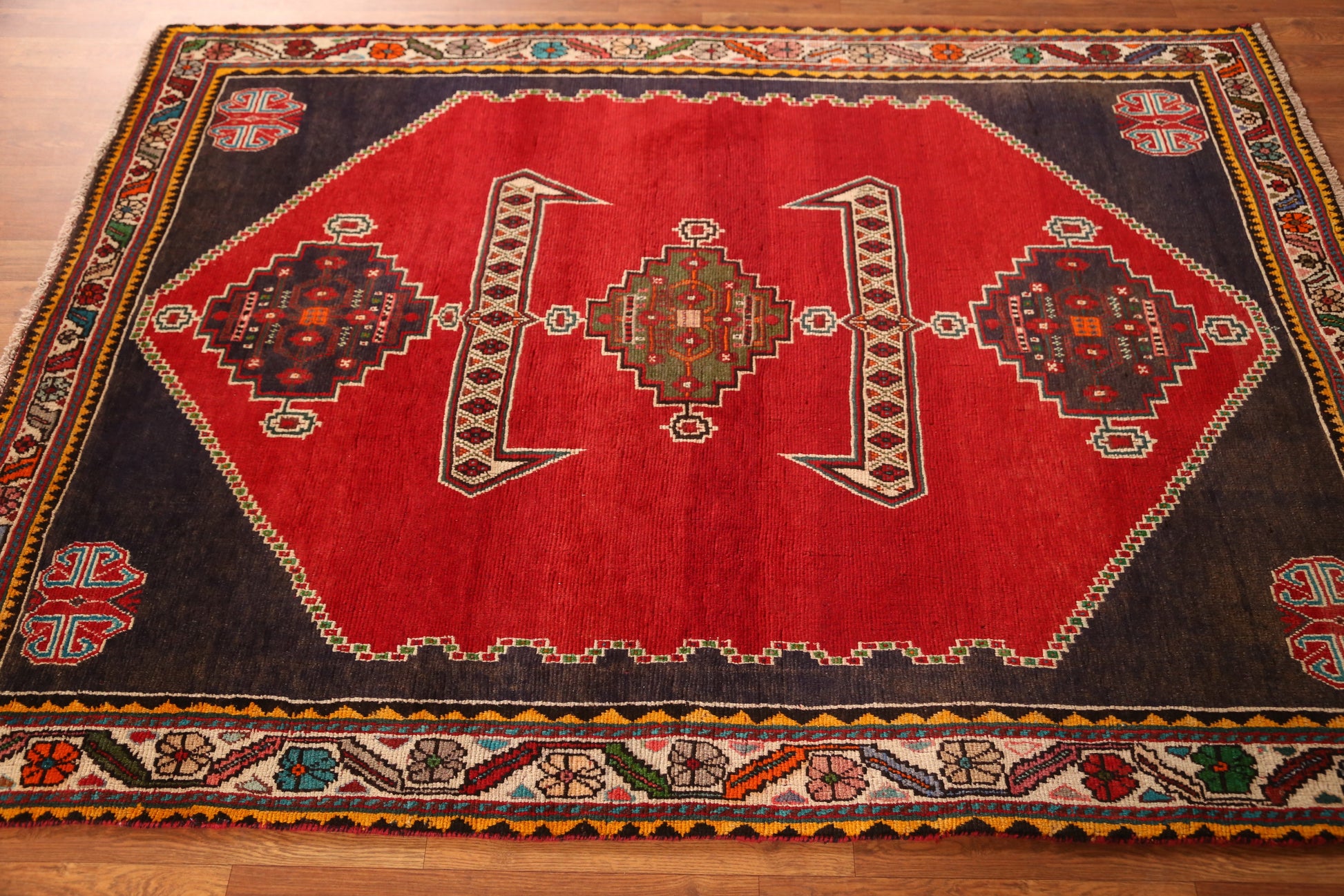 A Beautiful Genuine Persia ( Persia ) Shiraz rug is Hand Knotted by skillful weavers in Persia ( Persia ) with 100% Wool Material. This rug is in Very Good (Abrash) condition. dimensions are 6' 4'' X 4' 7'' in foot and 193 X 140 in centimeter. the primary color is Red.