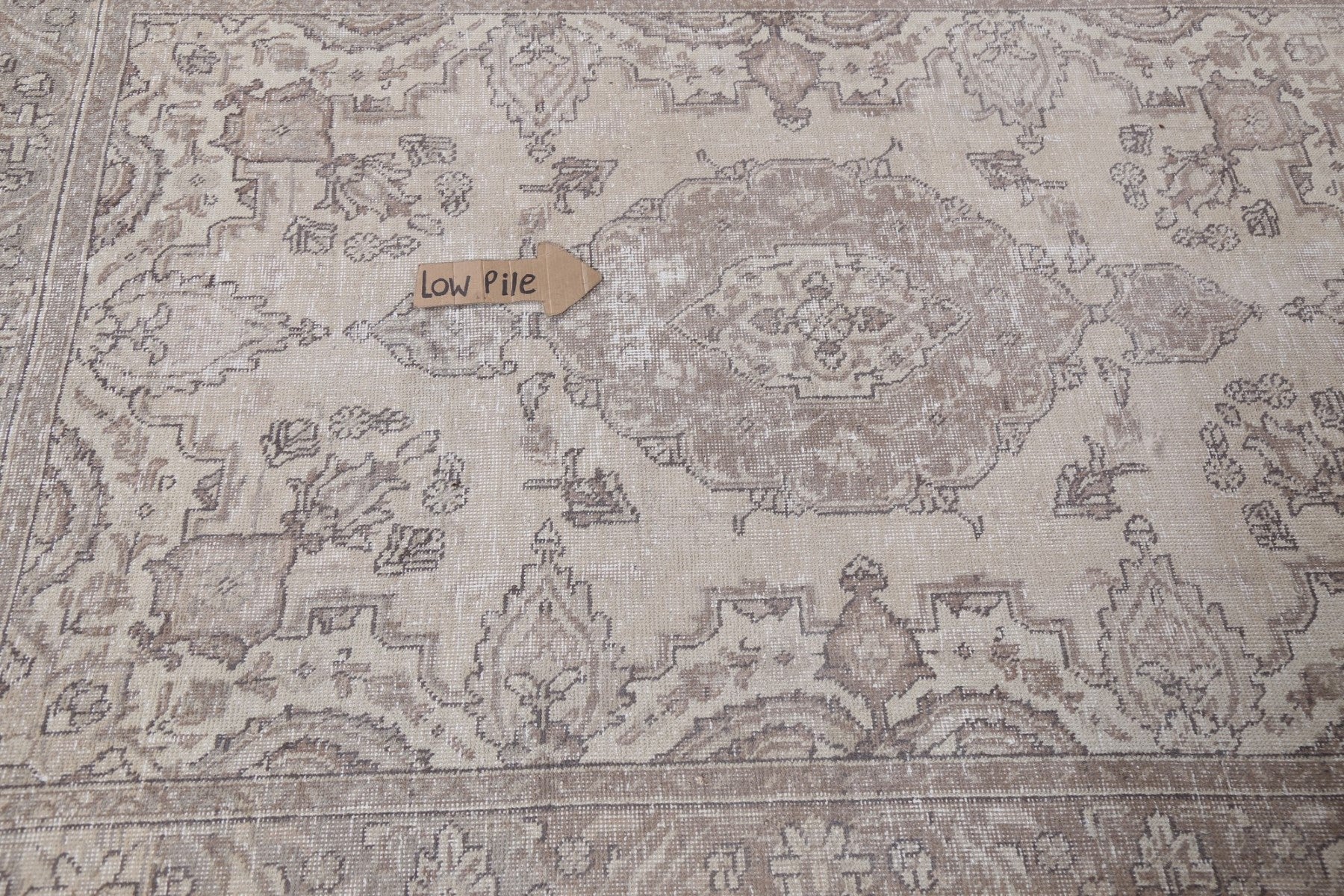 A Beautiful Genuine Persia ( Persia ) Tabriz rug is Hand Knotted by skillful weavers in Persia ( Persia ) with 100% Wool Material. This rug is in Very Good ( Low Pile ) condition. dimensions are 5' 10'' X 4' 0'' in foot and 178 X 122 in centimeter. the primary color is Beige & Ivories.