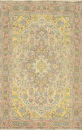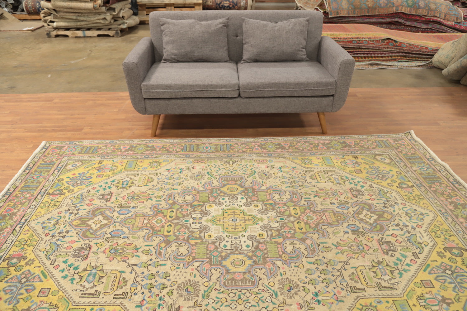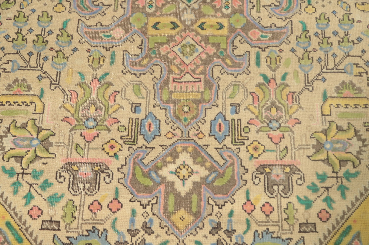 A Beautiful Genuine Persia ( Persia ) Tabriz rug is Hand Knotted by skillful weavers in Persia ( Persia ) with 100% Wool Material. This rug is in Very Good (Evenly Low Pile) condition. dimensions are 9' 5'' X 6' 5'' in foot and 287 X 196 in centimeter. the primary color is Beige & Ivories.