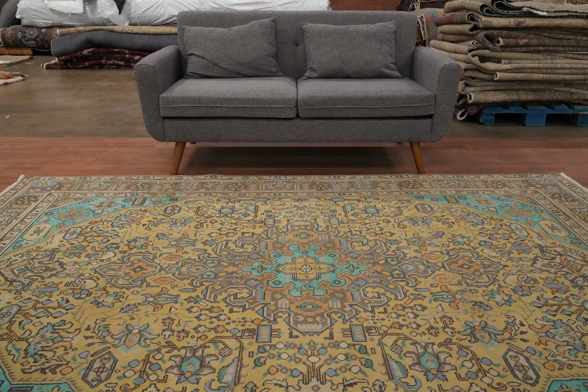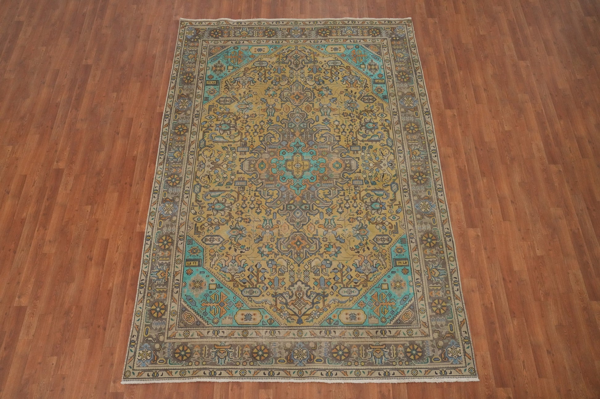 A Beautiful Genuine Persia ( Persia ) Tabriz rug is Hand Knotted by skillful weavers in Persia ( Persia ) with 100% Wool Material. This rug is in Very Good (Evenly Low Pile) condition. dimensions are 9' 6'' X 6' 7'' in foot and 290 X 201 in centimeter. the primary color is Yellow & Gold.