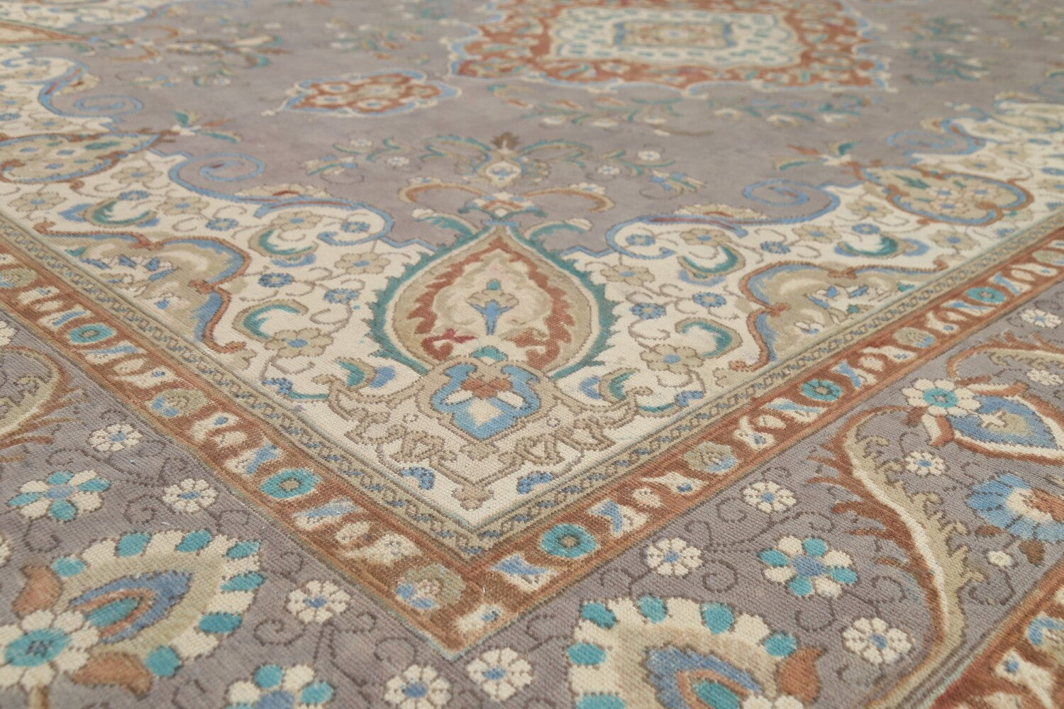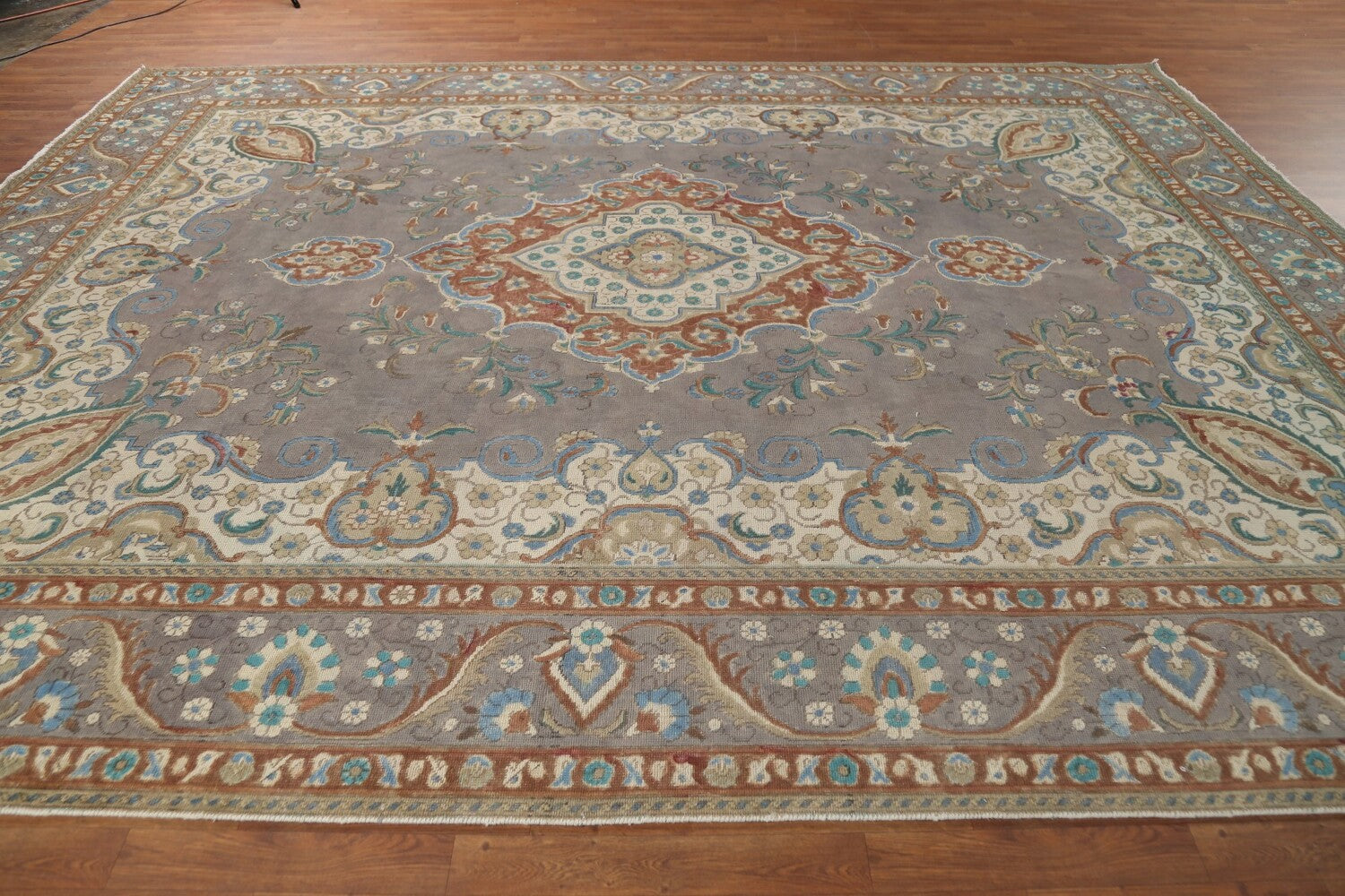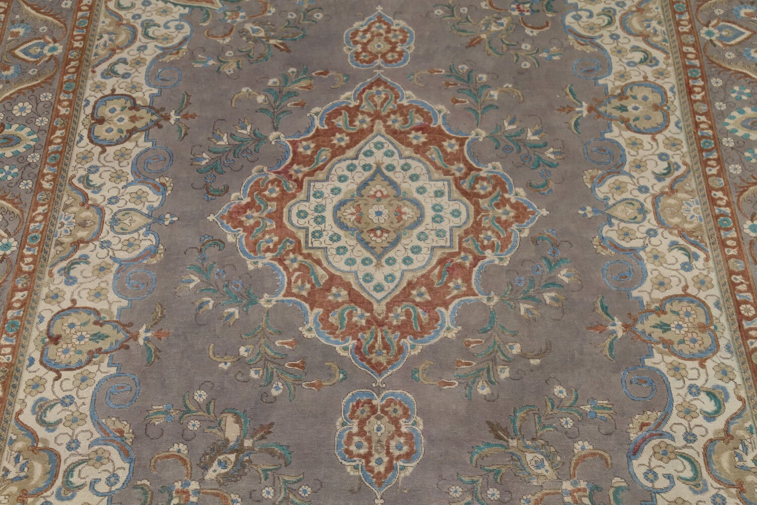 A Beautiful Genuine Persia ( Persia ) Tabriz rug is Hand Knotted by skillful weavers in Persia ( Persia ) with 100% Wool Material. This rug is in Very Good (Evenly Low Pile-Repair) condition. dimensions are 12' 10'' X 9' 9'' in foot and 391 X 297 in centimeter. the primary color is Greys & Charcoal.