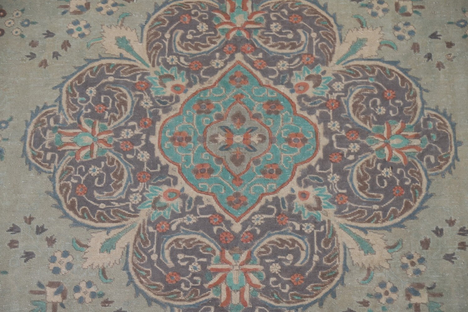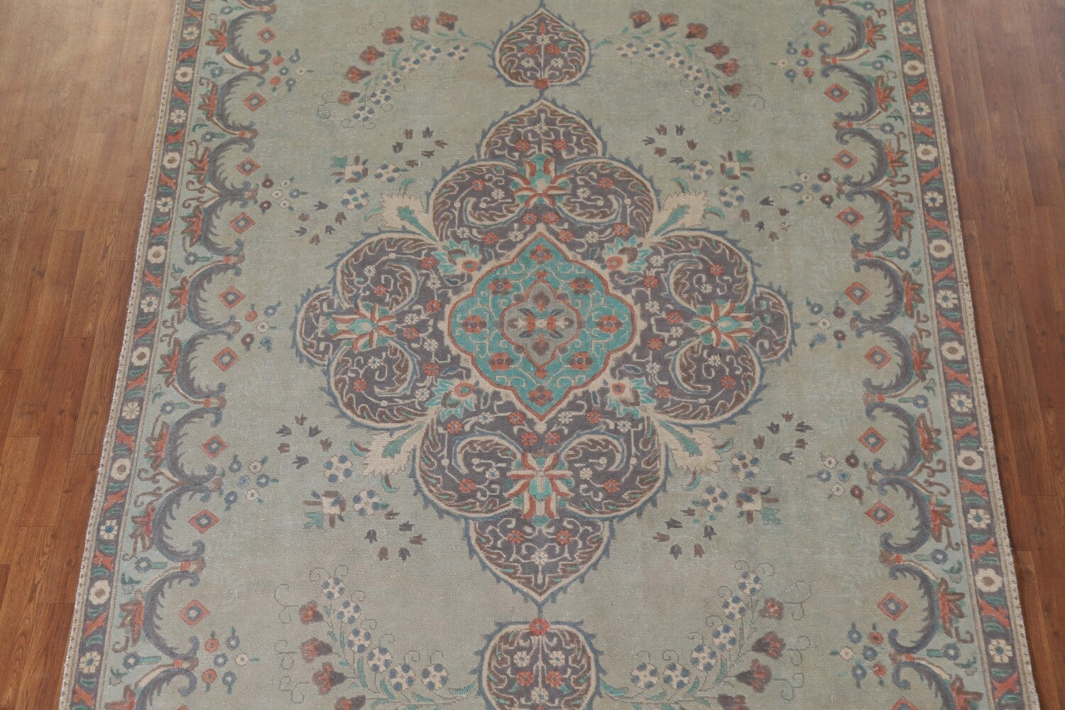 A Beautiful Genuine Persia ( Persia ) Tabriz rug is Hand Knotted by skillful weavers in Persia ( Persia ) with 100% Wool Material. This rug is in Very Good (Evenly Low Pile) condition. dimensions are 10' 9'' X 7' 6'' in foot and 328 X 229 in centimeter. the primary color is Green.