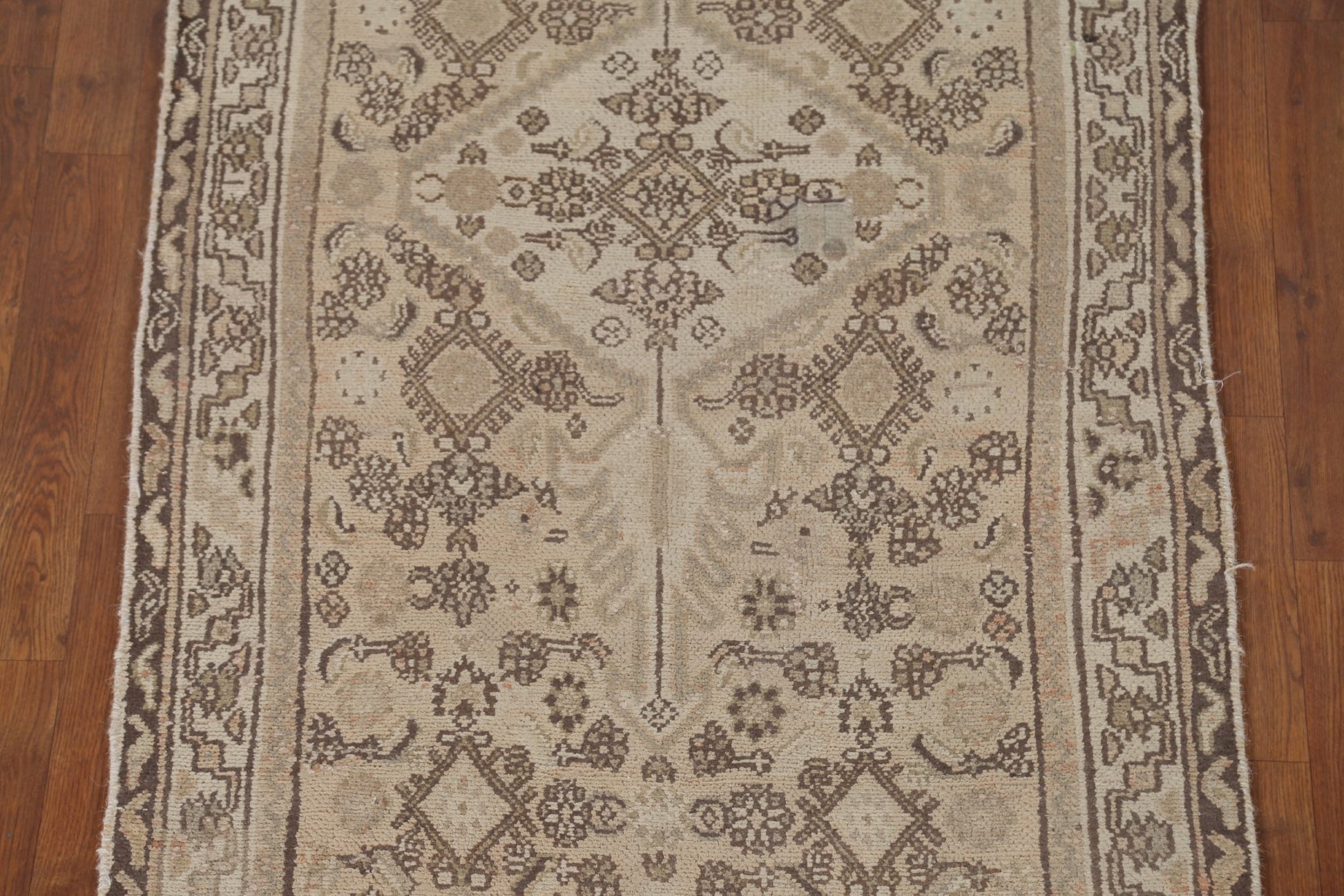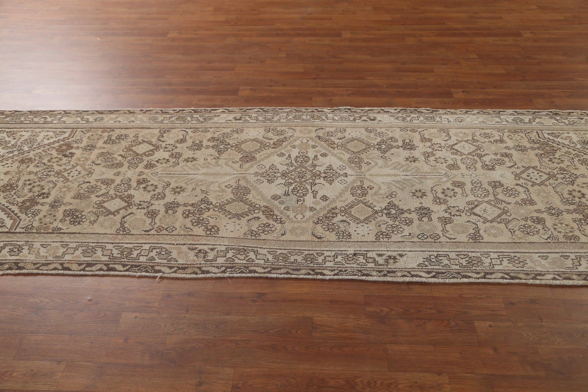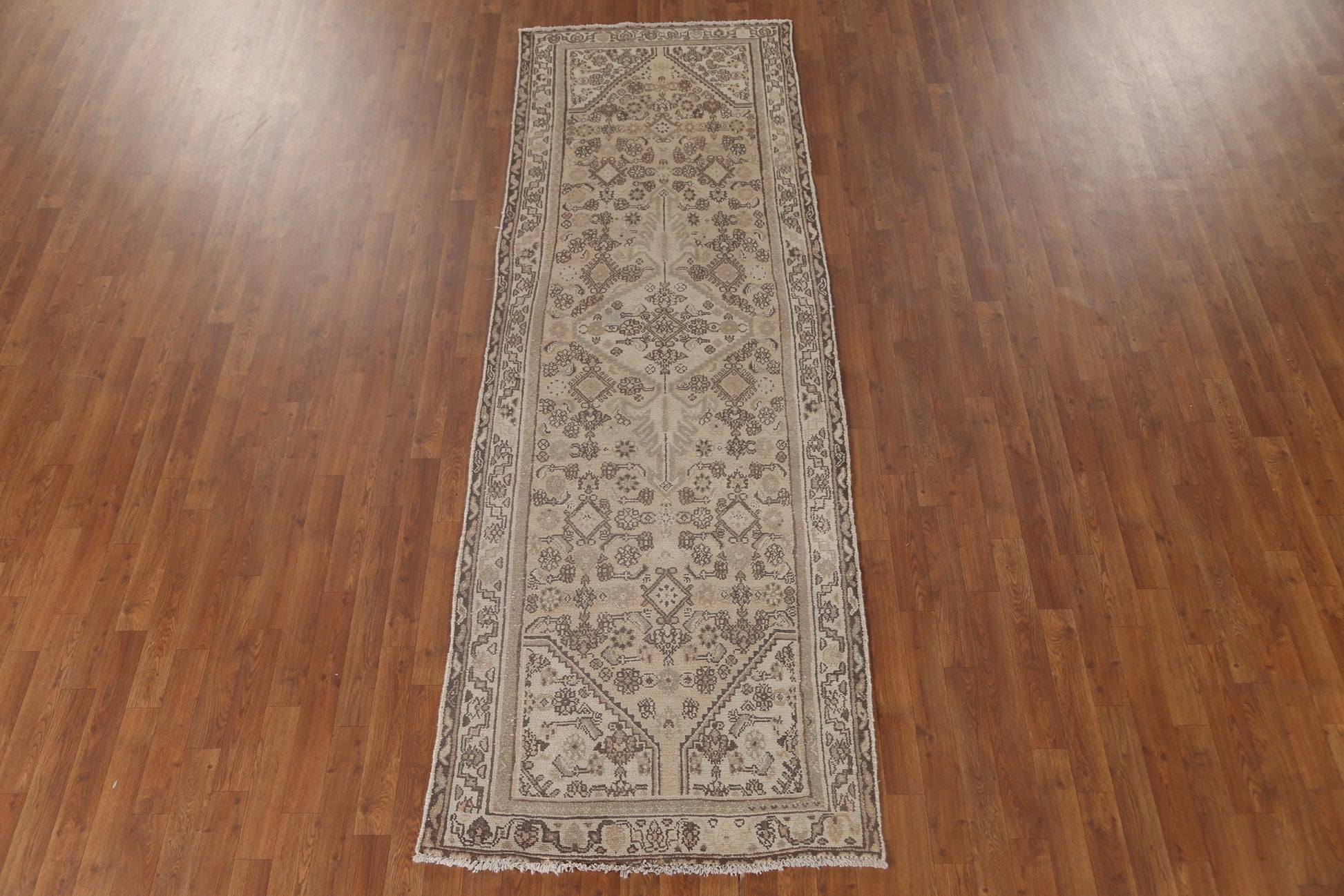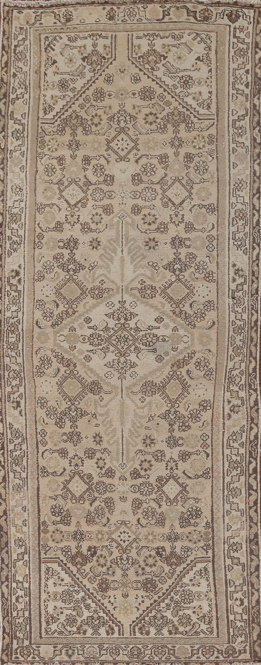 A Beautiful Genuine Persia ( Persia ) Hamedan rug is Hand Knotted by skillful weavers in Persia ( Persia ) with 100% Wool Material. This rug is in Very Good (Evenly Low Pile-Repair) condition. dimensions are 9' 9'' X 3' 3'' in foot and 297 X 99 in centimeter. the primary color is Beige & Ivories.