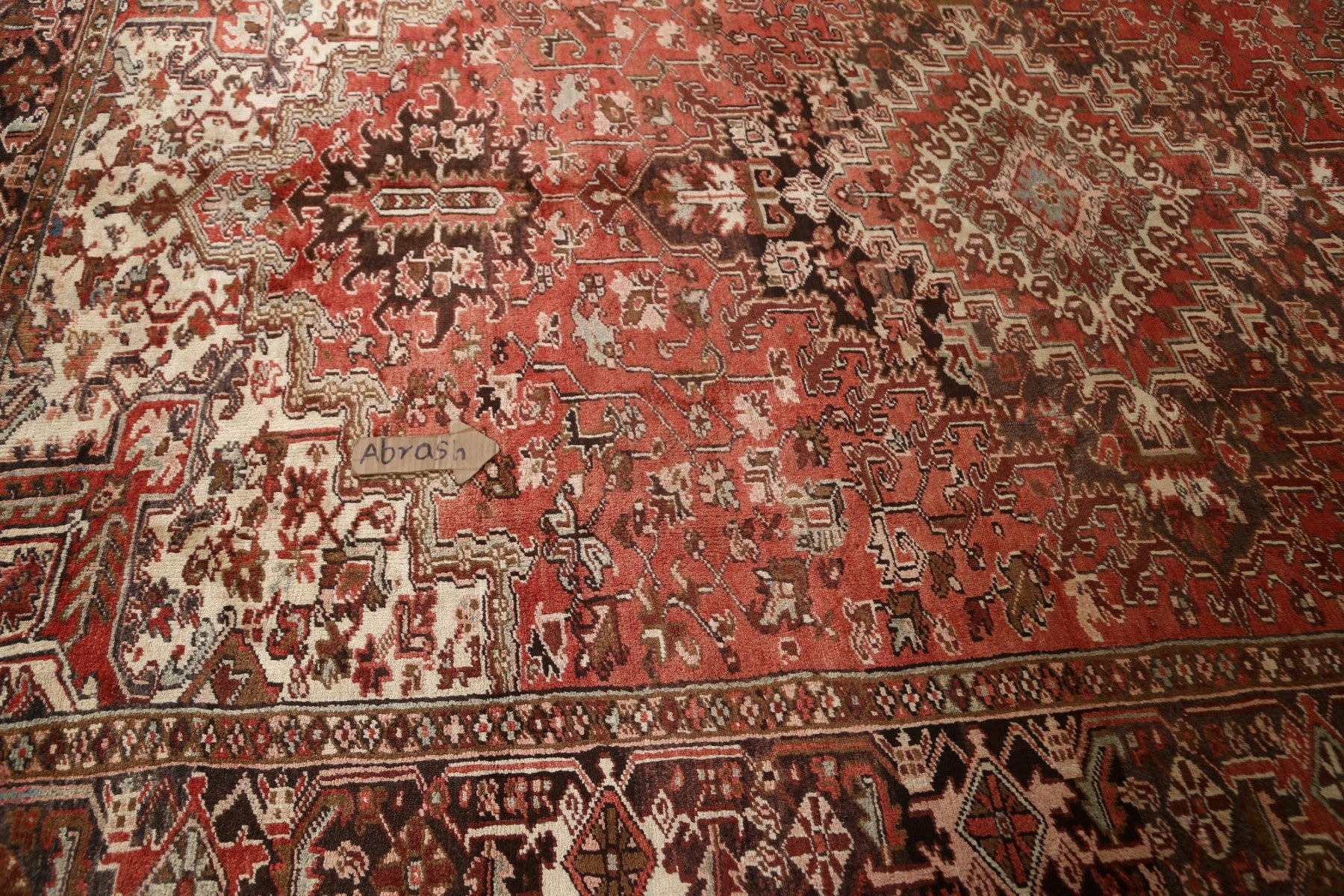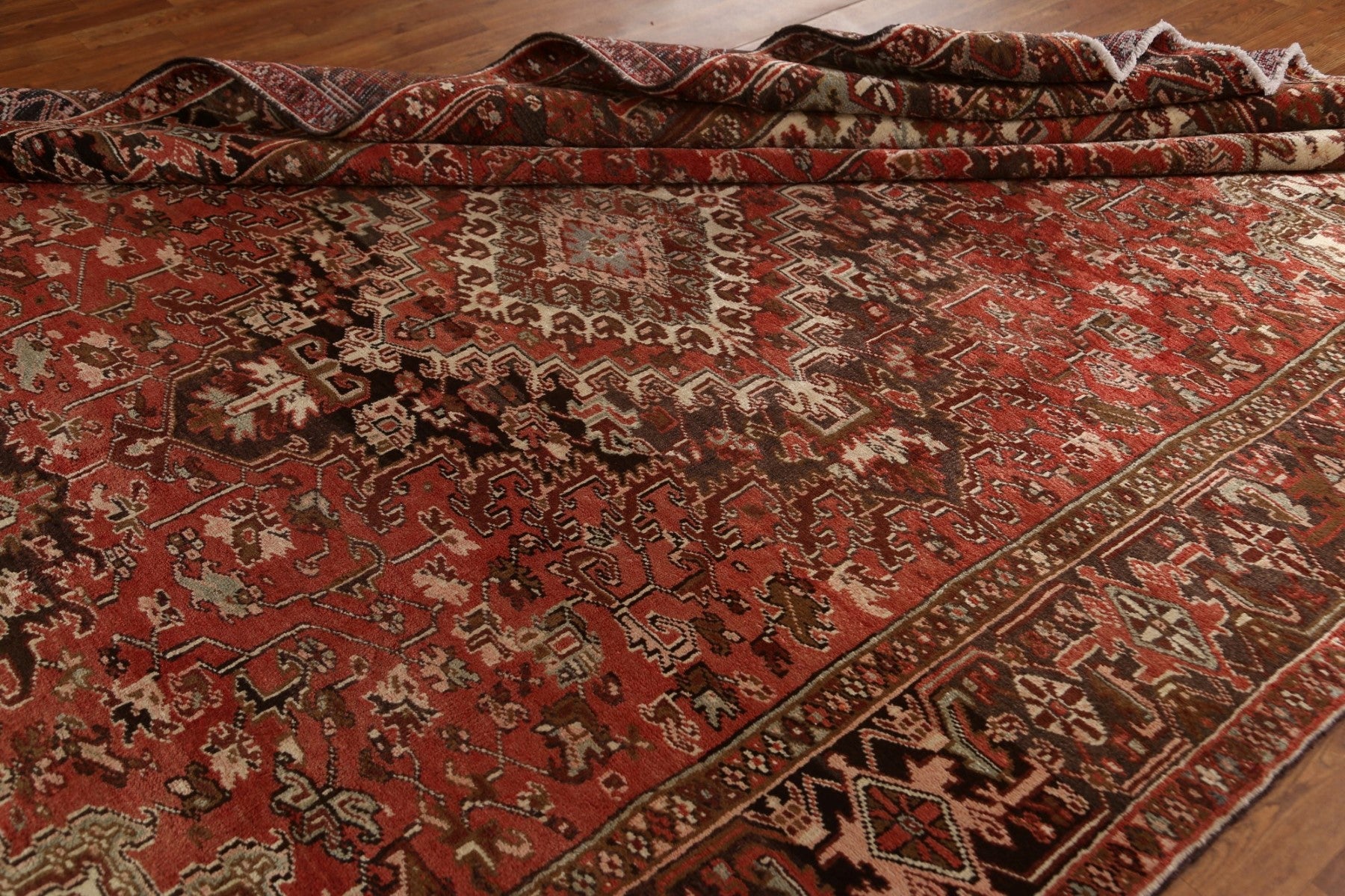 A Beautiful Genuine Persia ( Persia ) Heriz rug is Hand Knotted by skillful weavers in Persia ( Persia ) with 100% Wool Material. This rug is in Very Good (Abrash) condition. dimensions are 11' 9'' X 8' 0'' in foot and 358 X 244 in centimeter. the primary color is Red.