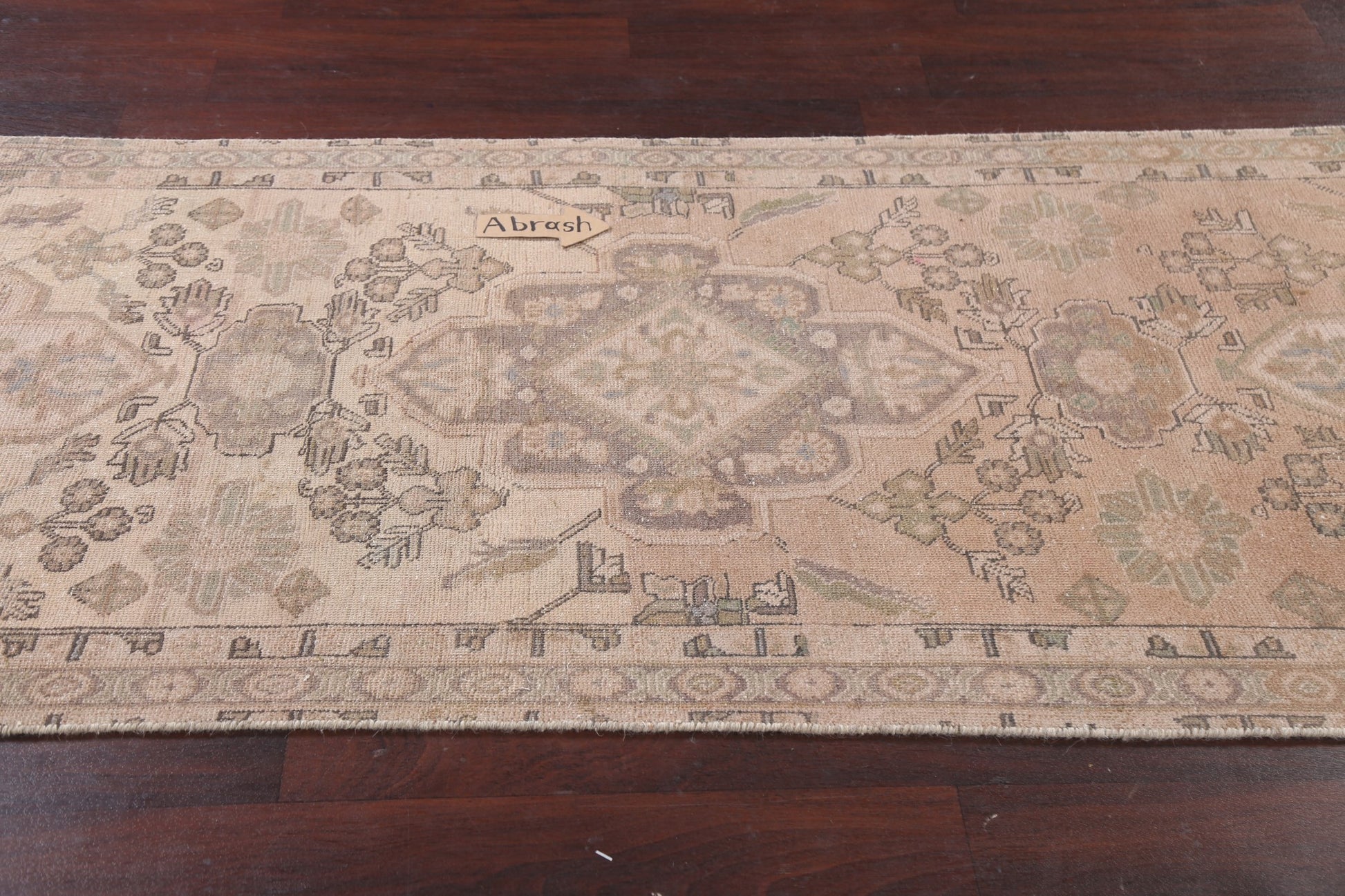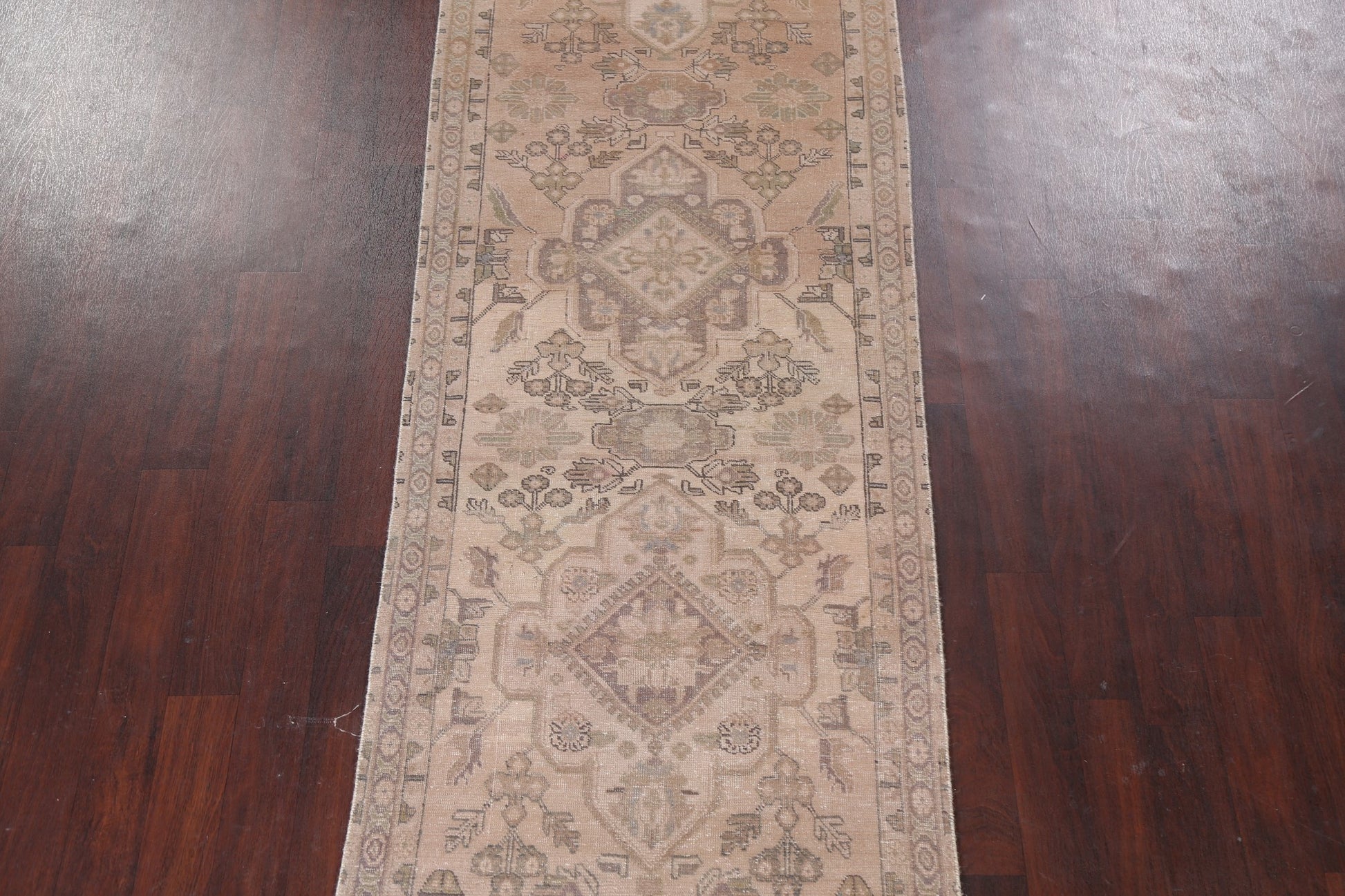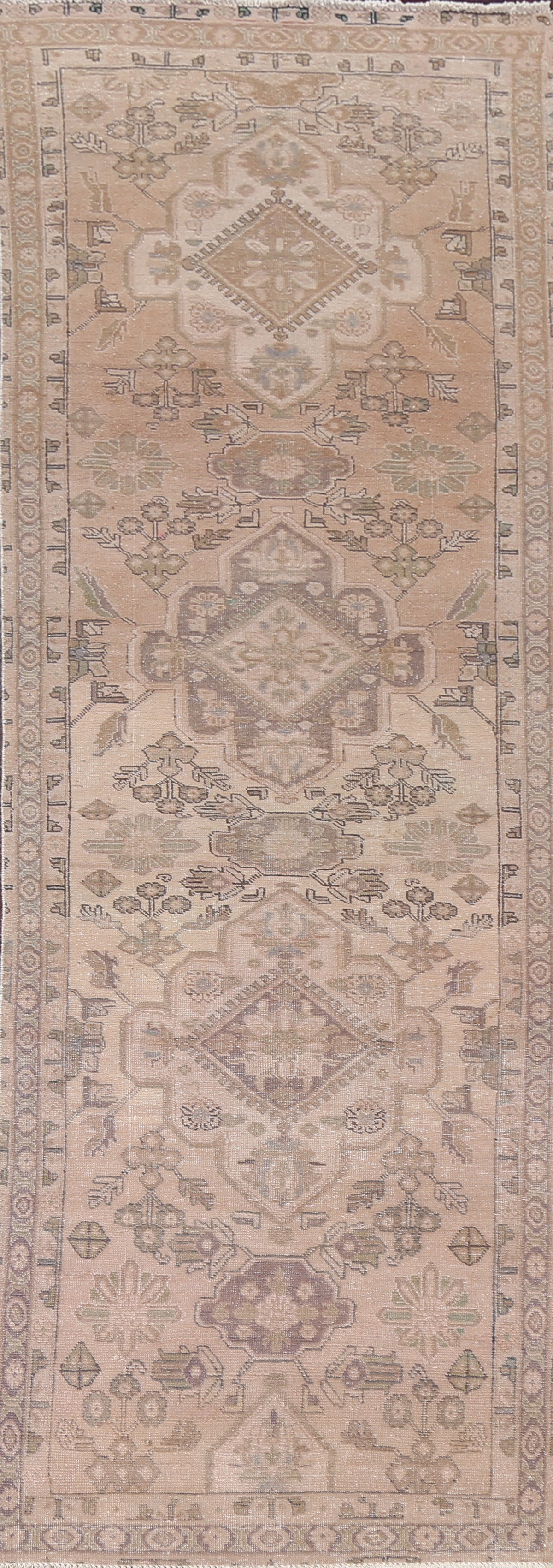 A Beautiful Genuine Persia ( Persia ) Heriz rug is Hand Knotted by skillful weavers in Persia ( Persia ) with 100% Wool Material. This rug is in Very Good (Evenly Low Pile-Abrash) condition. dimensions are 12' 11'' X 3' 6'' in foot and 394 X 107 in centimeter. the primary color is Pink.