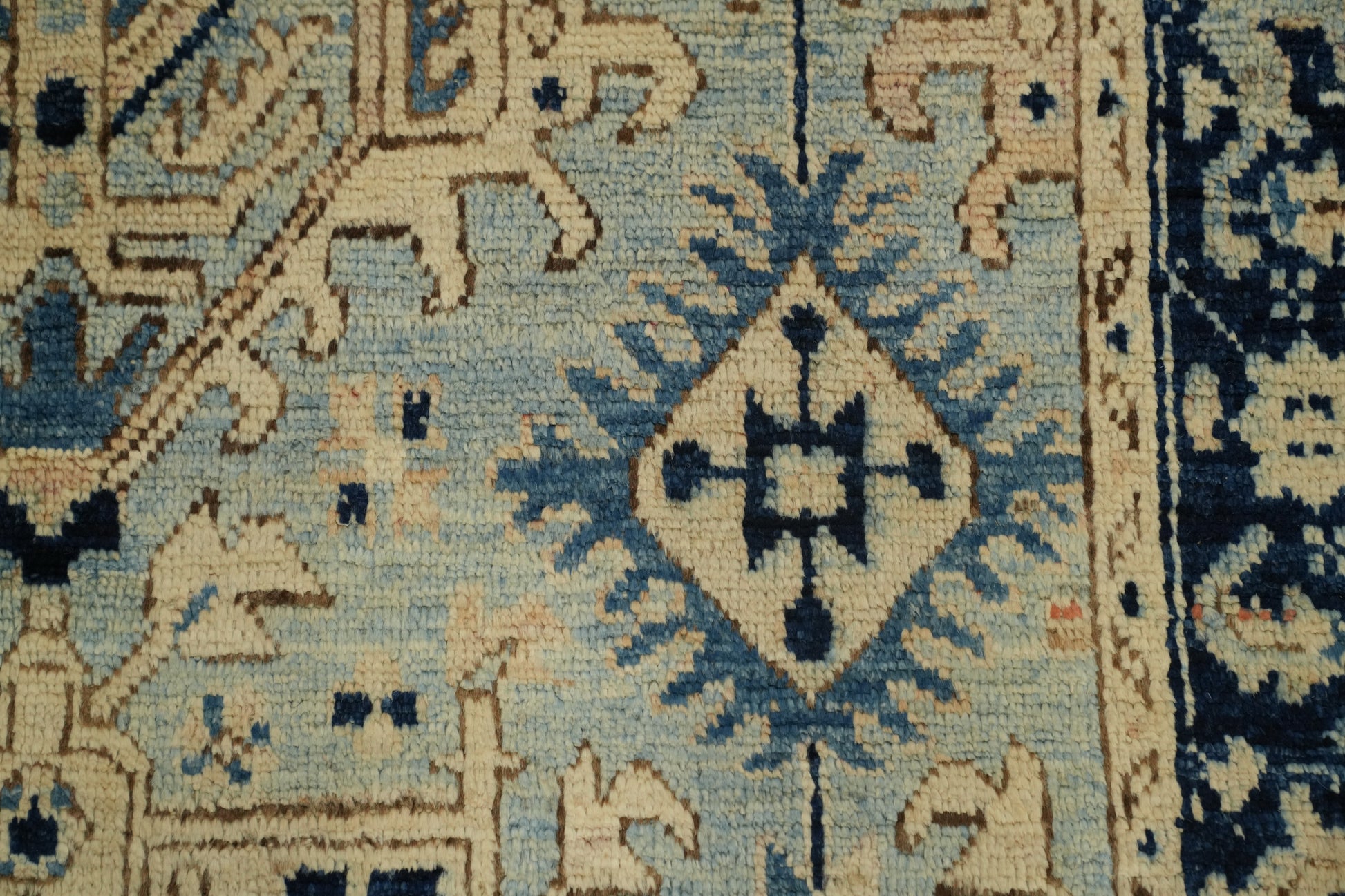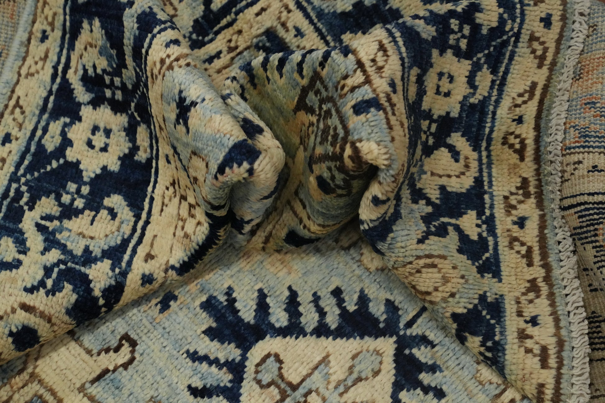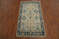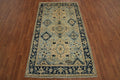 A Beautiful Genuine Pakistan Oushak rug is Hand Knotted by skillful weavers in Pakistan with 100% Wool Material. This rug is in New, First Quality condition. dimensions are 7' 0'' X 3' 11'' in foot and 213 X 119 in centimeter. the primary color is Navy Blue & Blues.