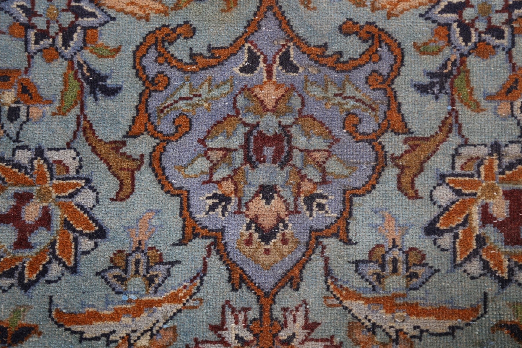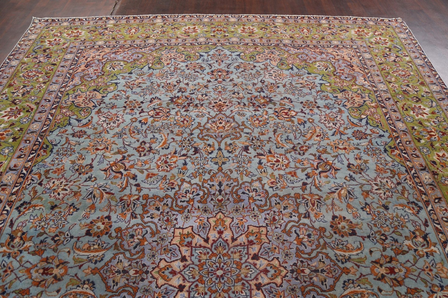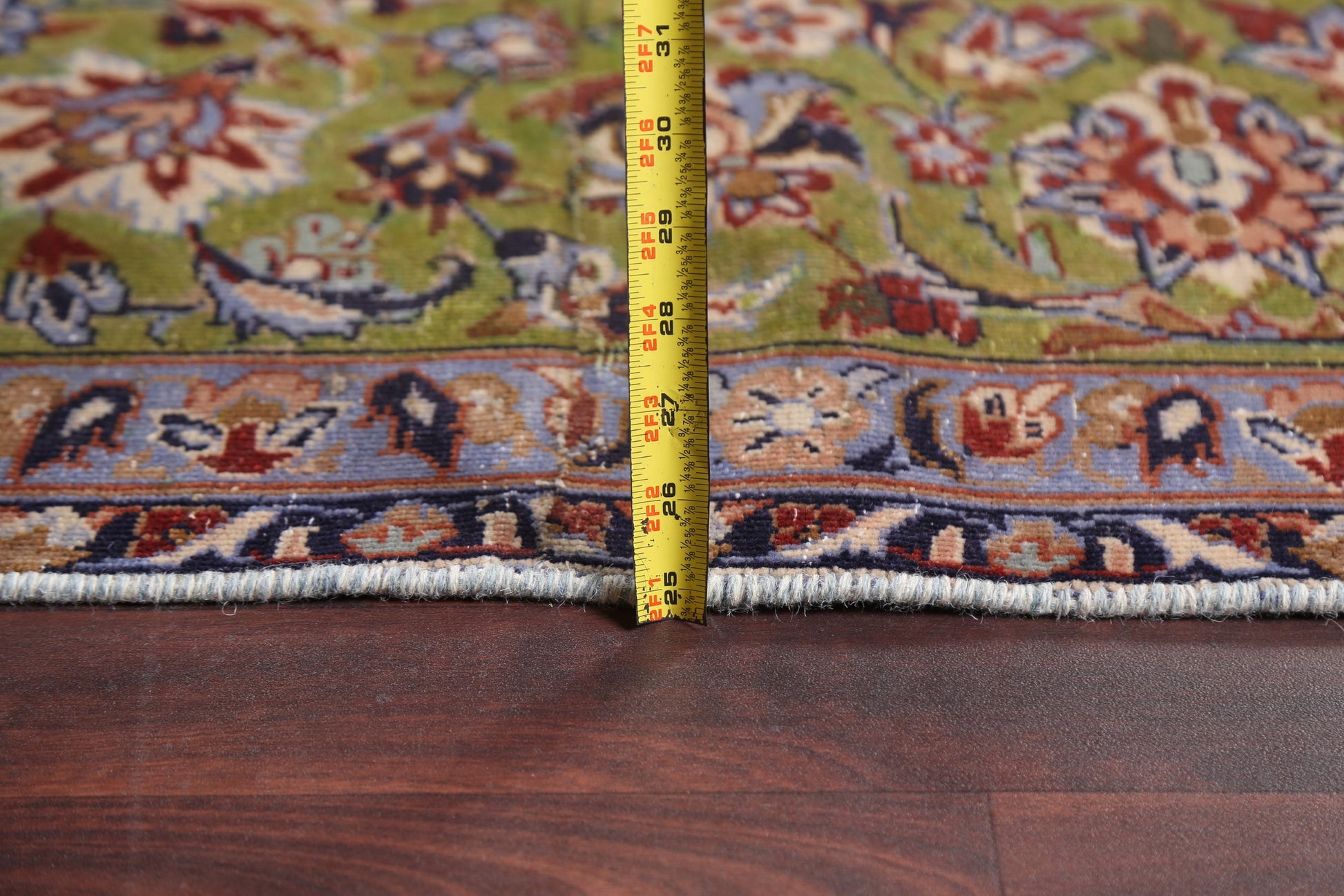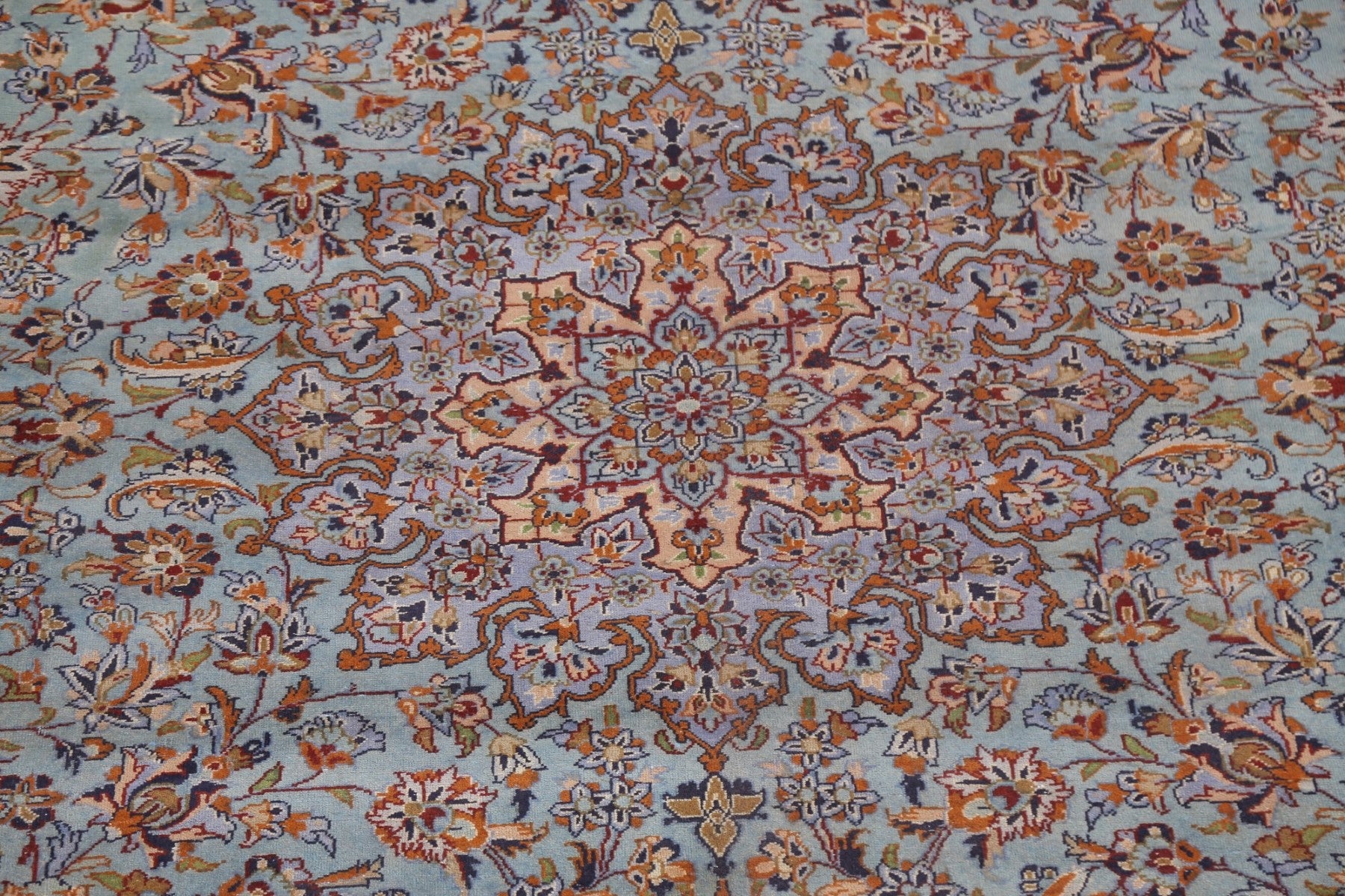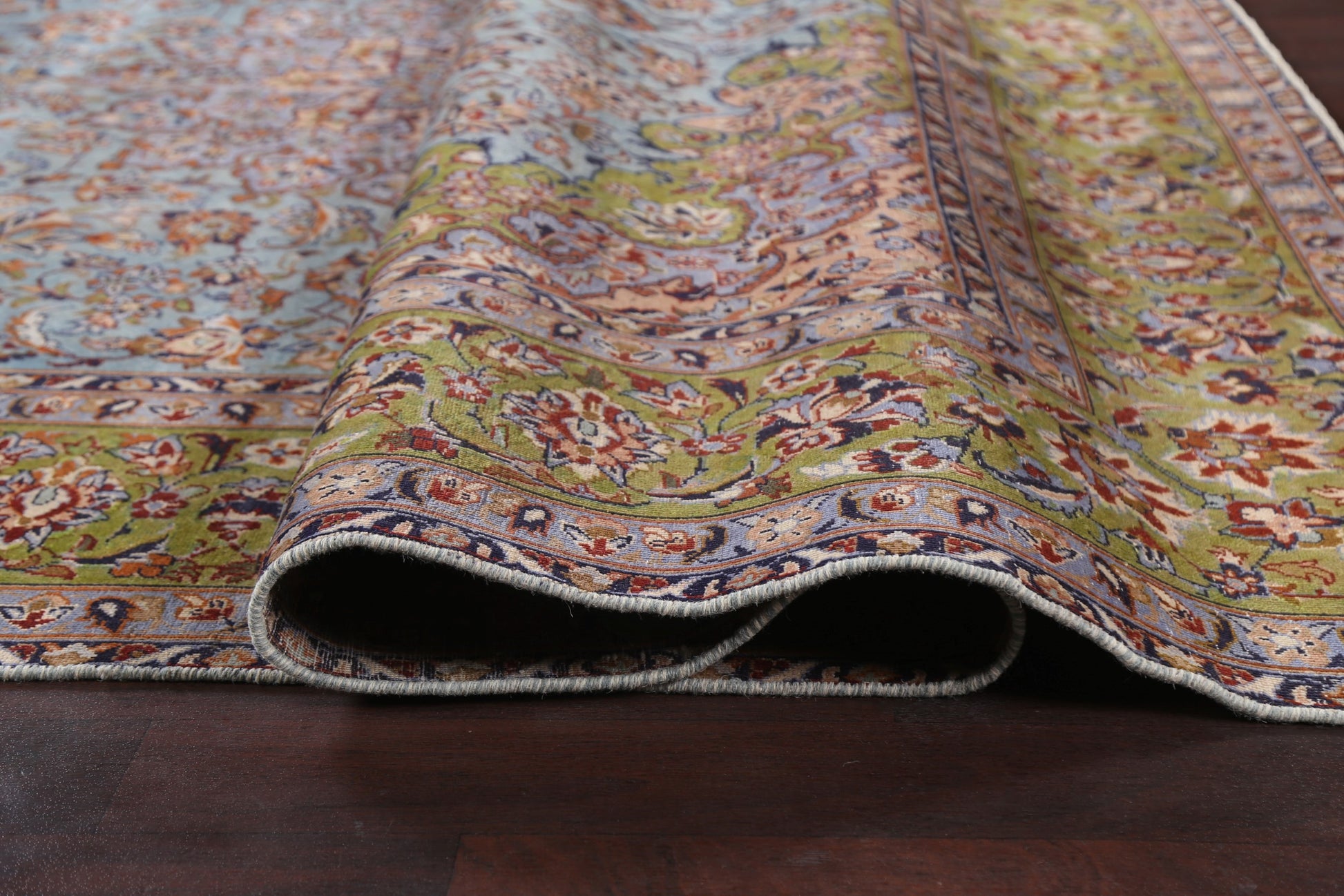 A Beautiful Genuine Persia ( Persia ) Kashan rug is Hand Knotted by skillful weavers in Persia ( Persia ) with 100% Wool Material. This rug is in Very Good (Evenly Low Pile) condition. dimensions are 12' 11'' X 9' 5'' in foot and 394 X 287 in centimeter. the primary color is Navy Blue & Blues.
