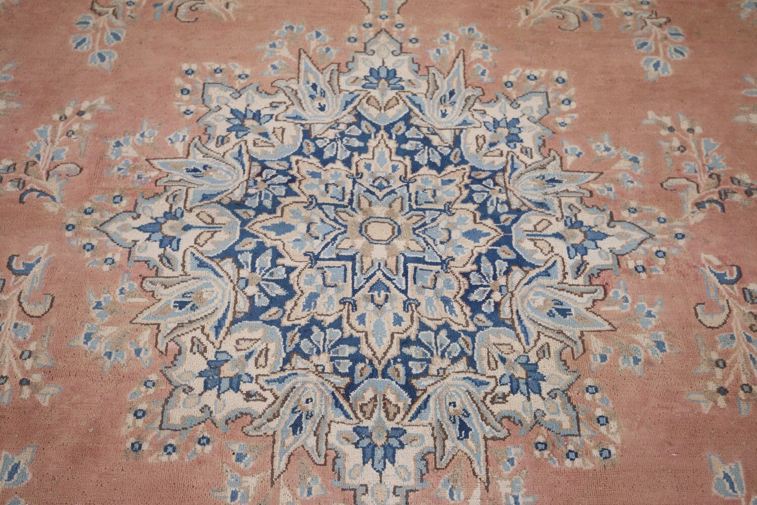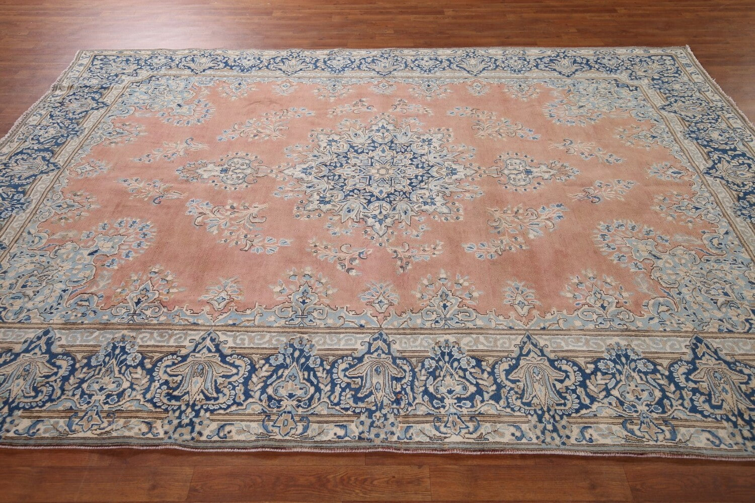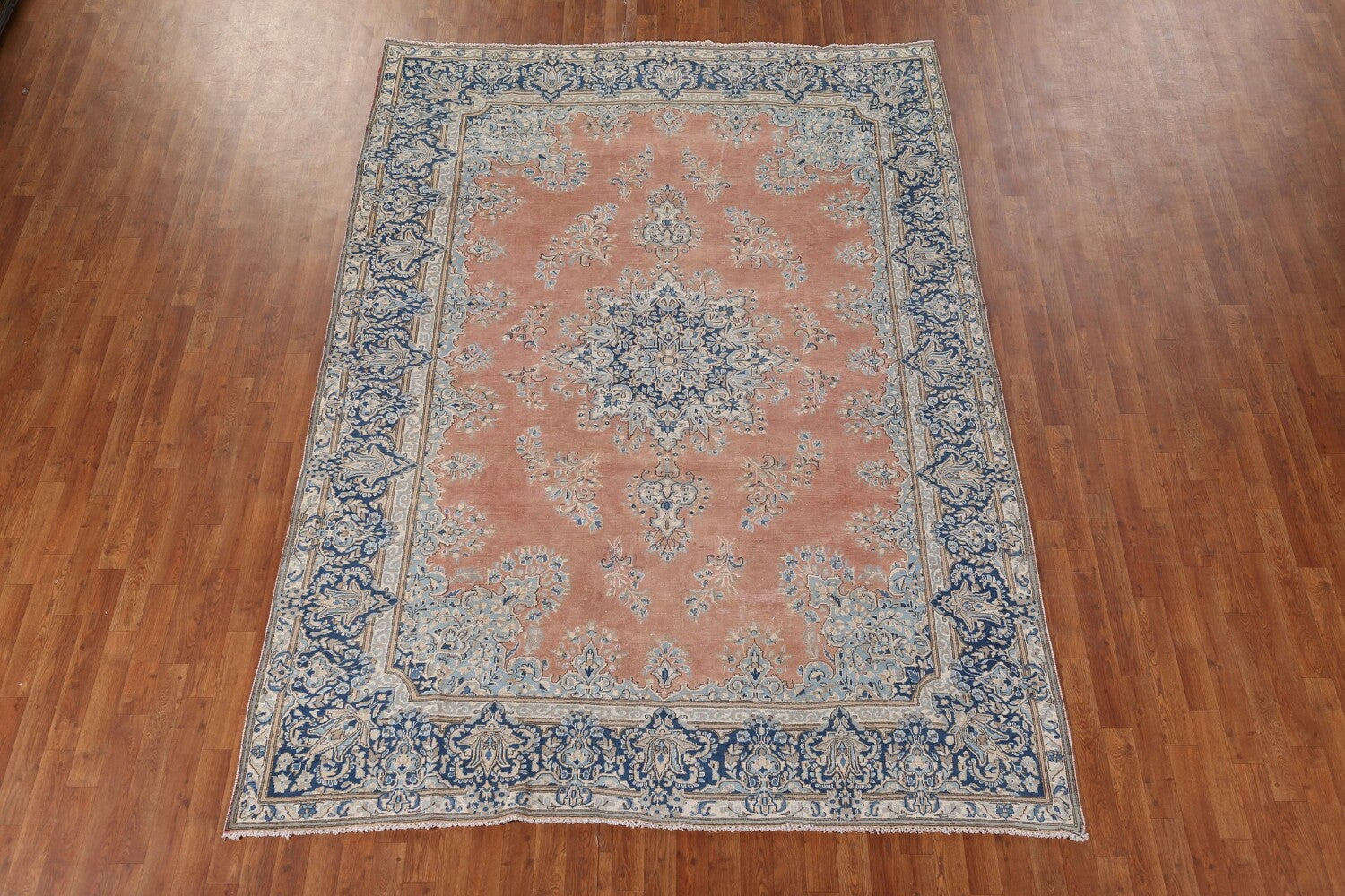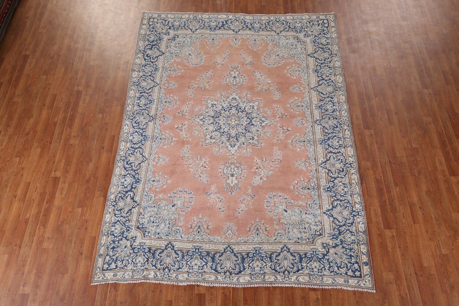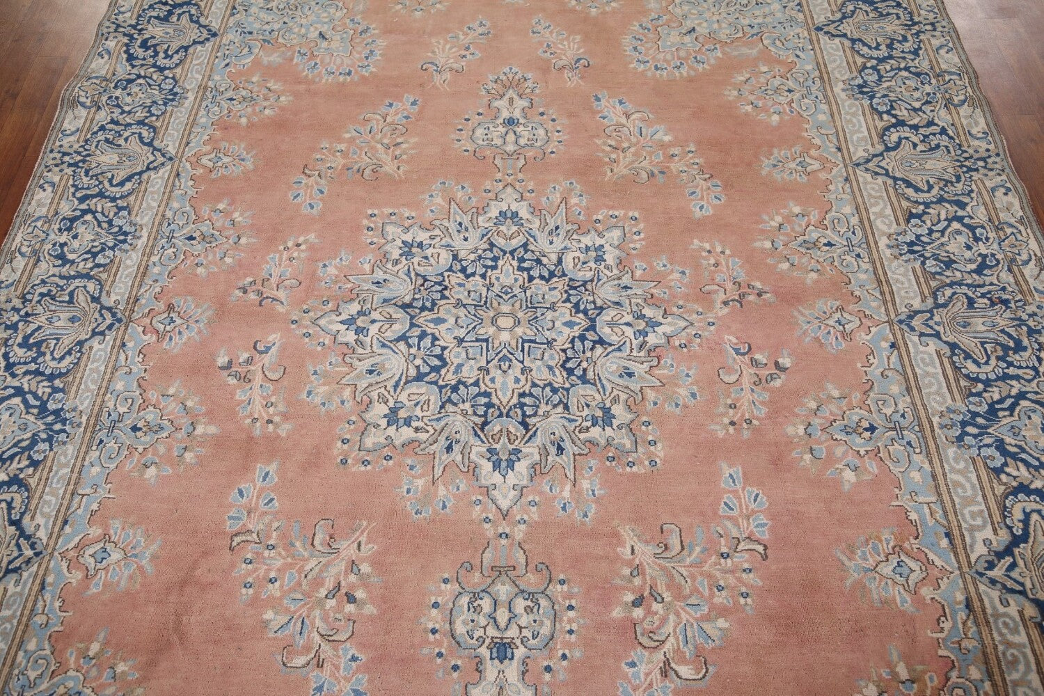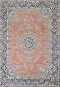 A Beautiful Genuine Persia ( Persia ) Kerman rug is Hand Knotted by skillful weavers in Persia ( Persia ) with 100% Wool Material. This rug is in Very Good (Evenly Low Pile) condition. dimensions are 10' 2'' X 7' 4'' in foot and 310 X 224 in centimeter. the primary color is Peach.