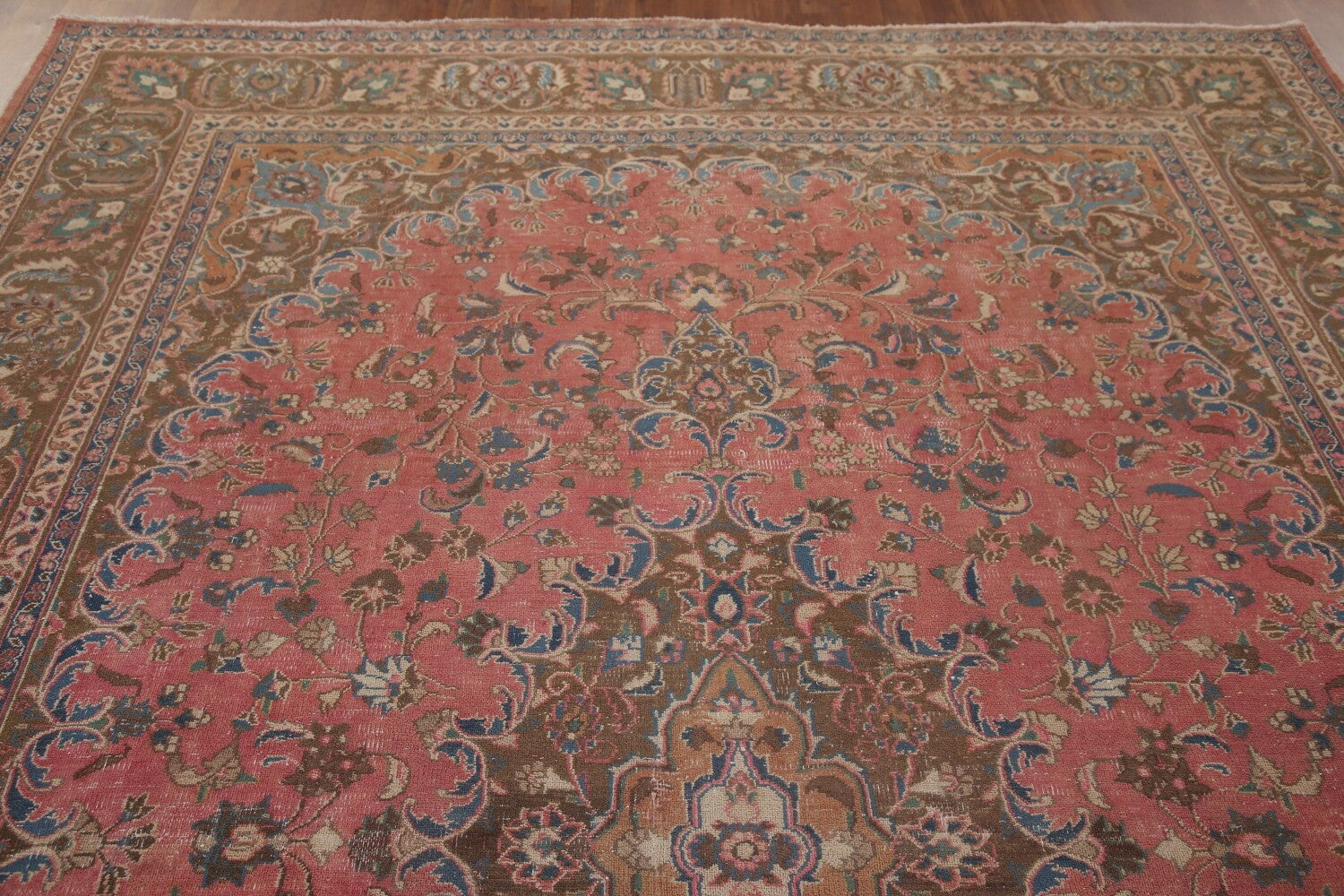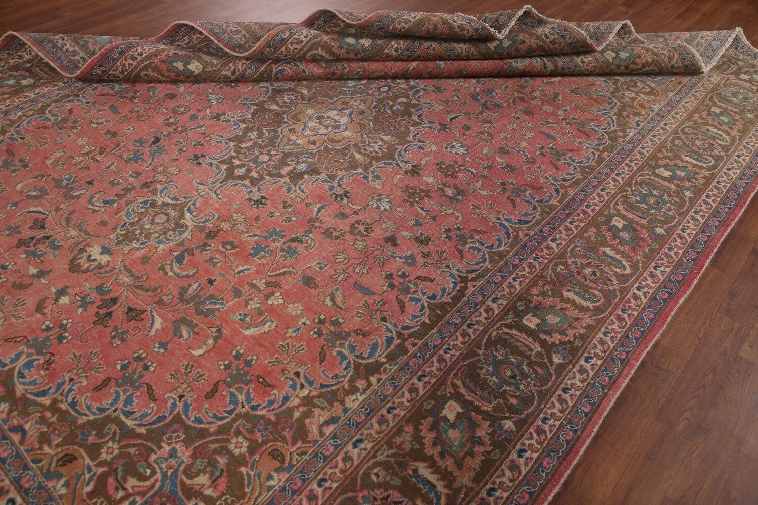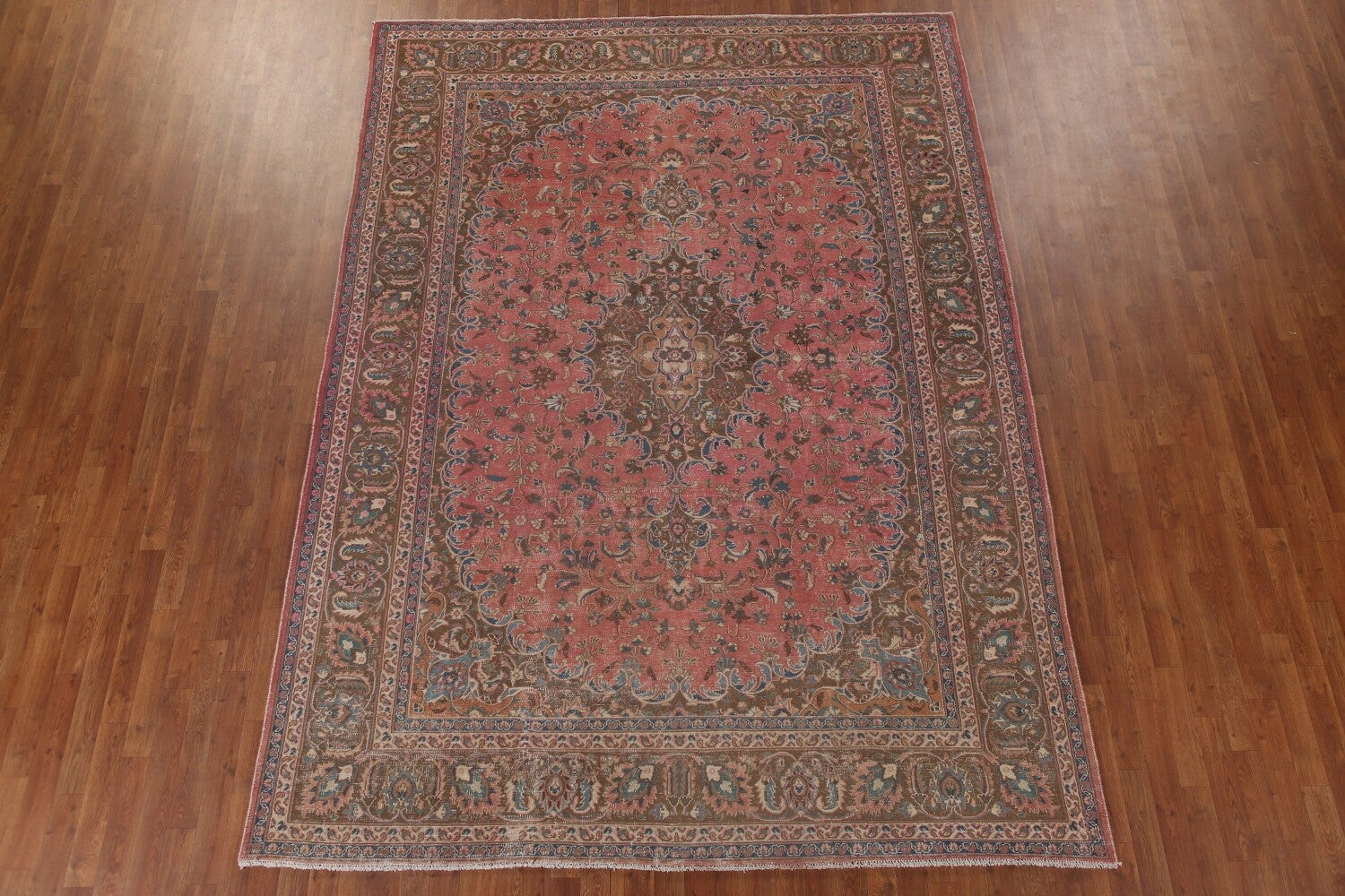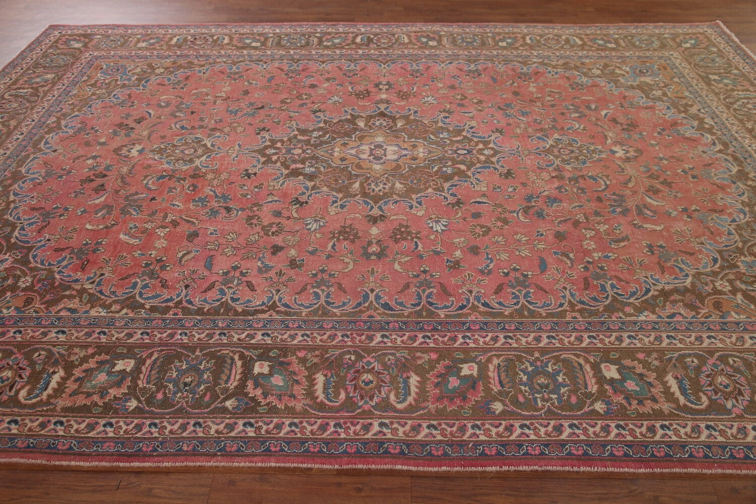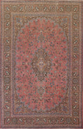 A Beautiful Genuine Persia ( Persia ) Mashad rug is Hand Knotted by skillful weavers in Persia ( Persia ) with 100% Wool Material. This rug is in Very Good (Evenly Low Pile) condition. dimensions are 10' 10'' X 7' 11'' in foot and 330 X 241 in centimeter. the primary color is Pink.