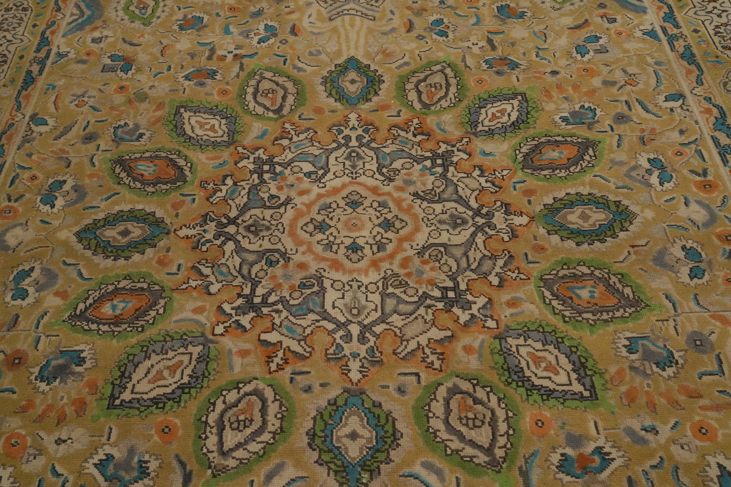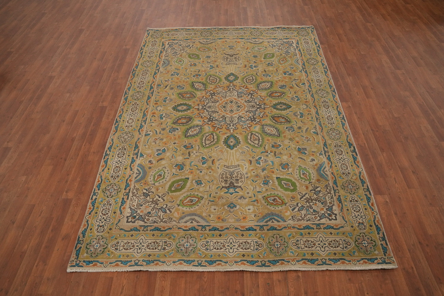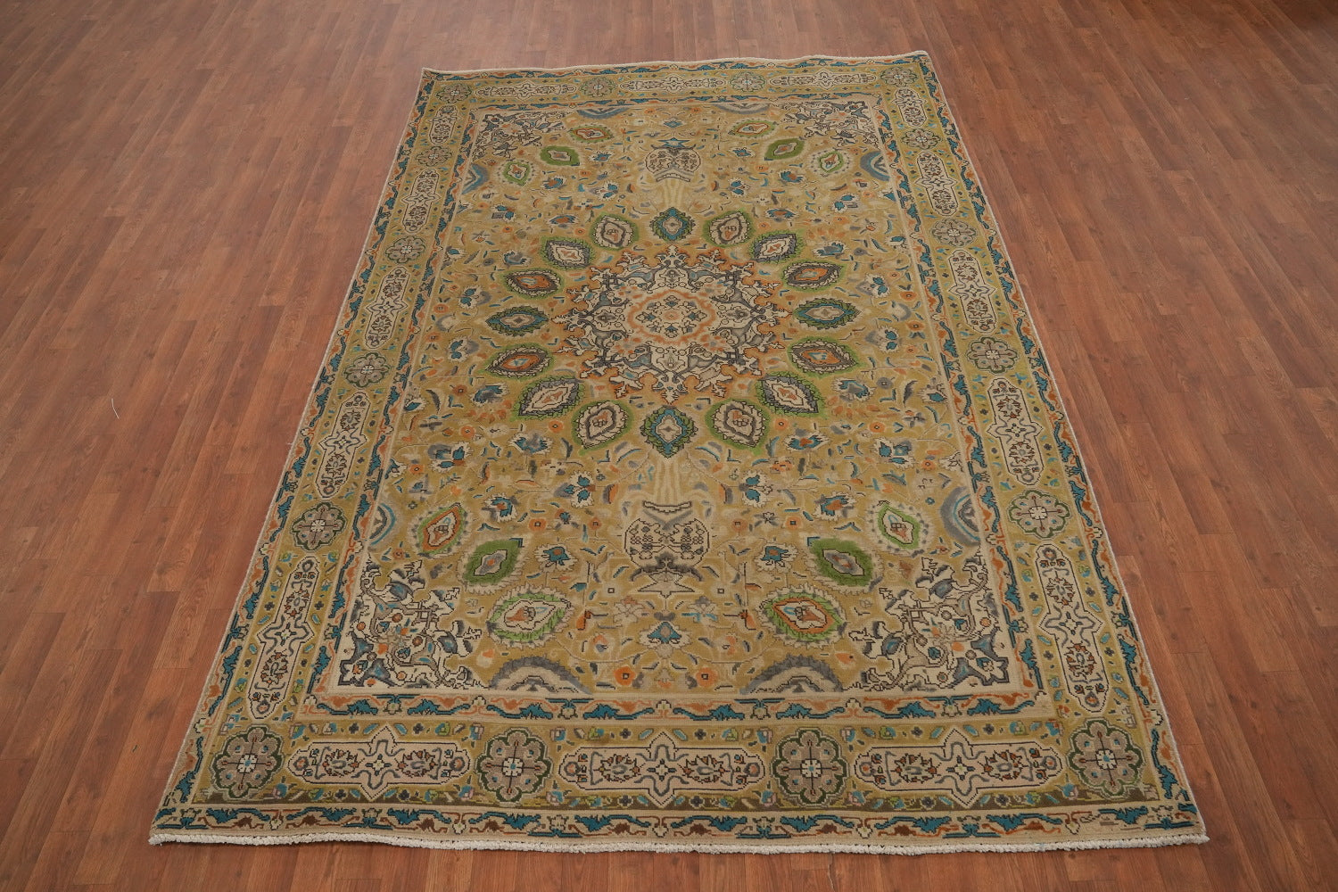 A Beautiful Genuine Persia ( Persia ) Tabriz rug is Hand Knotted by skillful weavers in Persia ( Persia ) with 100% Wool Material. This rug is in Very Good (Evenly Low Pile) condition. dimensions are 9' 7'' X 6' 5'' in foot and 292 X 196 in centimeter. the primary color is Yellow & Gold.