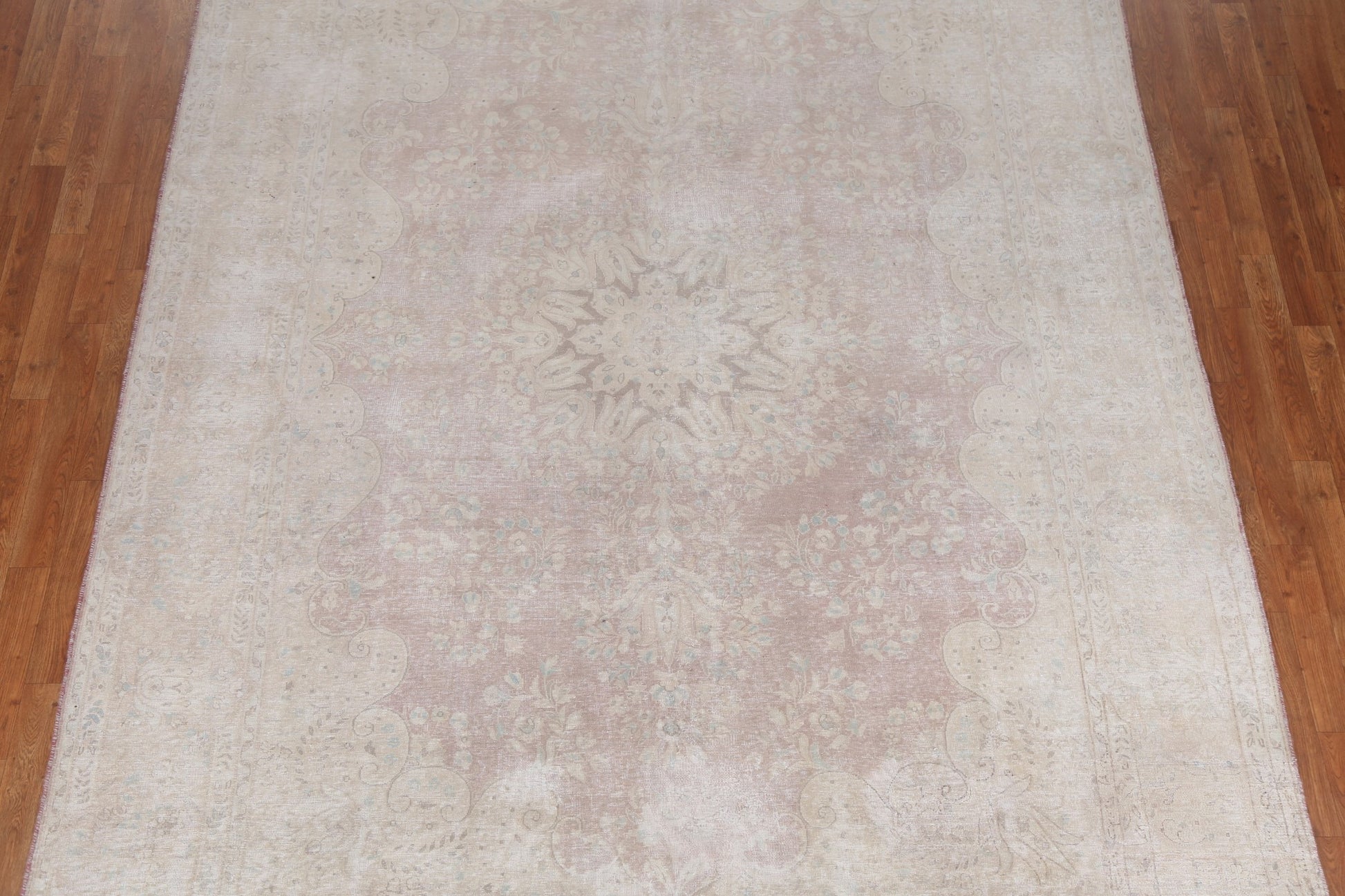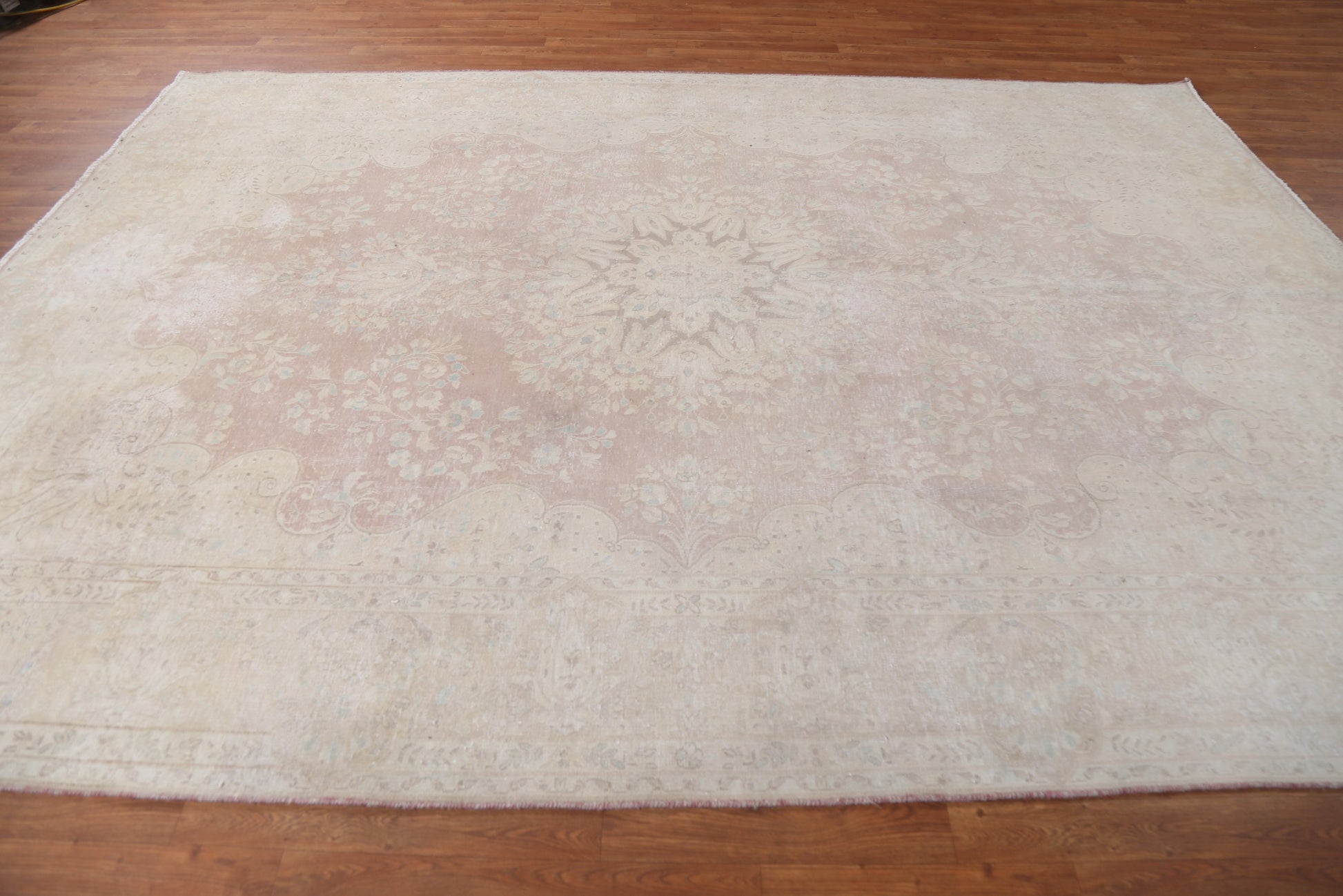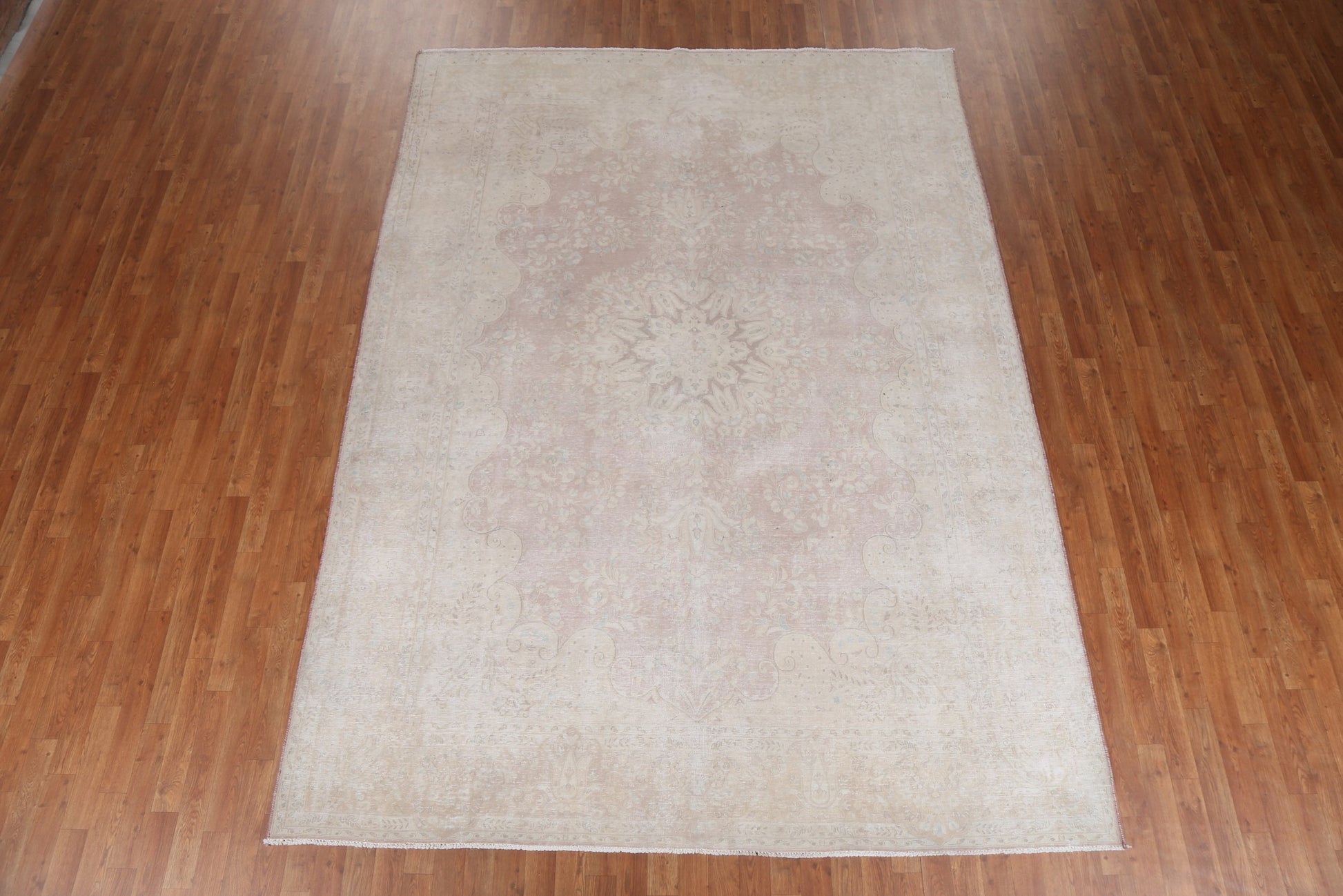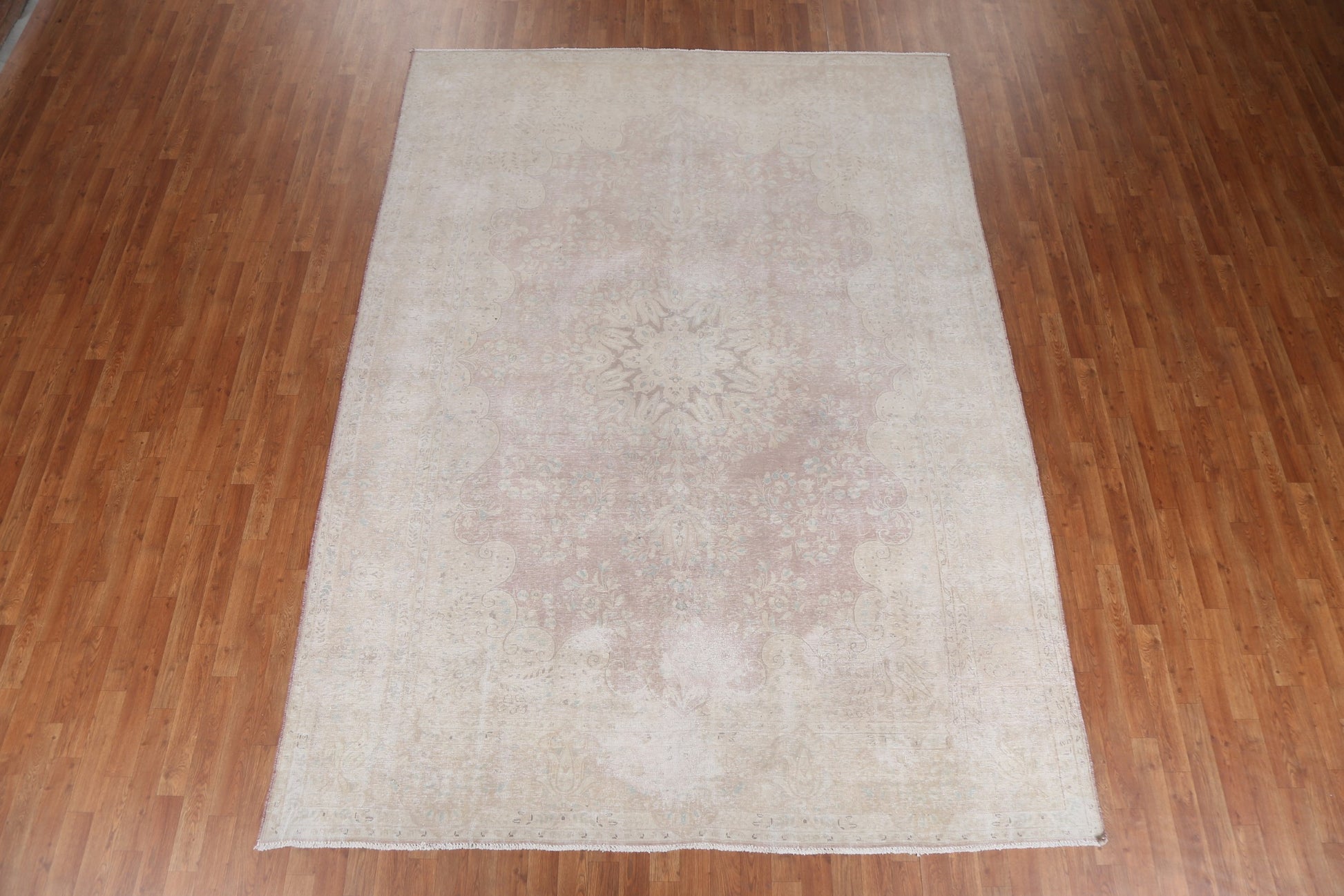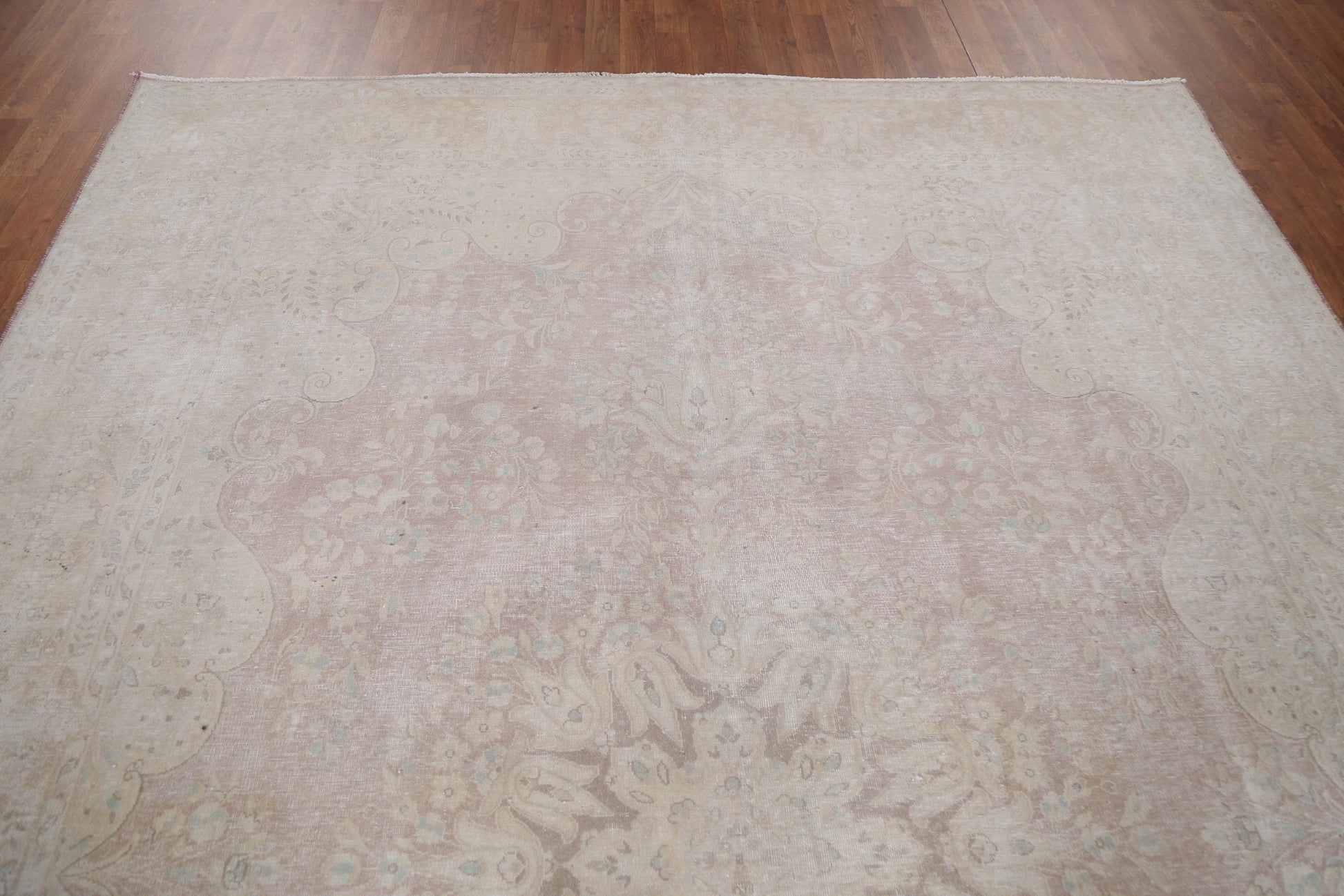 A Beautiful Genuine Persia ( Persia ) Kerman rug is Hand Knotted by skillful weavers in Persia ( Persia ) with 100% Wool Material. This rug is in Very Good (Evenly Low Pile-Repair) condition. dimensions are 10' 8'' X 7' 10'' in foot and 325 X 239 in centimeter. the primary color is Beige & Ivories.
