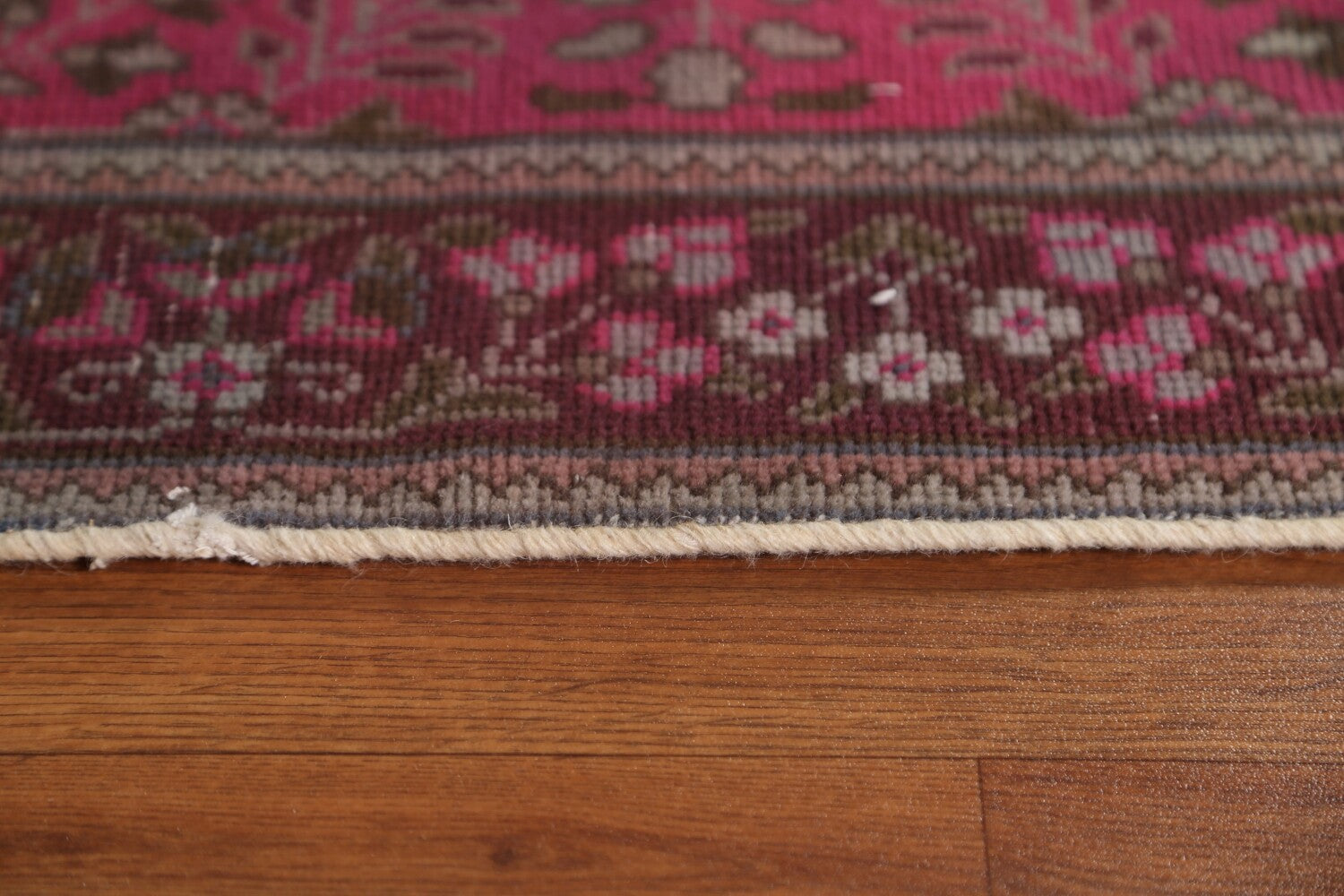 A Beautiful Genuine Persia ( Persia ) Tabriz rug is Hand Knotted by skillful weavers in Persia ( Persia ) with 100% Wool Material. This rug is in Very Good (Low Pile) condition. dimensions are 12' 9'' X 3' 3'' in foot and 389 X 99 in centimeter. the primary color is Pink.