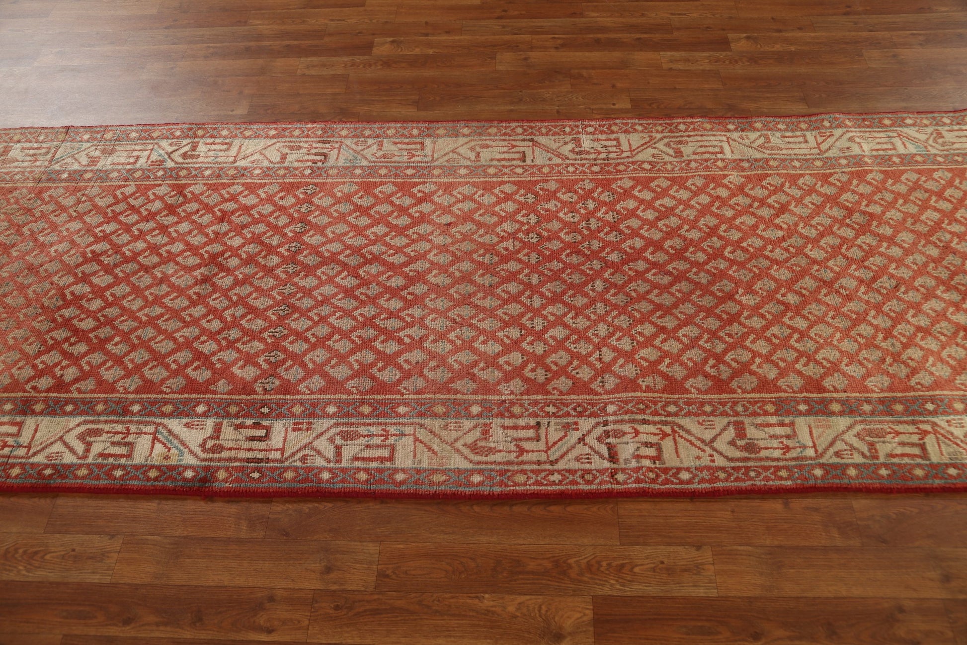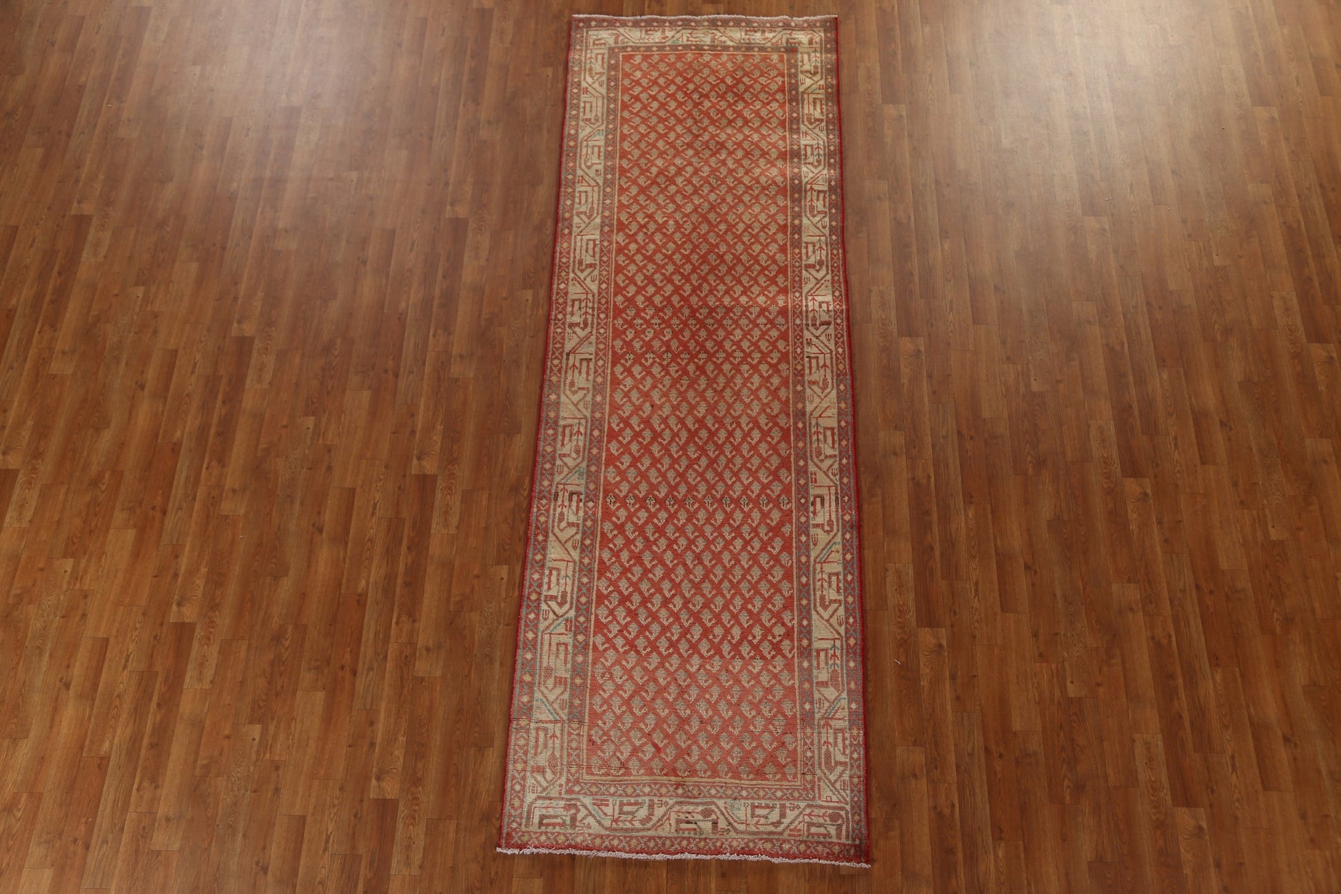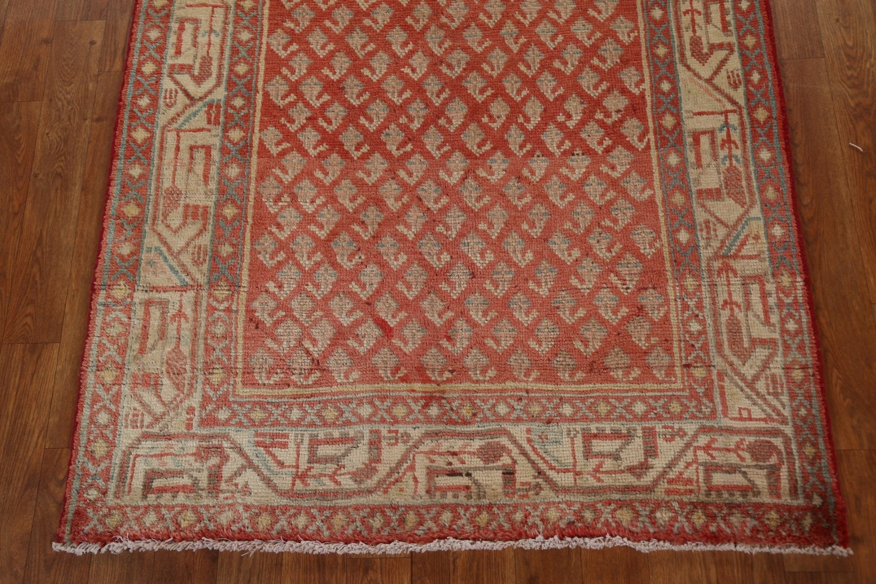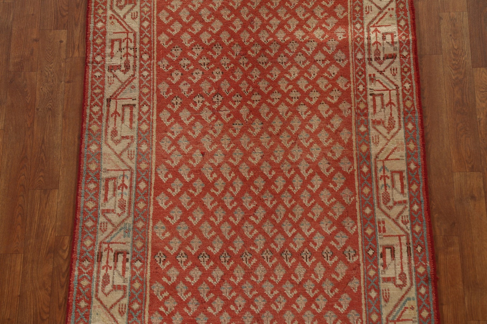A Beautiful Genuine Persia ( Persia ) Botemir rug is Hand Knotted by skillful weavers in Persia ( Persia ) with 100% Wool Material. This rug is in Very Good (Abrash) condition. dimensions are 10' 1'' X 3' 4'' in foot and 307 X 102 in centimeter. the primary color is Red.