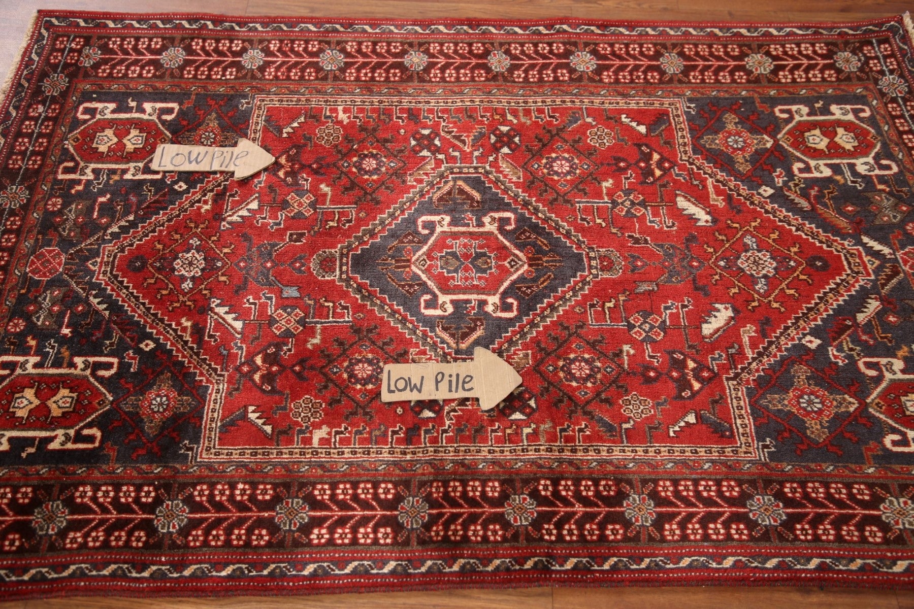 A Beautiful Genuine Persia ( Persia ) Shiraz rug is Hand Knotted by skillful weavers in Persia ( Persia ) with 100% Wool Material. This rug is in Very Good (Low Pile) condition. dimensions are 5' 2'' X 3' 6'' in foot and 157 X 107 in centimeter. the primary color is Red.