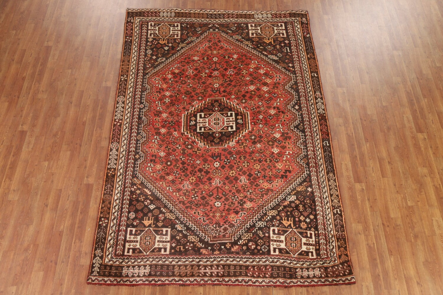 A Beautiful Genuine Persia ( Persia ) Shiraz rug is Hand Knotted by skillful weavers in Persia ( Persia ) with 100% Wool Material. This rug is in Very Good (Low Pile) condition. dimensions are 9' 4'' X 6' 4'' in foot and 284 X 193 in centimeter. the primary color is Red.