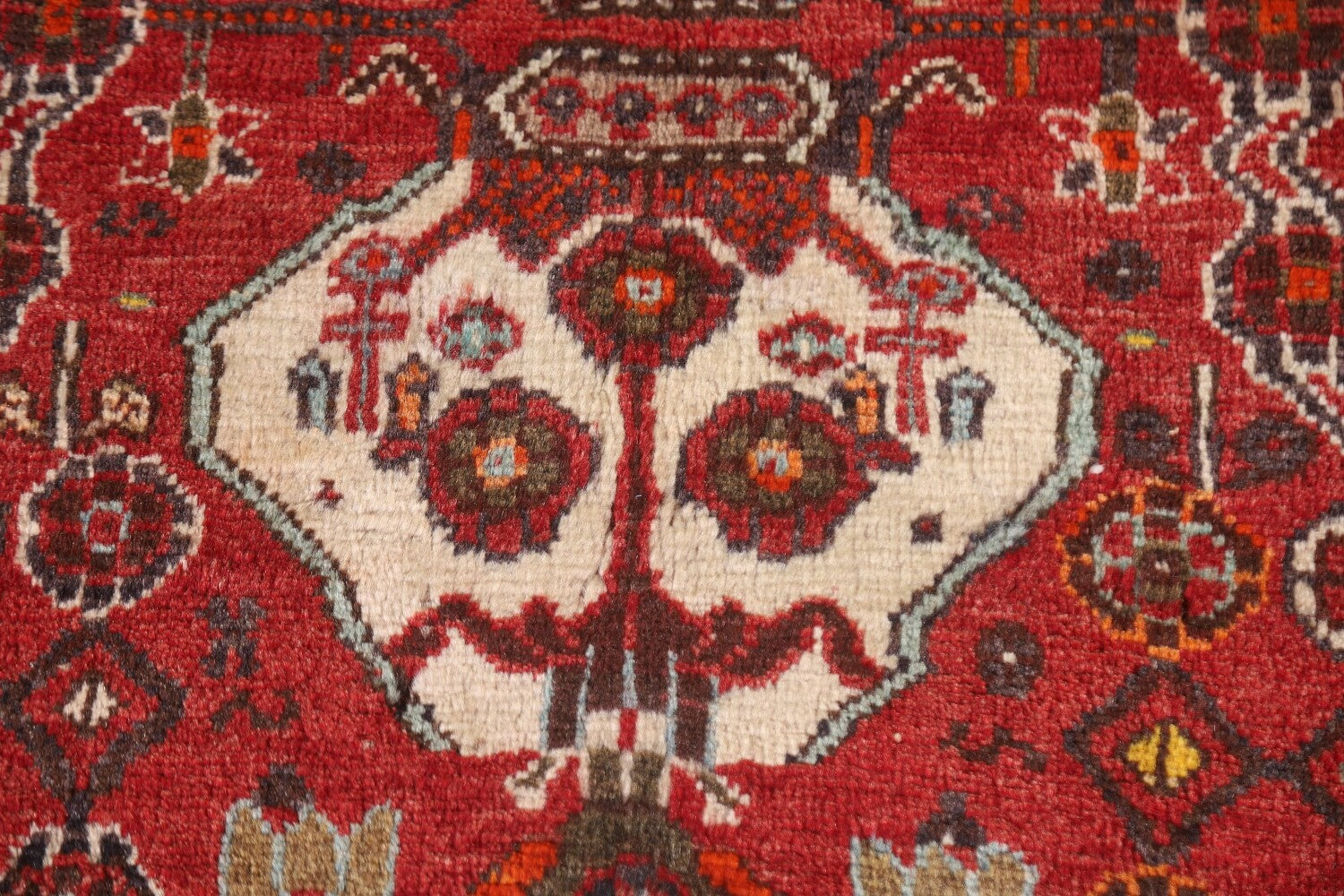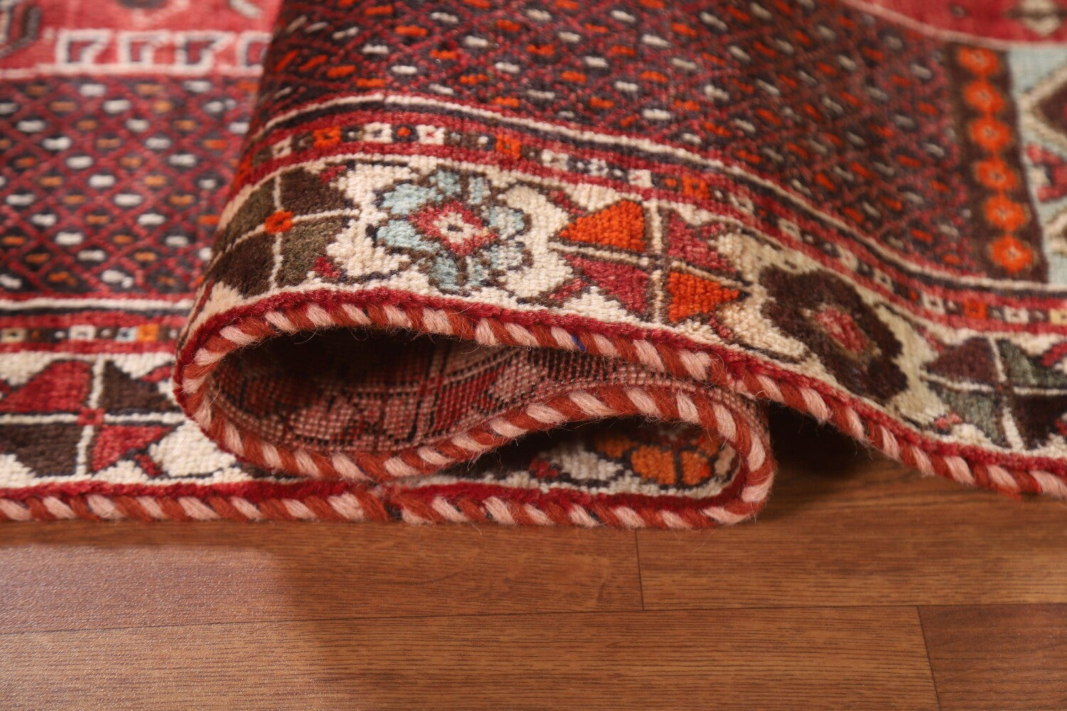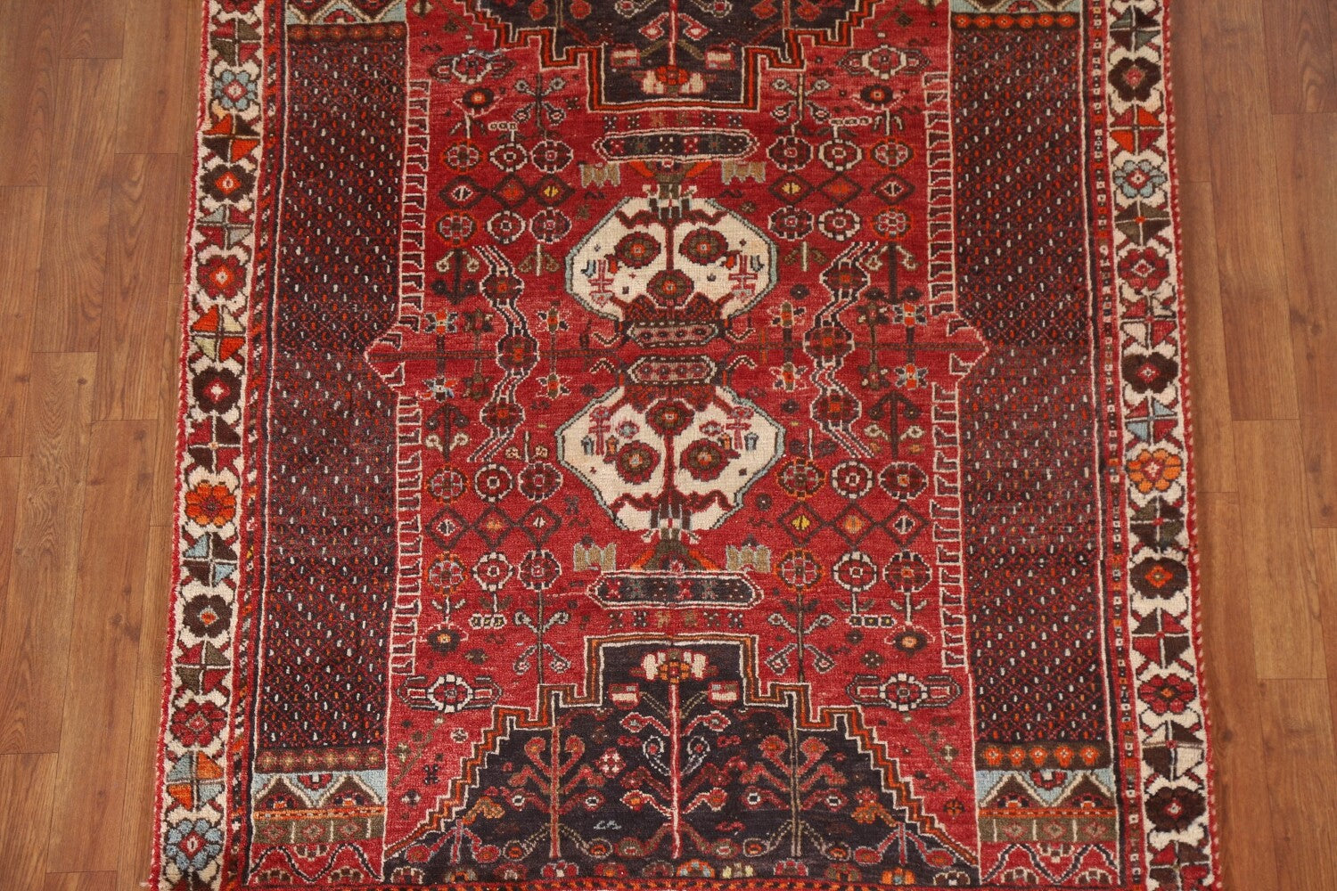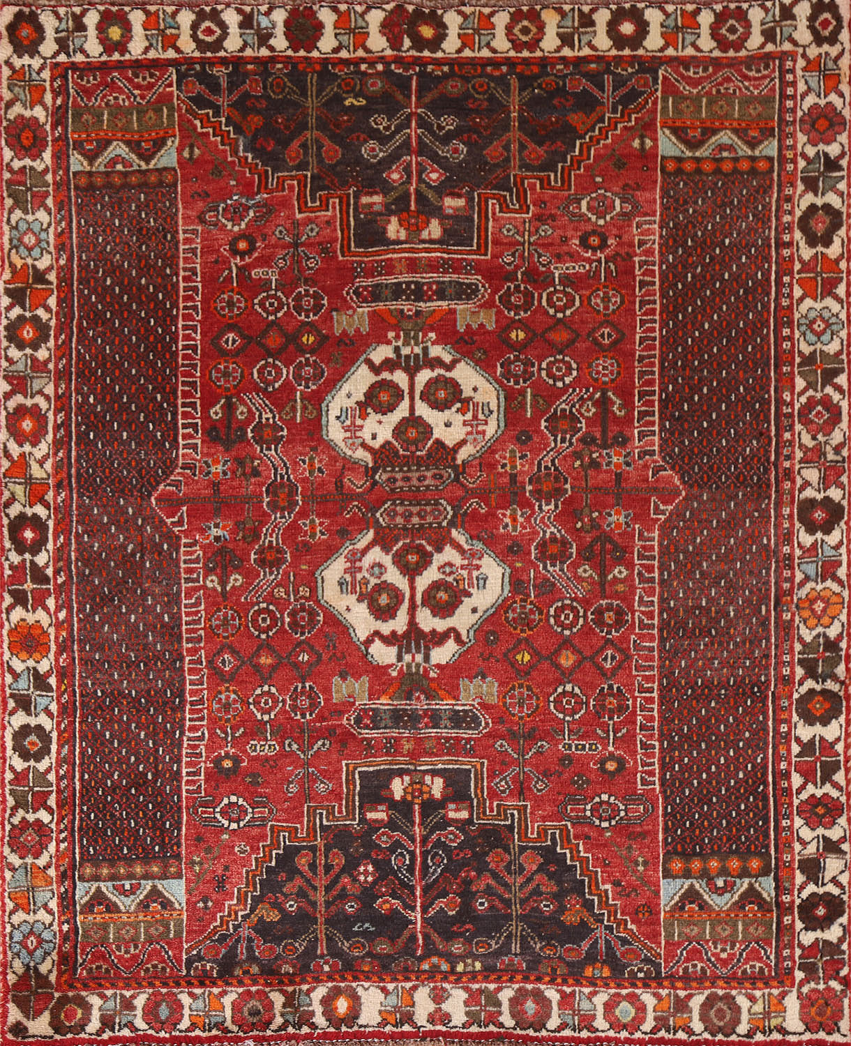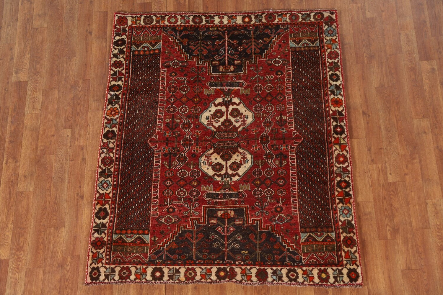 A Beautiful Genuine Persia ( Persia ) Shiraz rug is Hand Knotted by skillful weavers in Persia ( Persia ) with 100% Wool Material. This rug is in Very Good condition. dimensions are 5' 1'' X 4' 3'' in foot and 155 X 130 in centimeter. the primary color is Red.
