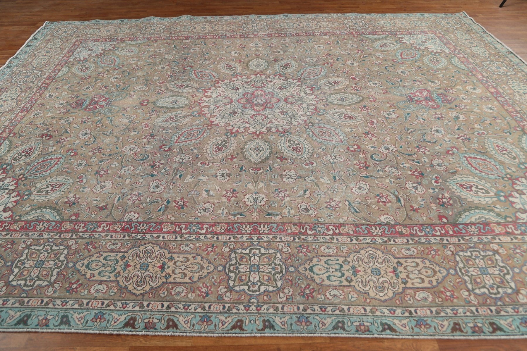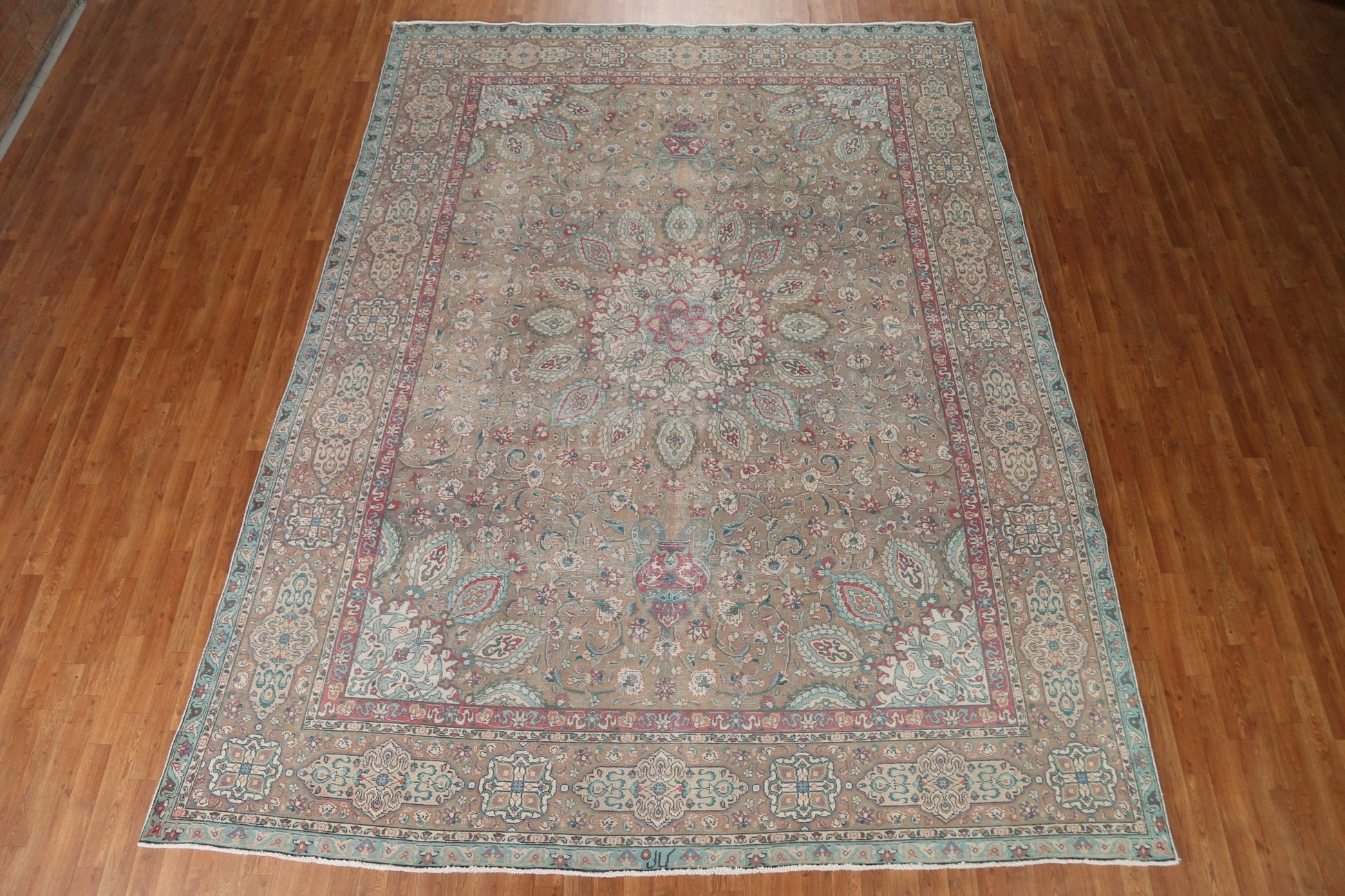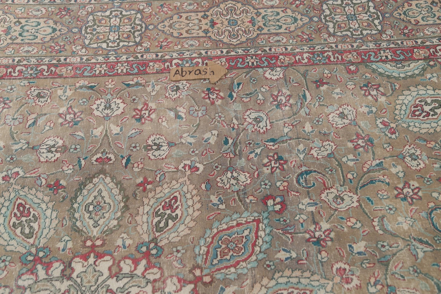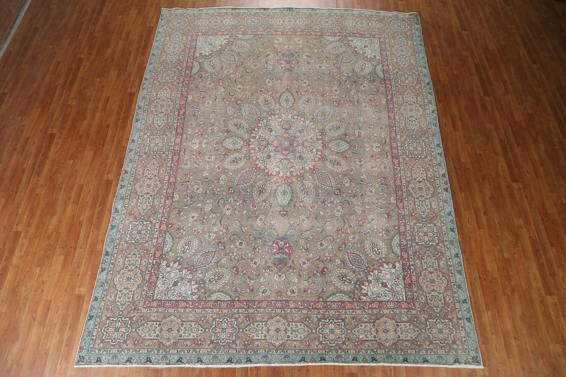 A Beautiful Genuine Persia ( Persia ) Tabriz rug is Hand Knotted by skillful weavers in Persia ( Persia ) with 100% Wool Material. This rug is in Very Good (Low Pile-Abrash) condition. dimensions are 12' 5'' X 9' 6'' in foot and 378 X 290 in centimeter. the primary color is Brown.