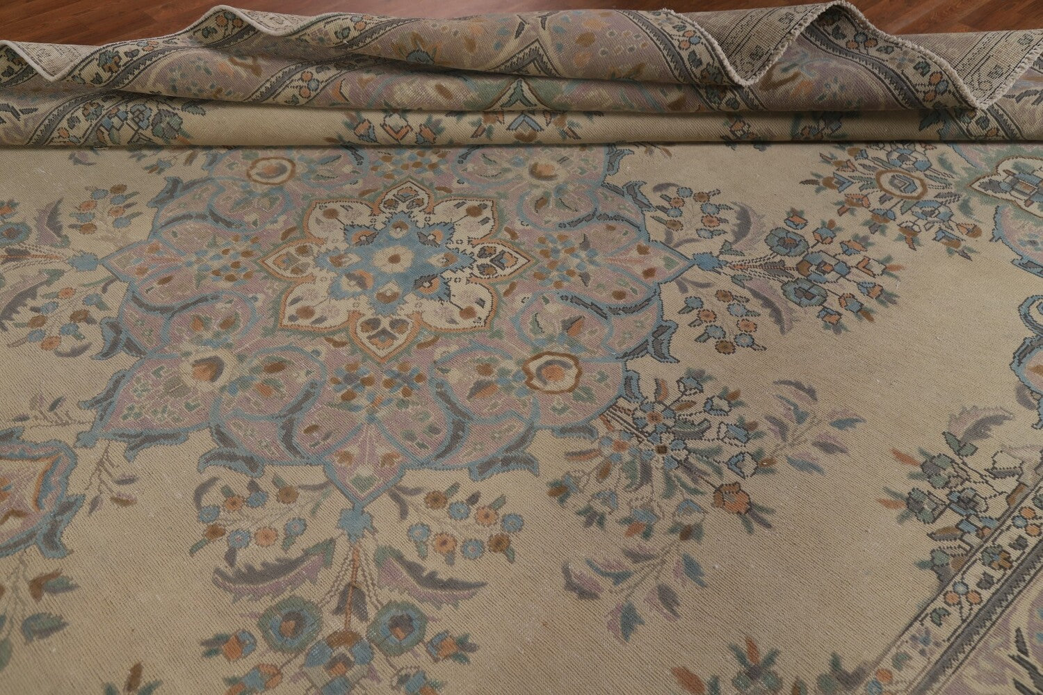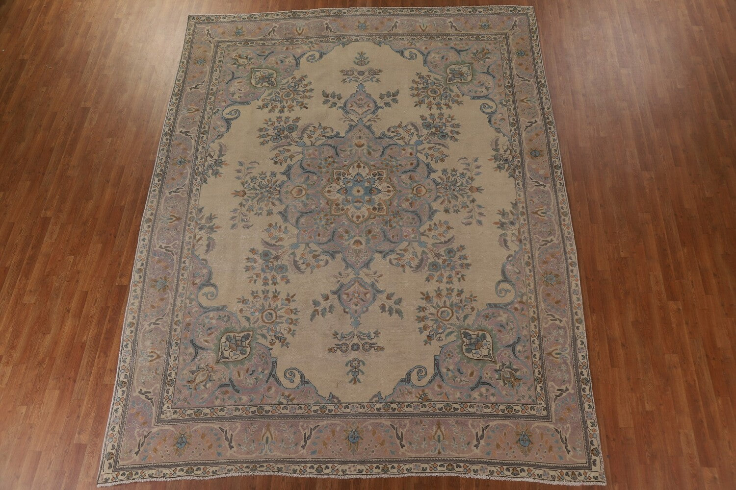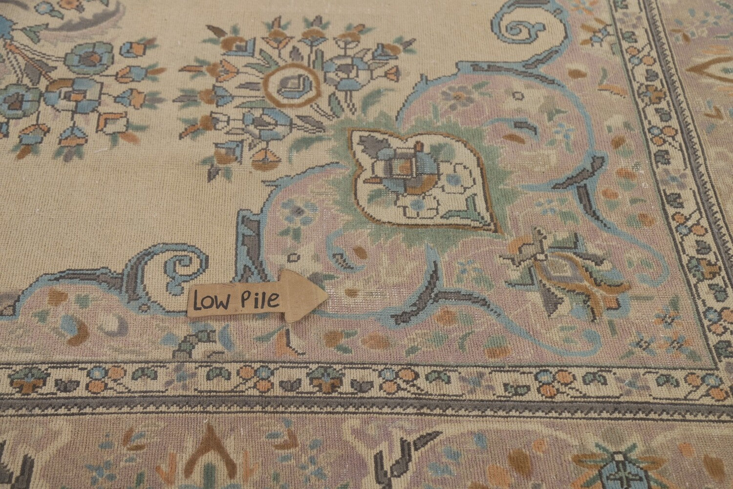 A Beautiful Genuine Persia ( Persia ) Tabriz rug is Hand Knotted by skillful weavers in Persia ( Persia ) with 100% Wool Material. This rug is in Very Good (Low Pile) condition. dimensions are 12' 3'' X 9' 8'' in foot and 373 X 295 in centimeter. the primary color is Beige & Ivories.