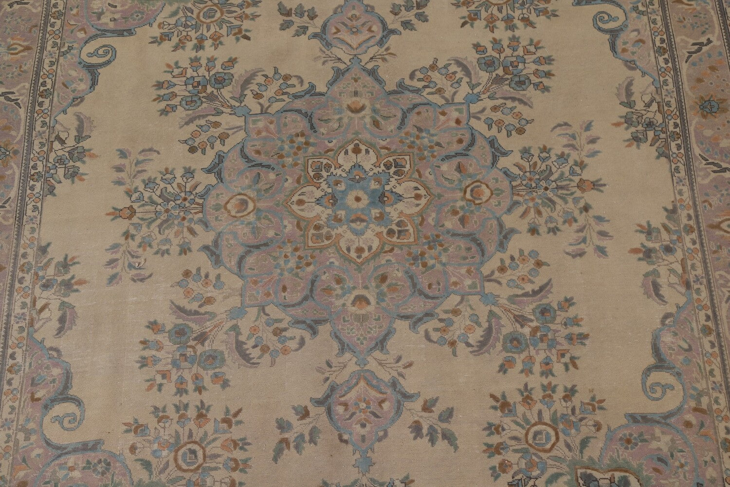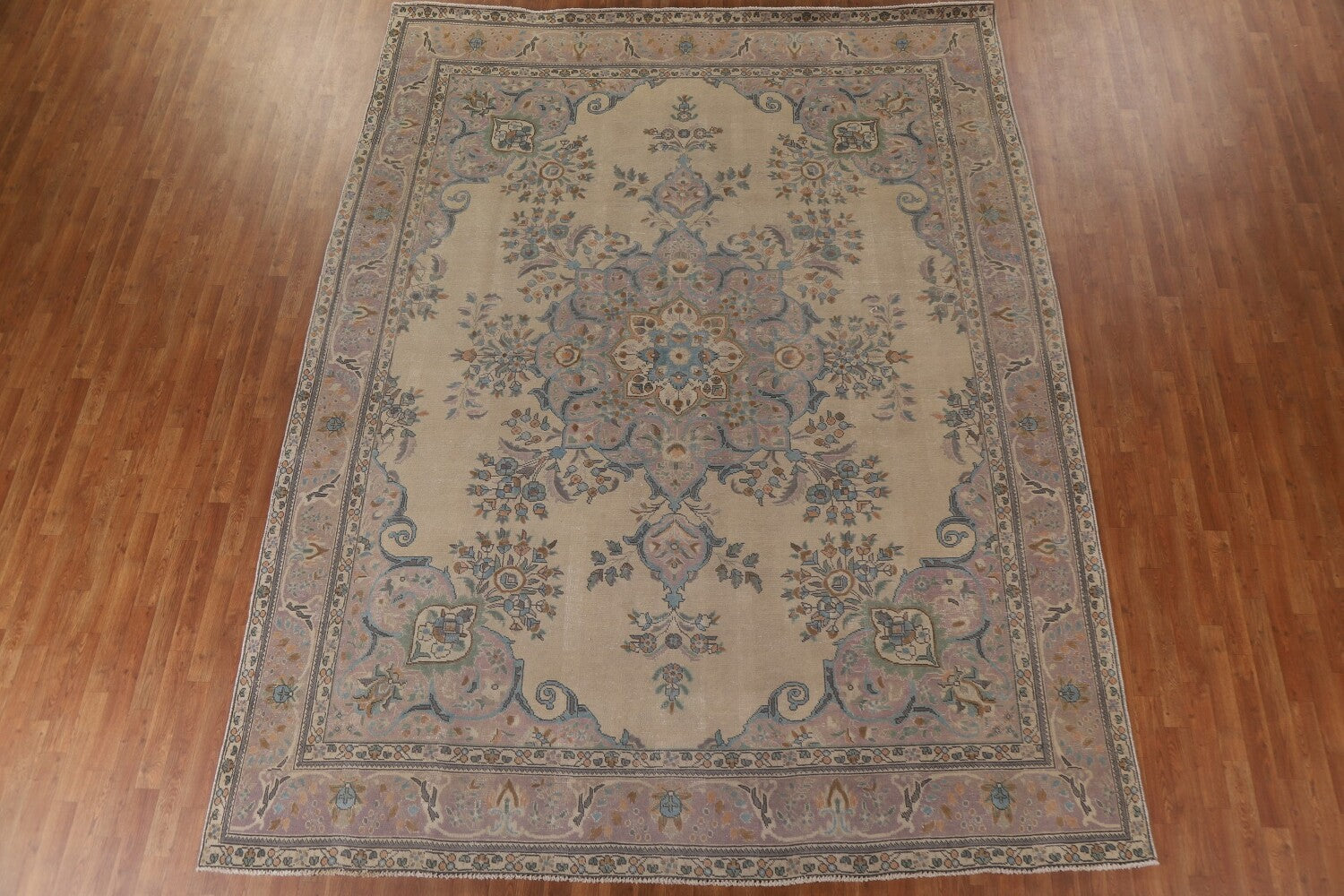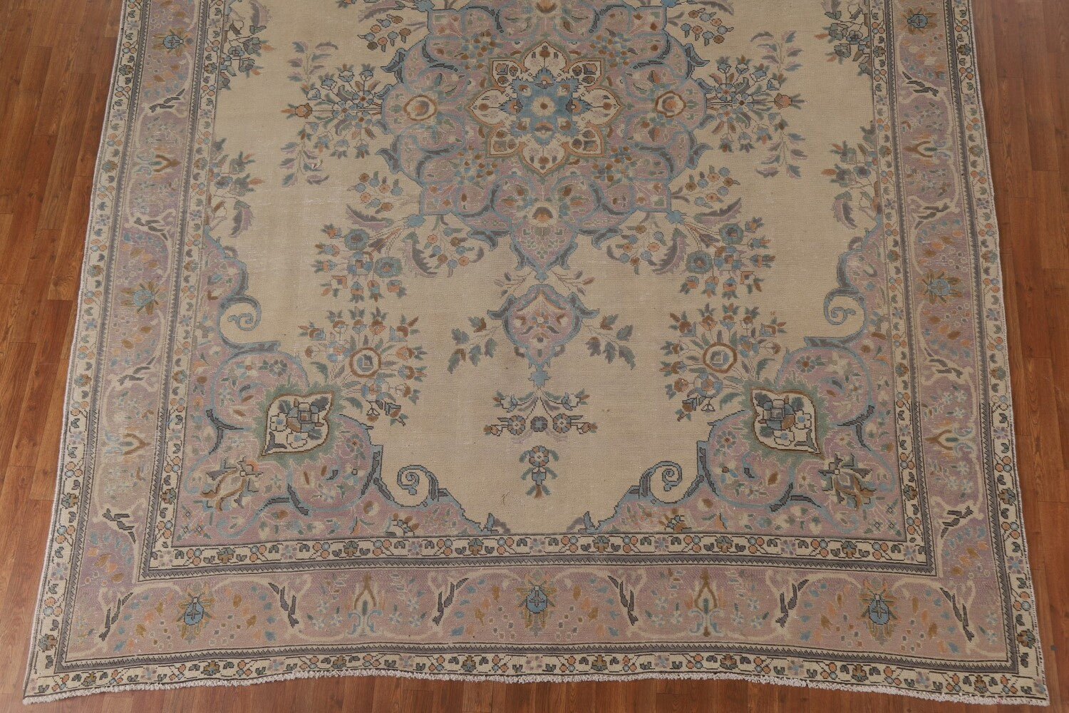 A Beautiful Genuine Persia ( Persia ) Tabriz rug is Hand Knotted by skillful weavers in Persia ( Persia ) with 100% Wool Material. This rug is in Very Good (Low Pile) condition. dimensions are 12' 3'' X 9' 8'' in foot and 373 X 295 in centimeter. the primary color is Beige & Ivories.