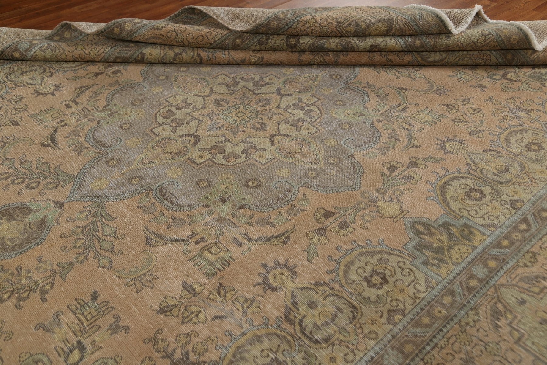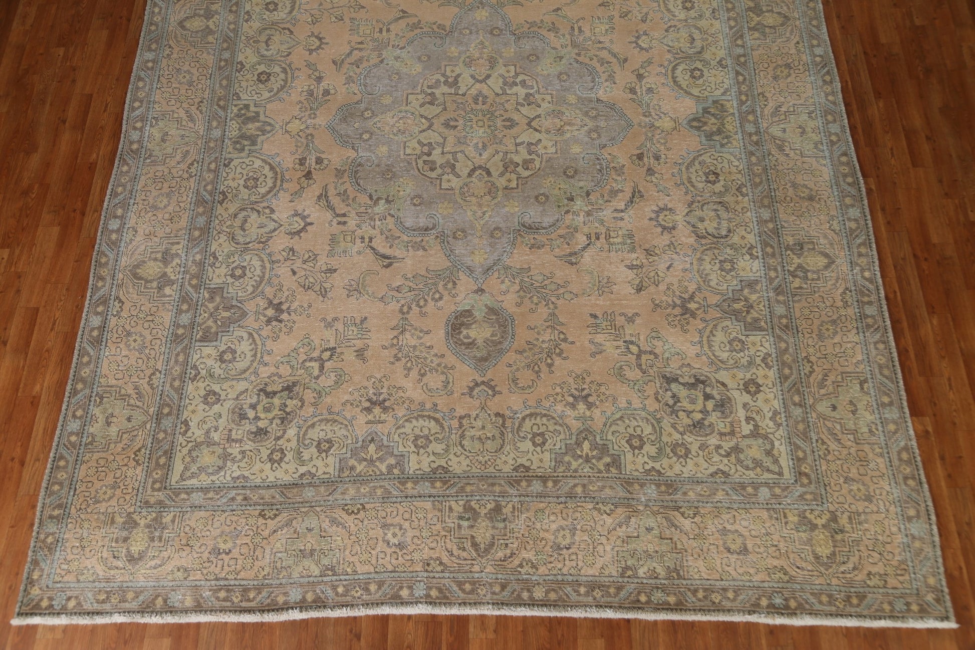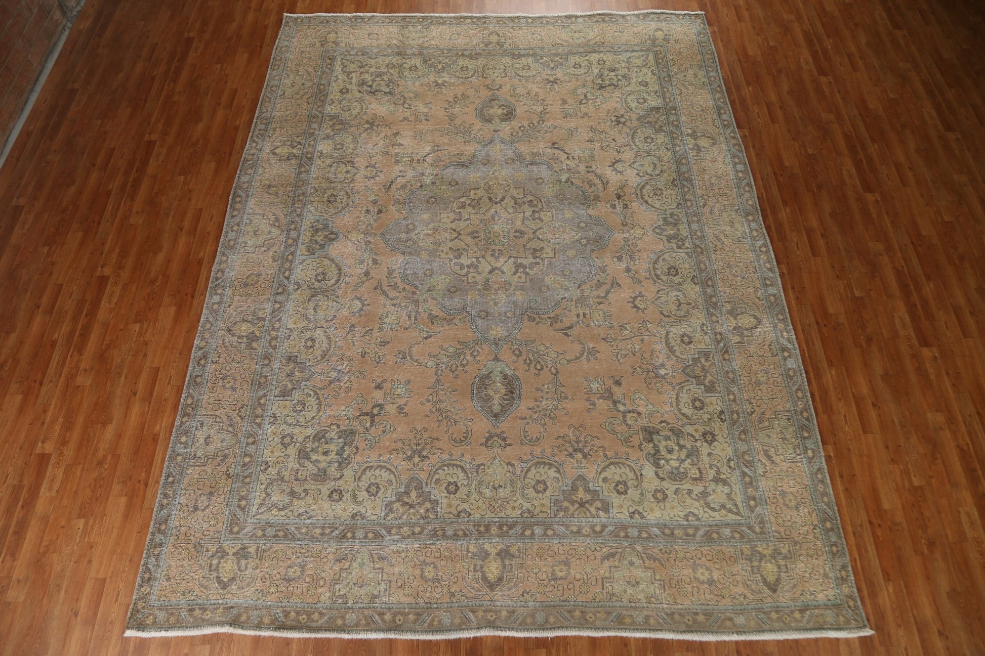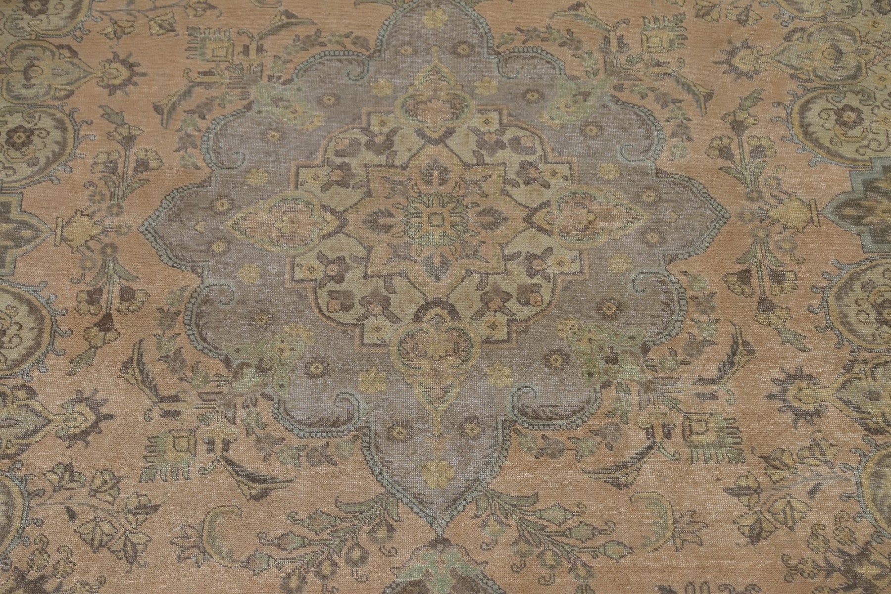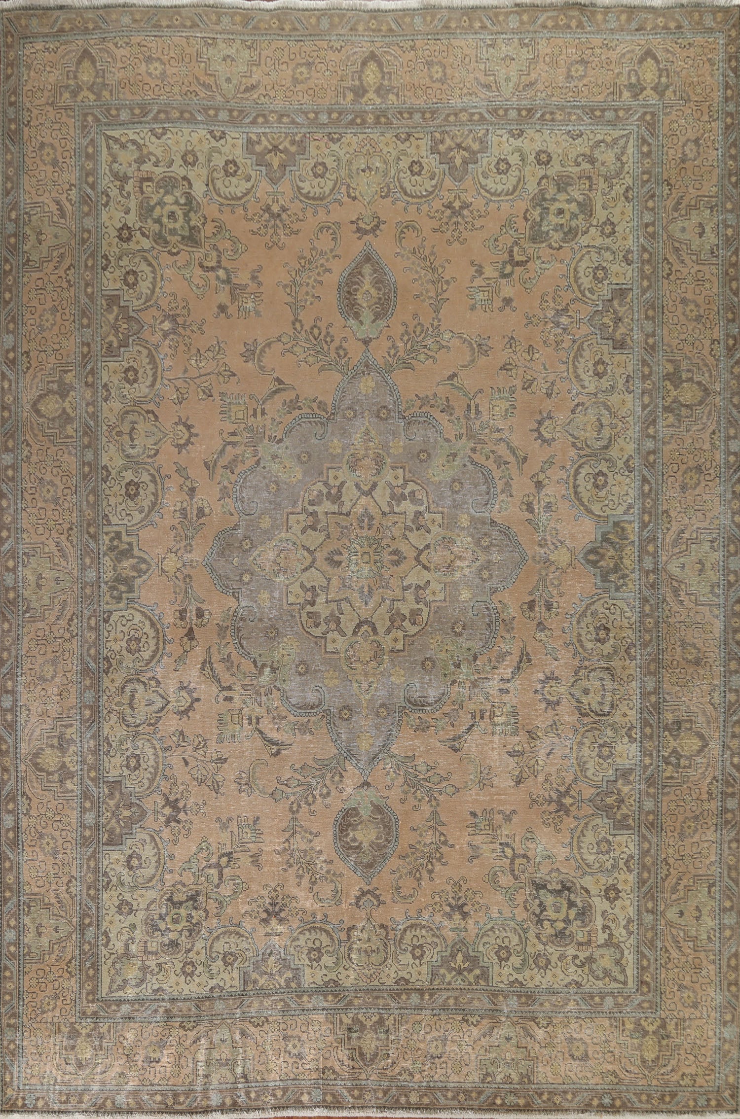 A Beautiful Genuine Persia ( Persia ) Tabriz rug is Hand Knotted by skillful weavers in Persia ( Persia ) with 100% Wool Material. This rug is in Very Good (Evenly Low Pile) condition. dimensions are 12' 8'' X 9' 8'' in foot and 386 X 295 in centimeter. the primary color is Peach.