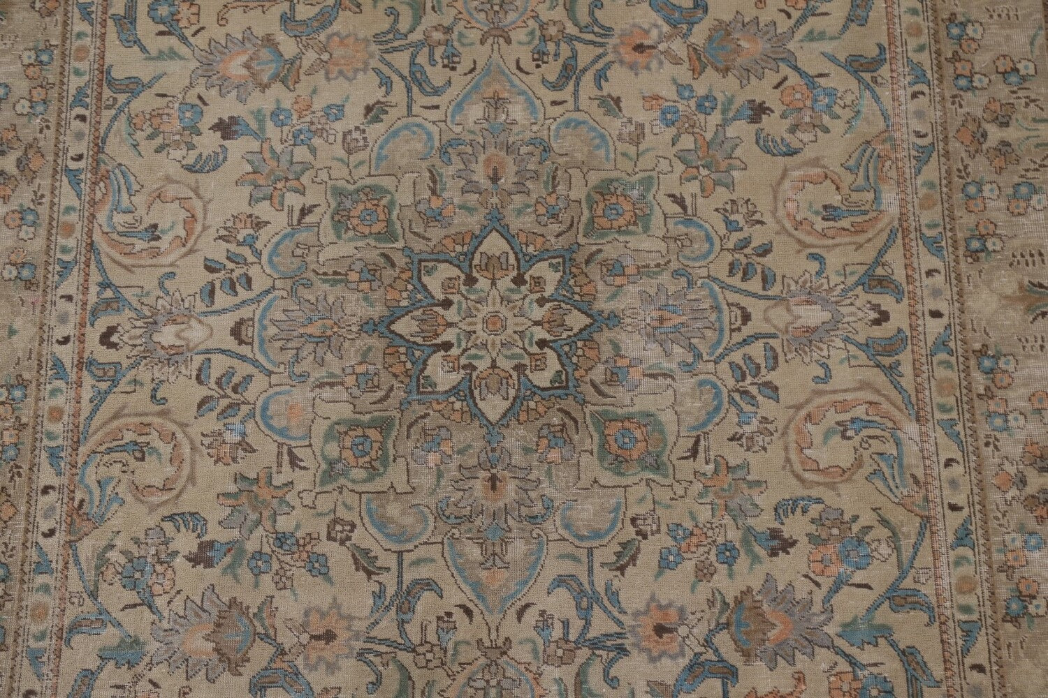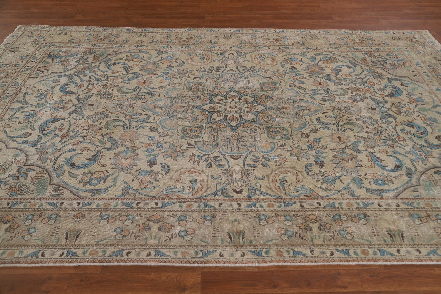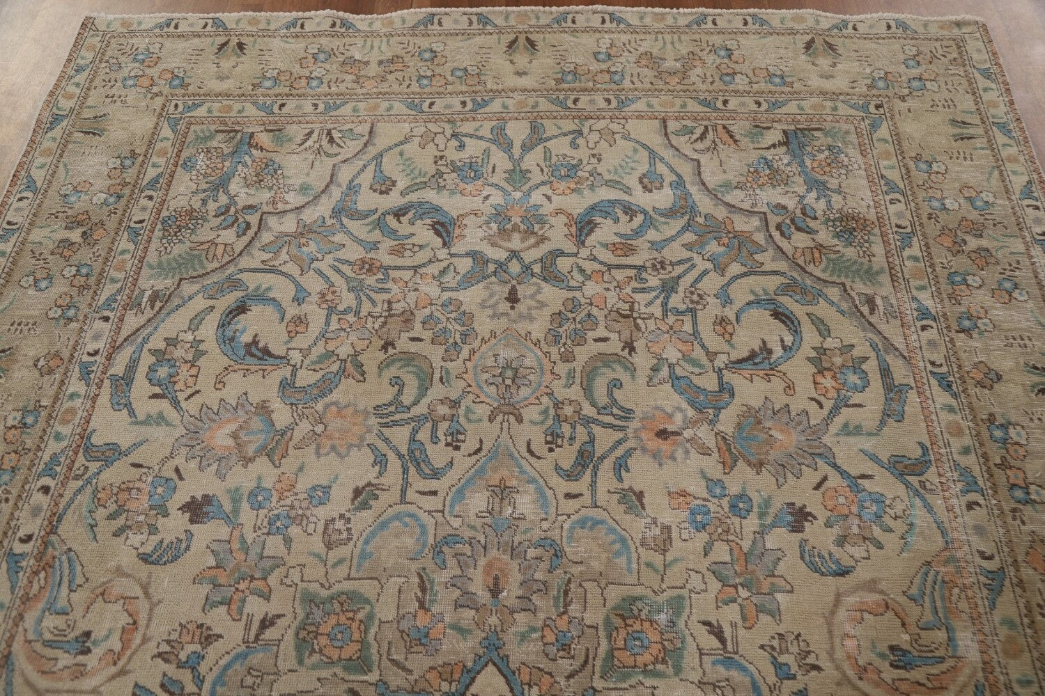 A Beautiful Genuine Persia ( Persia ) Tabriz rug is Hand Knotted by skillful weavers in Persia ( Persia ) with 100% Wool Material. This rug is in Very Good (Low Pile) condition. dimensions are 9' 10'' X 6' 5'' in foot and 300 X 196 in centimeter. the primary color is Beige & Ivories.