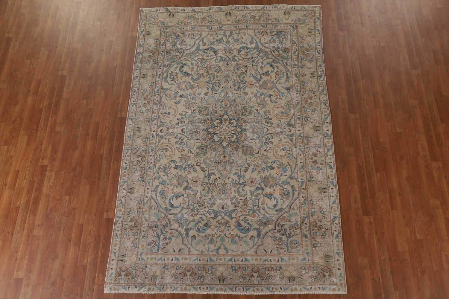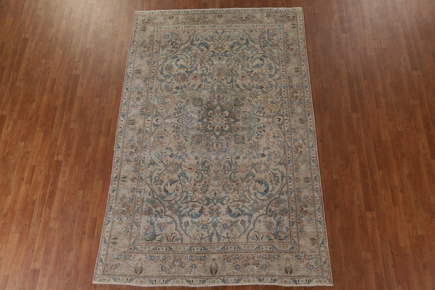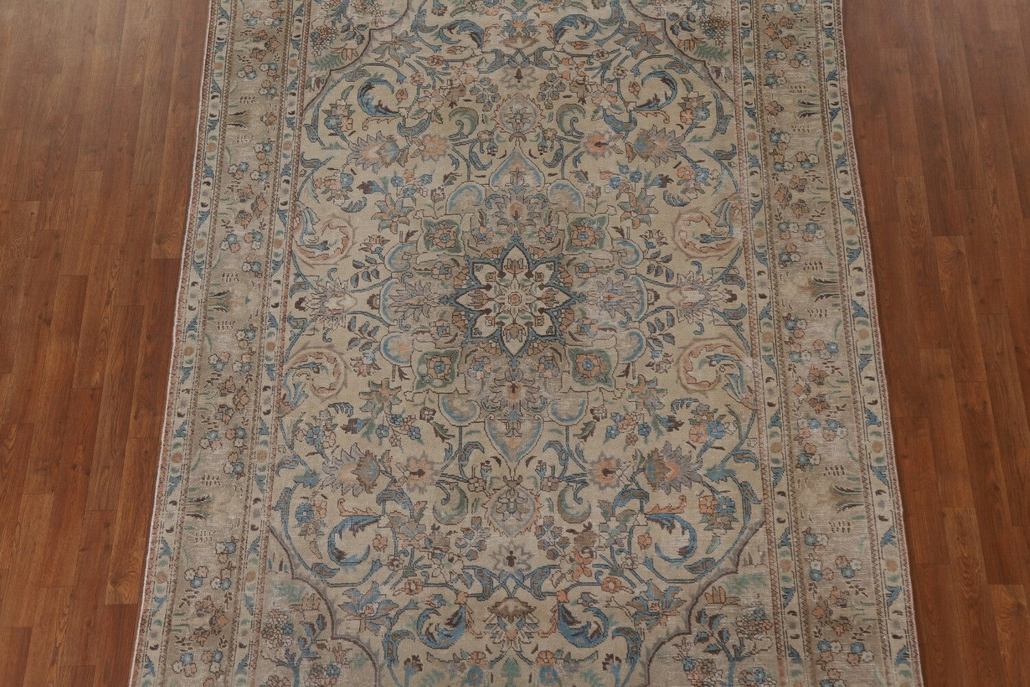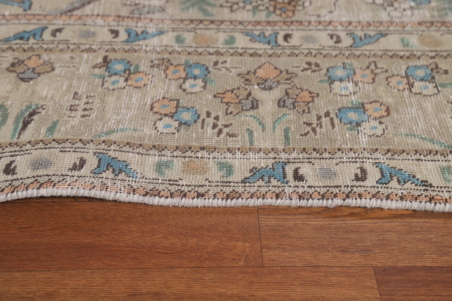 A Beautiful Genuine Persia ( Persia ) Tabriz rug is Hand Knotted by skillful weavers in Persia ( Persia ) with 100% Wool Material. This rug is in Very Good (Low Pile) condition. dimensions are 9' 10'' X 6' 5'' in foot and 300 X 196 in centimeter. the primary color is Beige & Ivories.