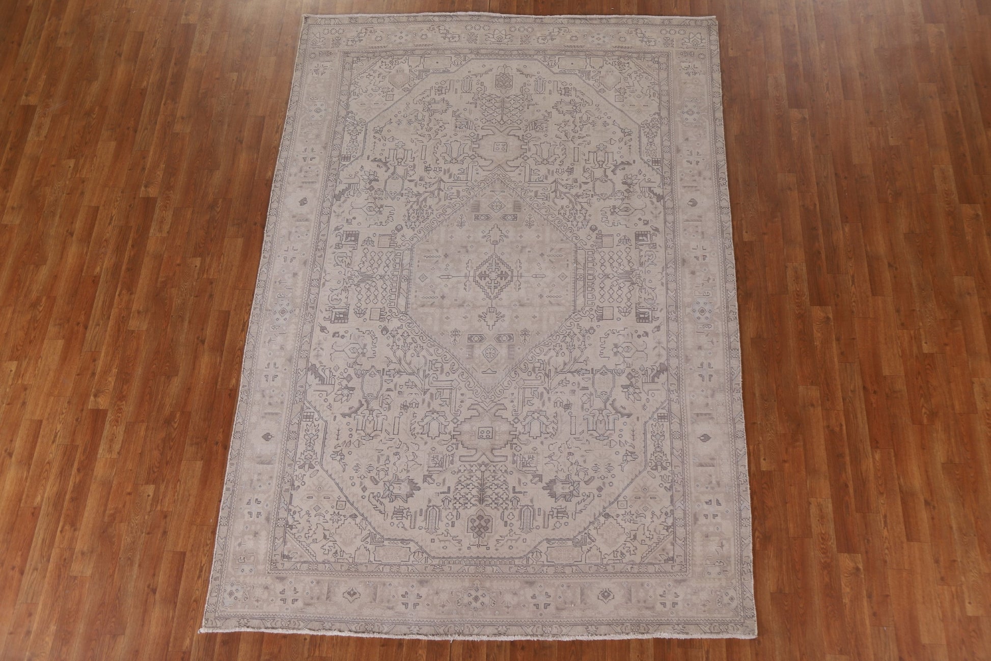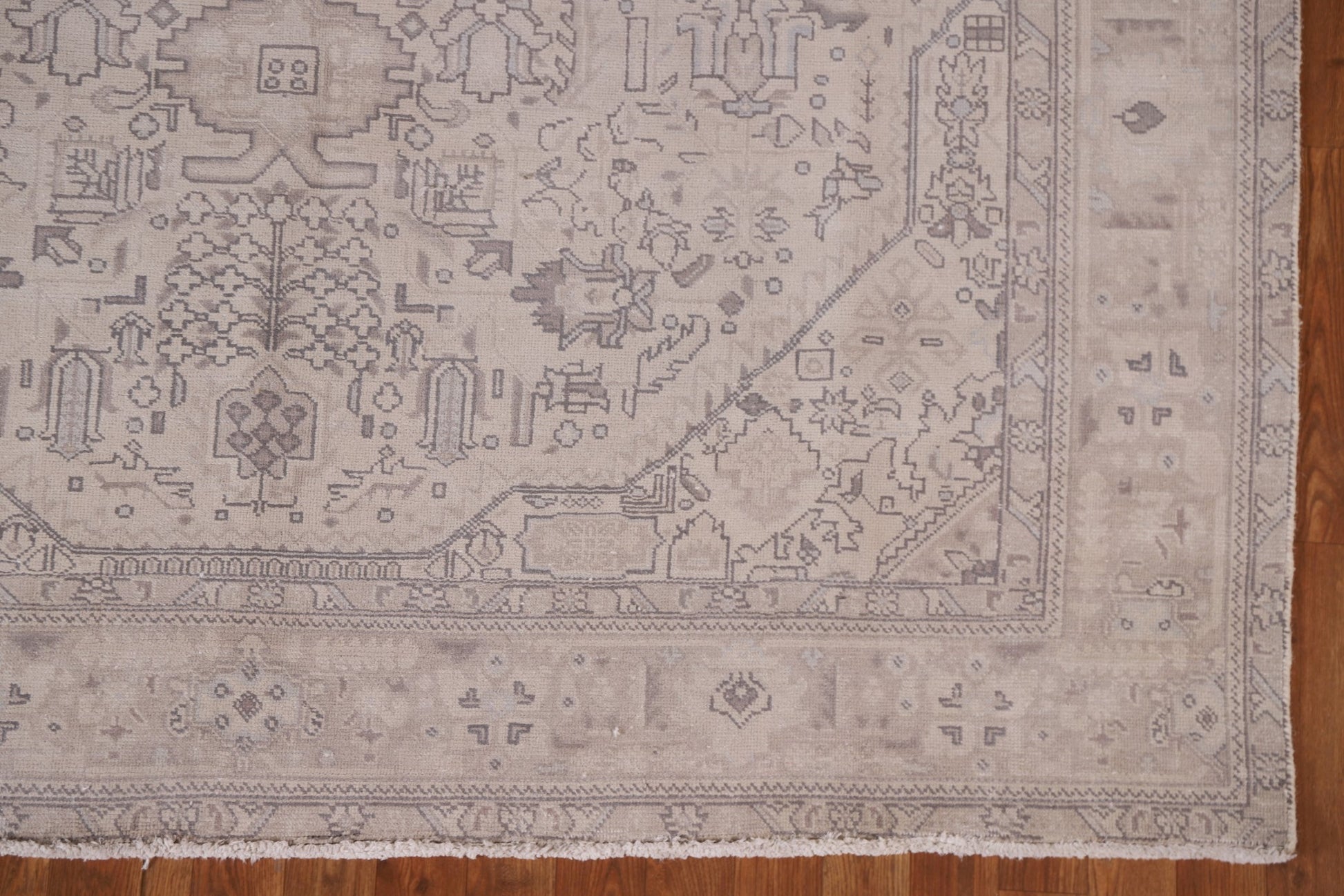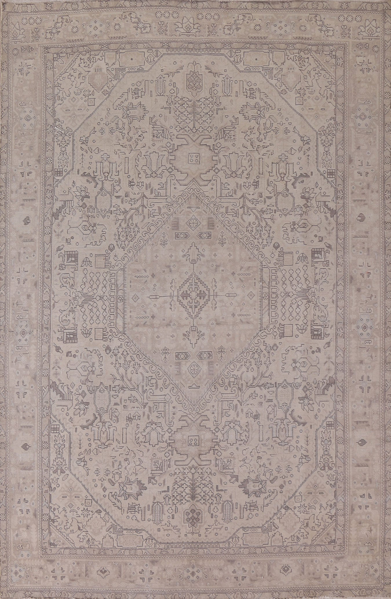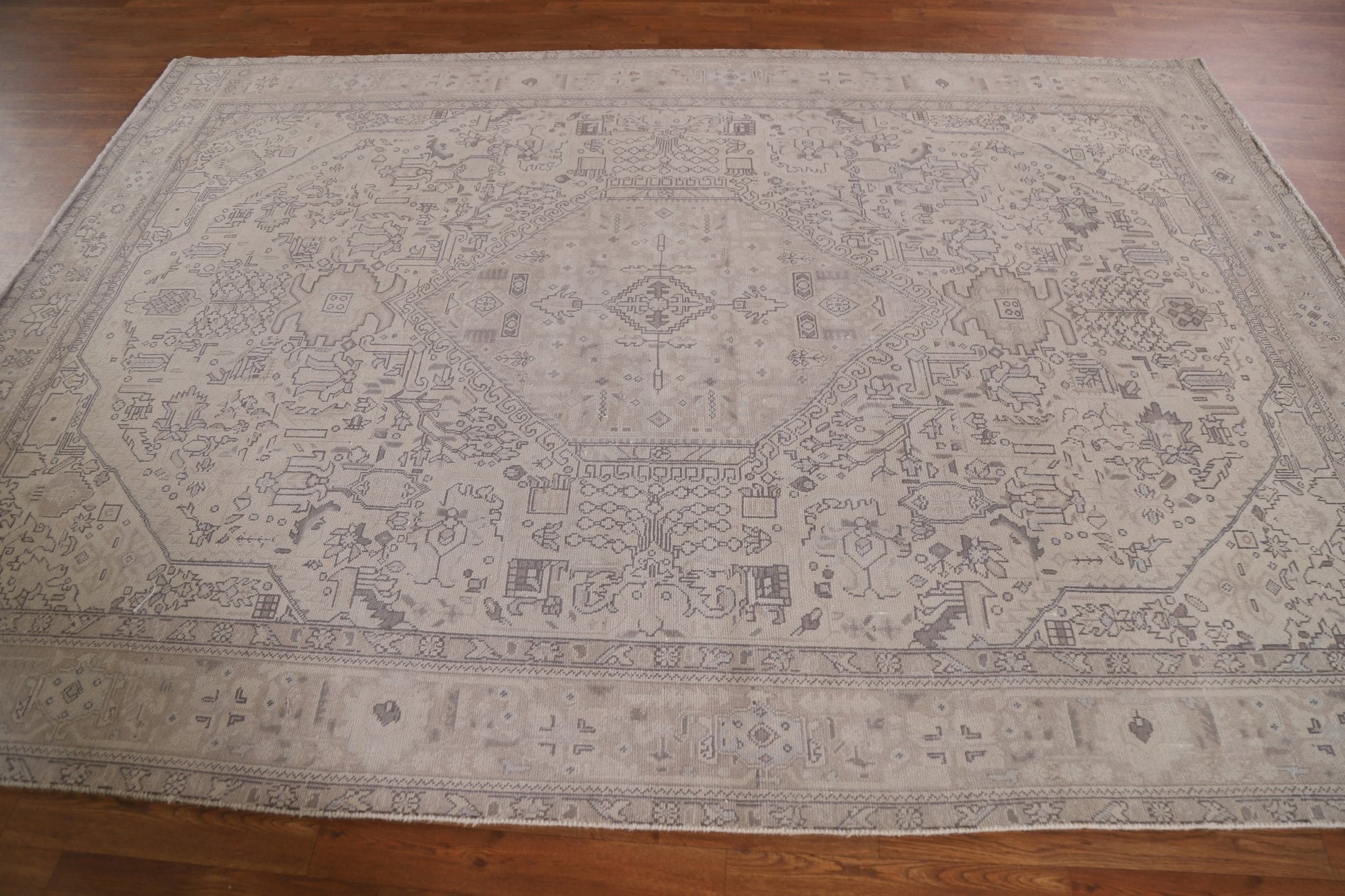 A Beautiful Genuine Persia ( Persia ) Tabriz rug is Hand Knotted by skillful weavers in Persia ( Persia ) with 100% Wool Material. This rug is in Very Good (Evenly Low Pile) condition. dimensions are 9' 5'' X 6' 5'' in foot and 287 X 196 in centimeter. the primary color is Beige & Ivories.