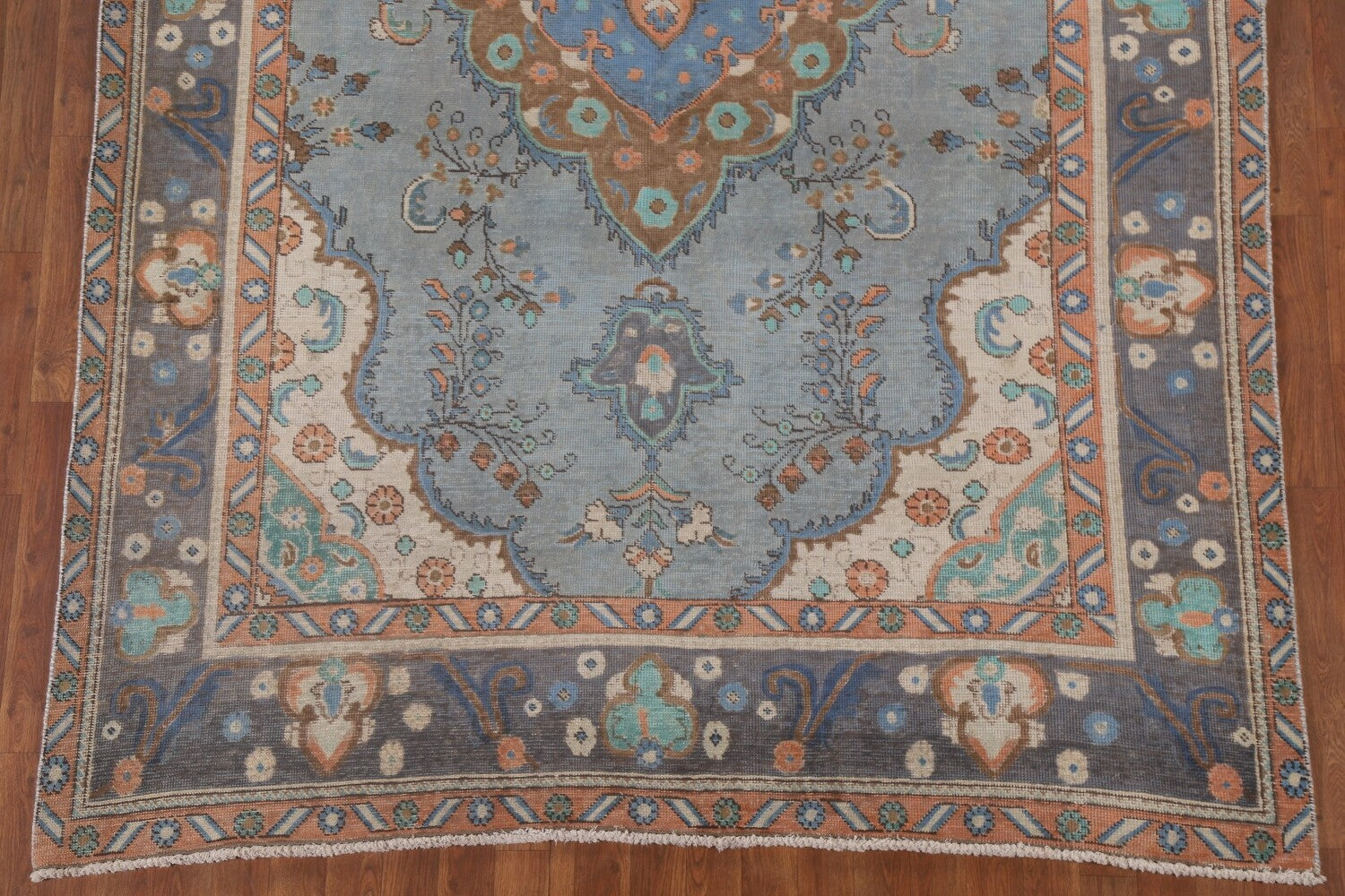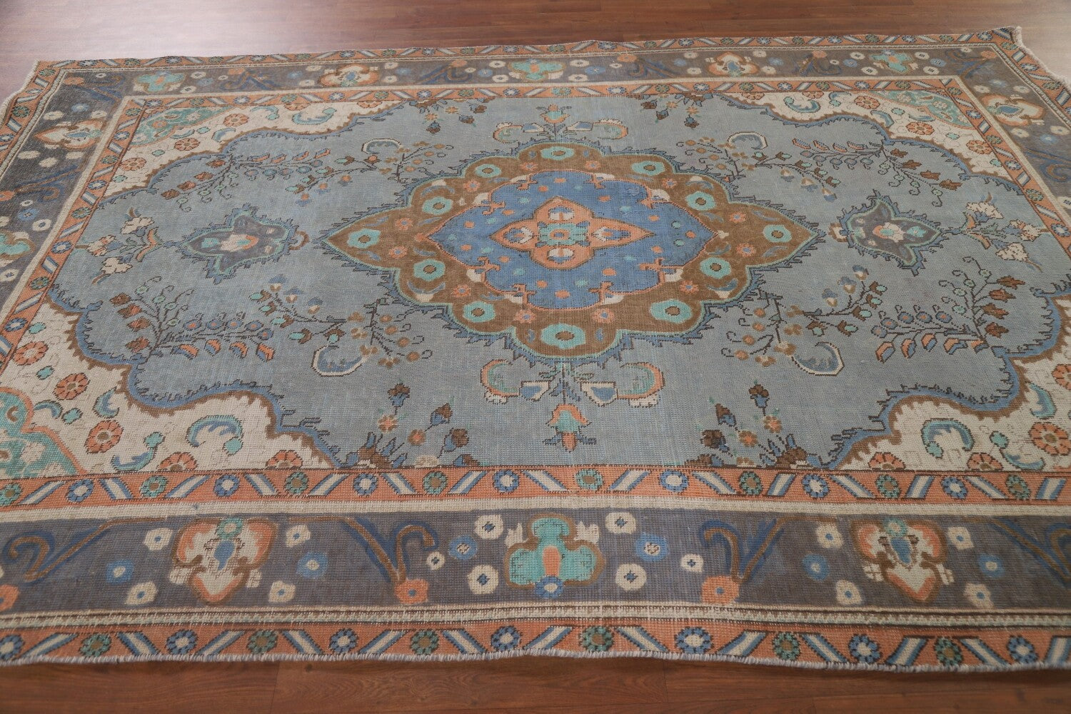 A Beautiful Genuine Persia ( Persia ) Tabriz rug is Hand Knotted by skillful weavers in Persia ( Persia ) with 100% Wool Material. This rug is in Very Good (Evenly Low Pile) condition. dimensions are 9' 4'' X 6' 3'' in foot and 284 X 191 in centimeter. the primary color is Navy Blue & Blues.