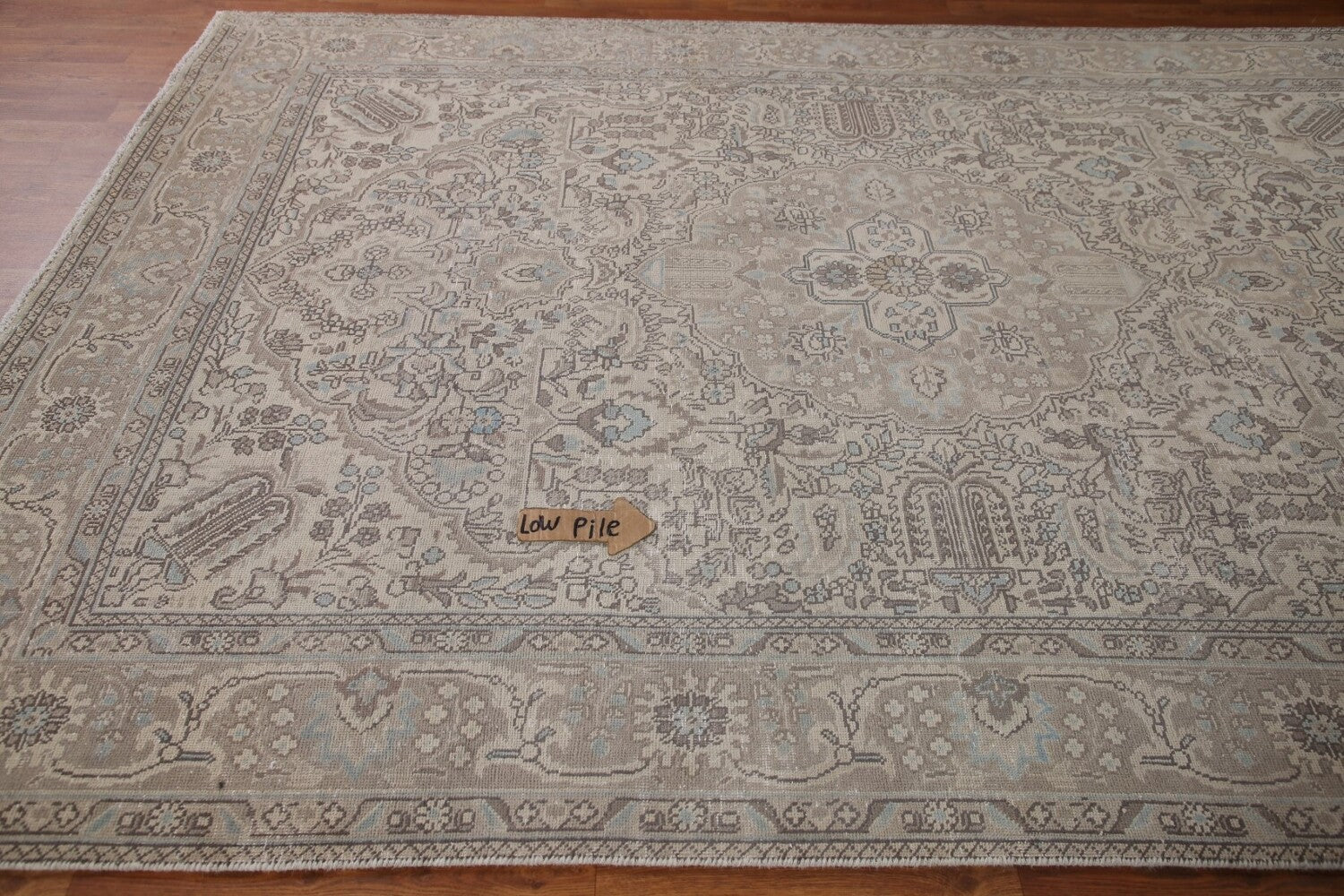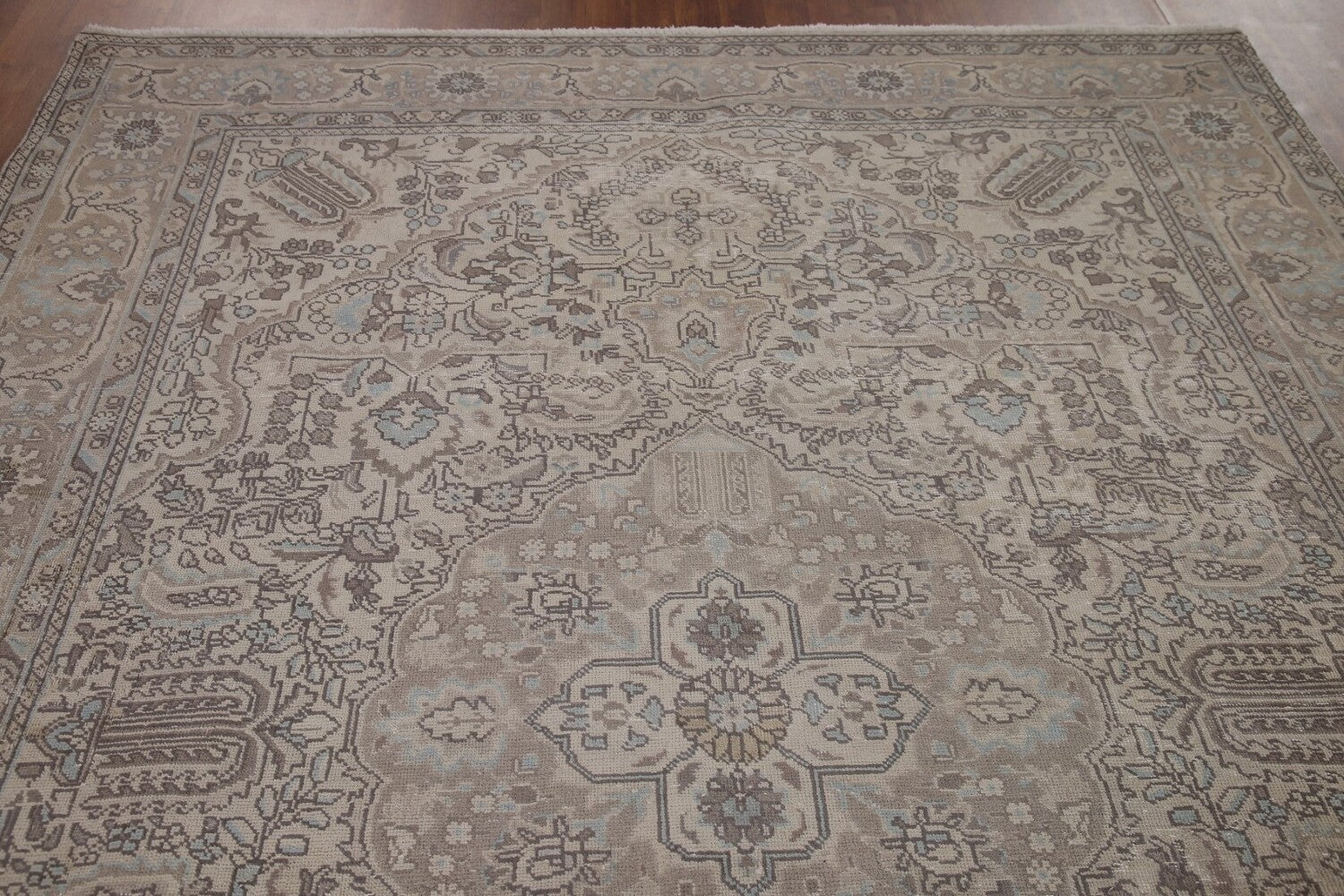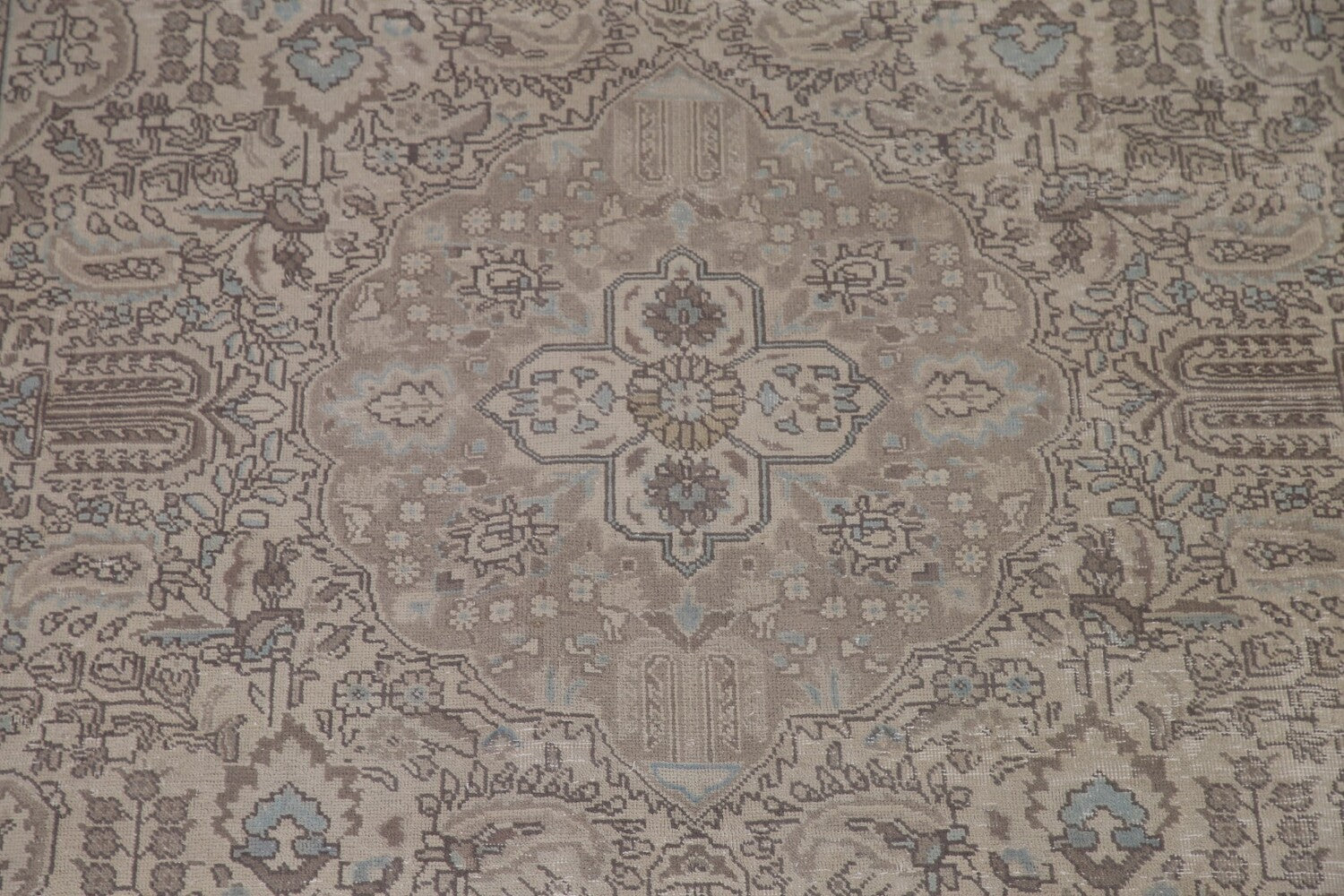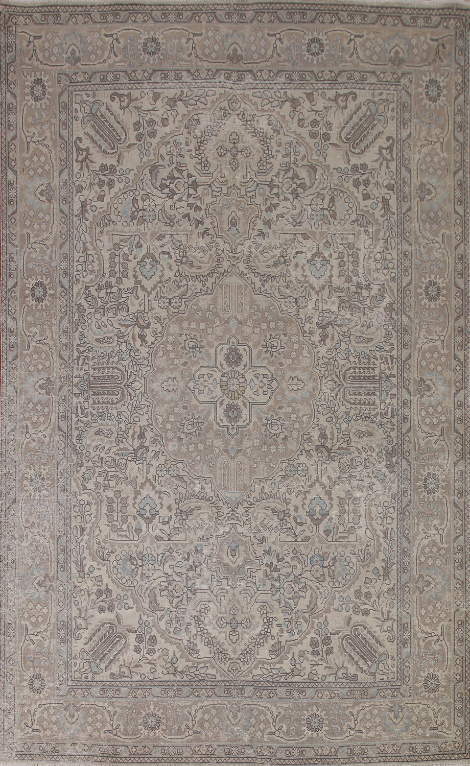 A Beautiful Genuine Persia ( Persia ) Tabriz rug is Hand Knotted by skillful weavers in Persia ( Persia ) with 100% Wool Material. This rug is in Very Good (Low Pile) condition. dimensions are 9' 9'' X 6' 9'' in foot and 297 X 206 in centimeter. the primary color is Beige & Ivories.
