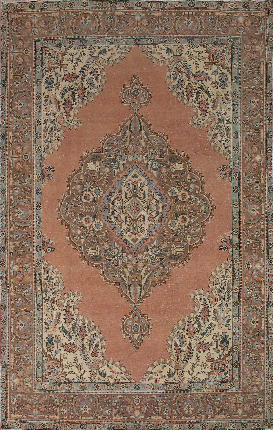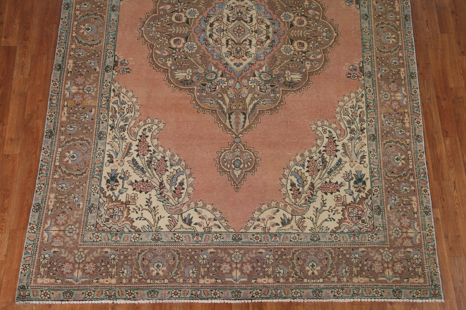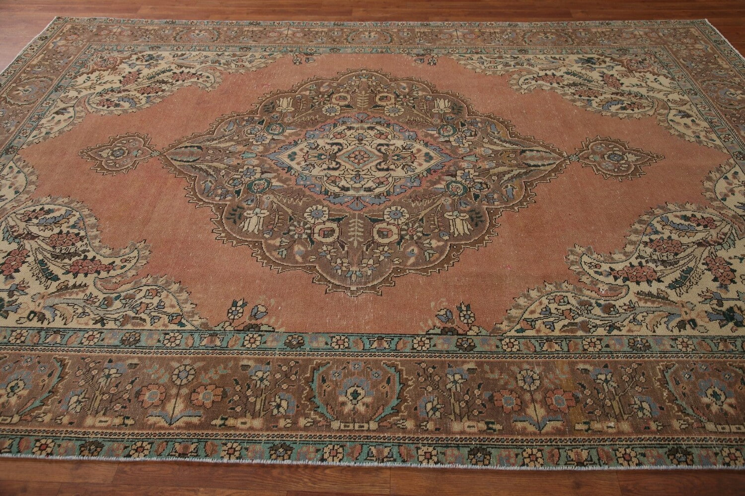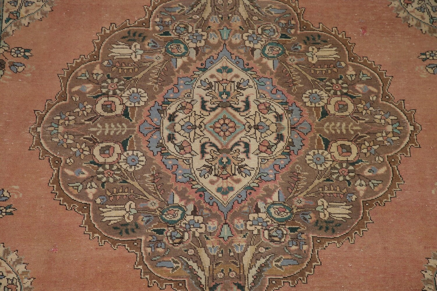 A Beautiful Genuine Persia ( Persia ) Tabriz rug is Hand Knotted by skillful weavers in Persia ( Persia ) with 100% Wool Material. This rug is in Very Good (Low Pile) condition. dimensions are 9' 9'' X 6' 8'' in foot and 297 X 203 in centimeter. the primary color is Coral.