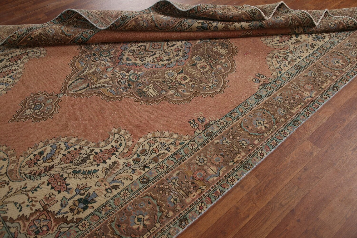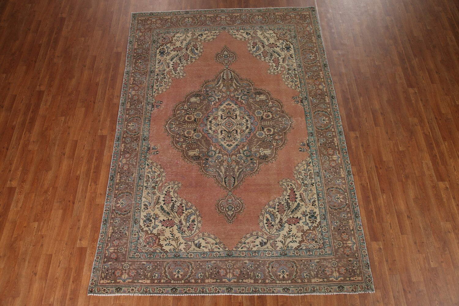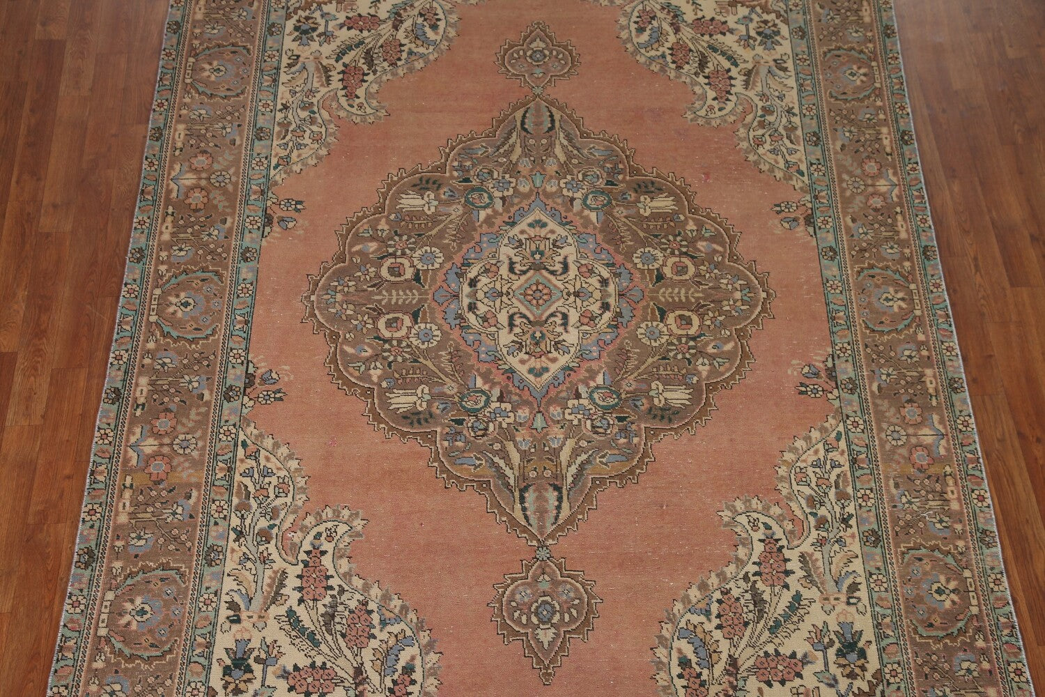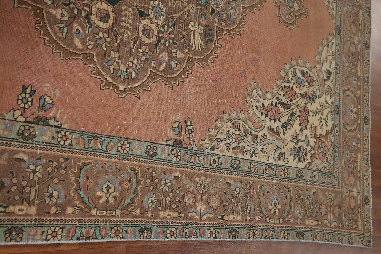 A Beautiful Genuine Persia ( Persia ) Tabriz rug is Hand Knotted by skillful weavers in Persia ( Persia ) with 100% Wool Material. This rug is in Very Good (Low Pile) condition. dimensions are 9' 9'' X 6' 8'' in foot and 297 X 203 in centimeter. the primary color is Coral.