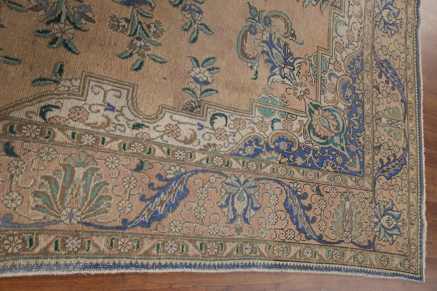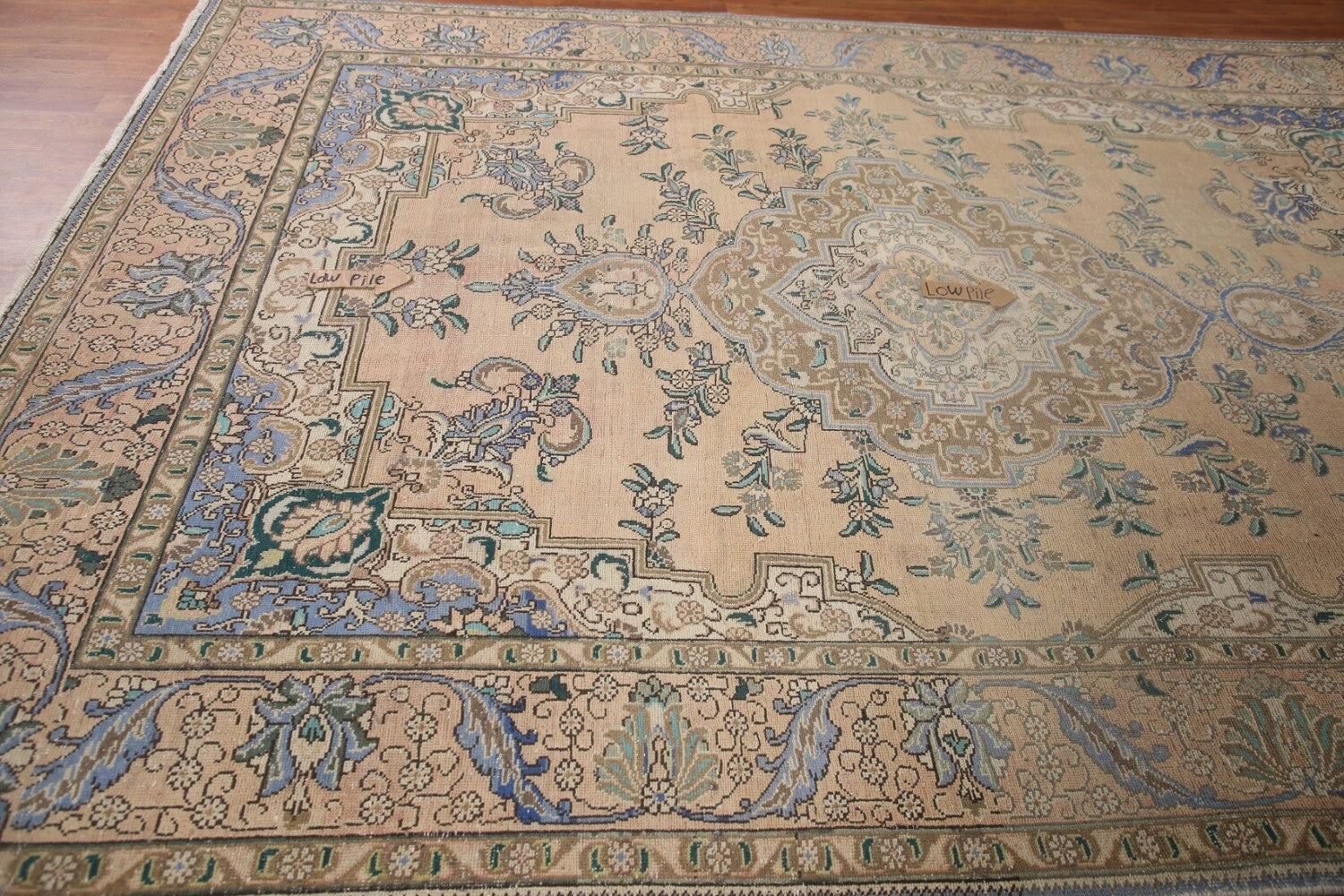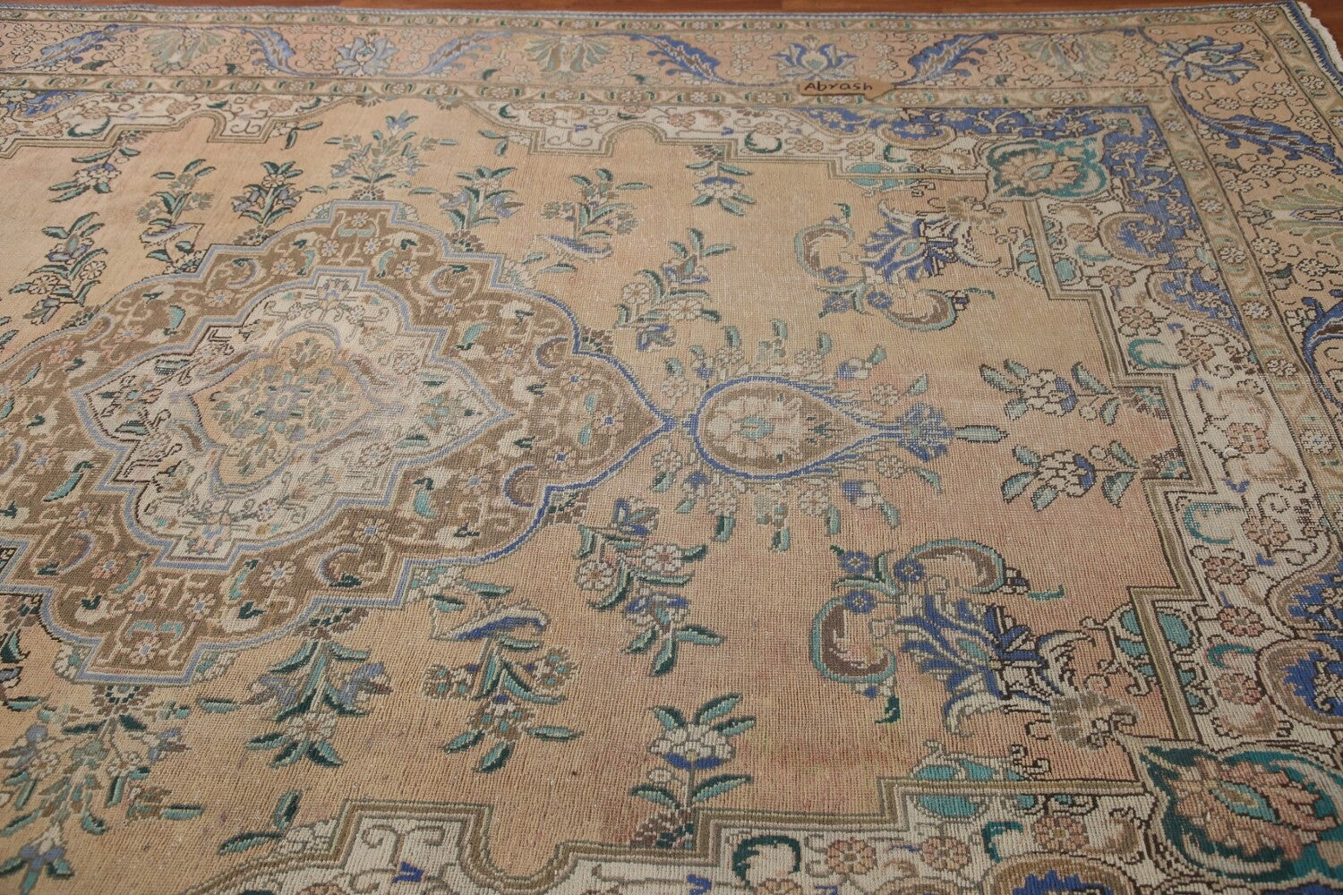 A Beautiful Genuine Persia ( Persia ) Tabriz rug is Hand Knotted by skillful weavers in Persia ( Persia ) with 100% Wool Material. This rug is in Very Good (Low Pile-Abrash) condition. dimensions are 11' 4'' X 8' 0'' in foot and 345 X 244 in centimeter. the primary color is Peach.