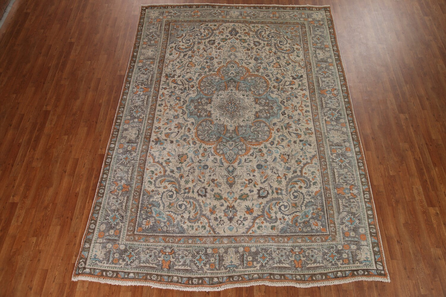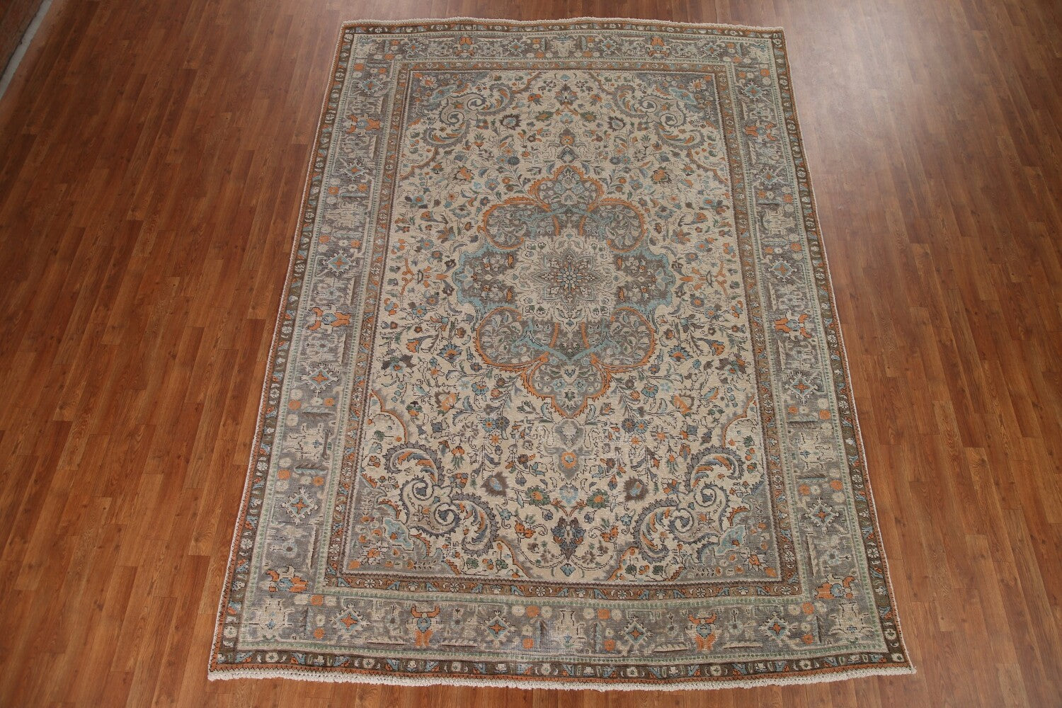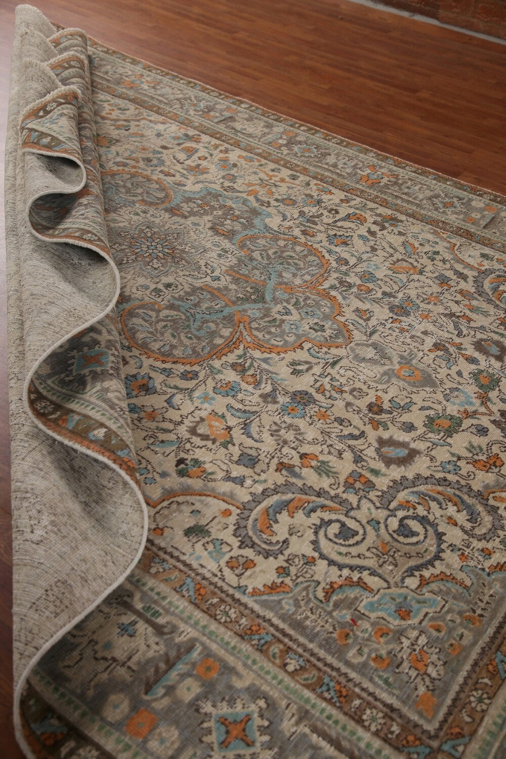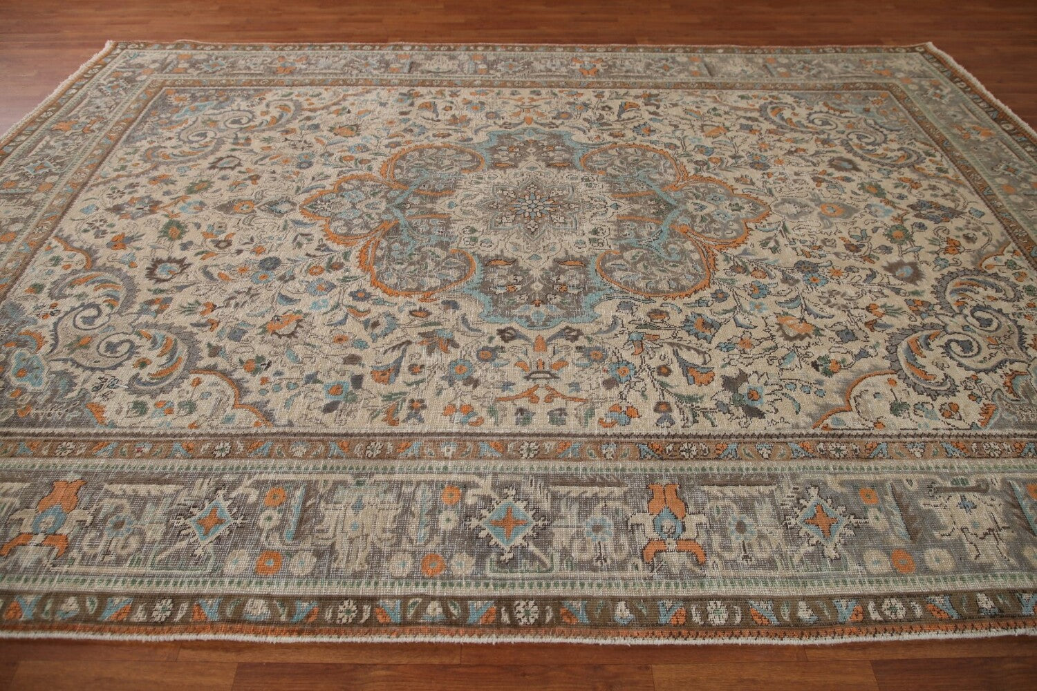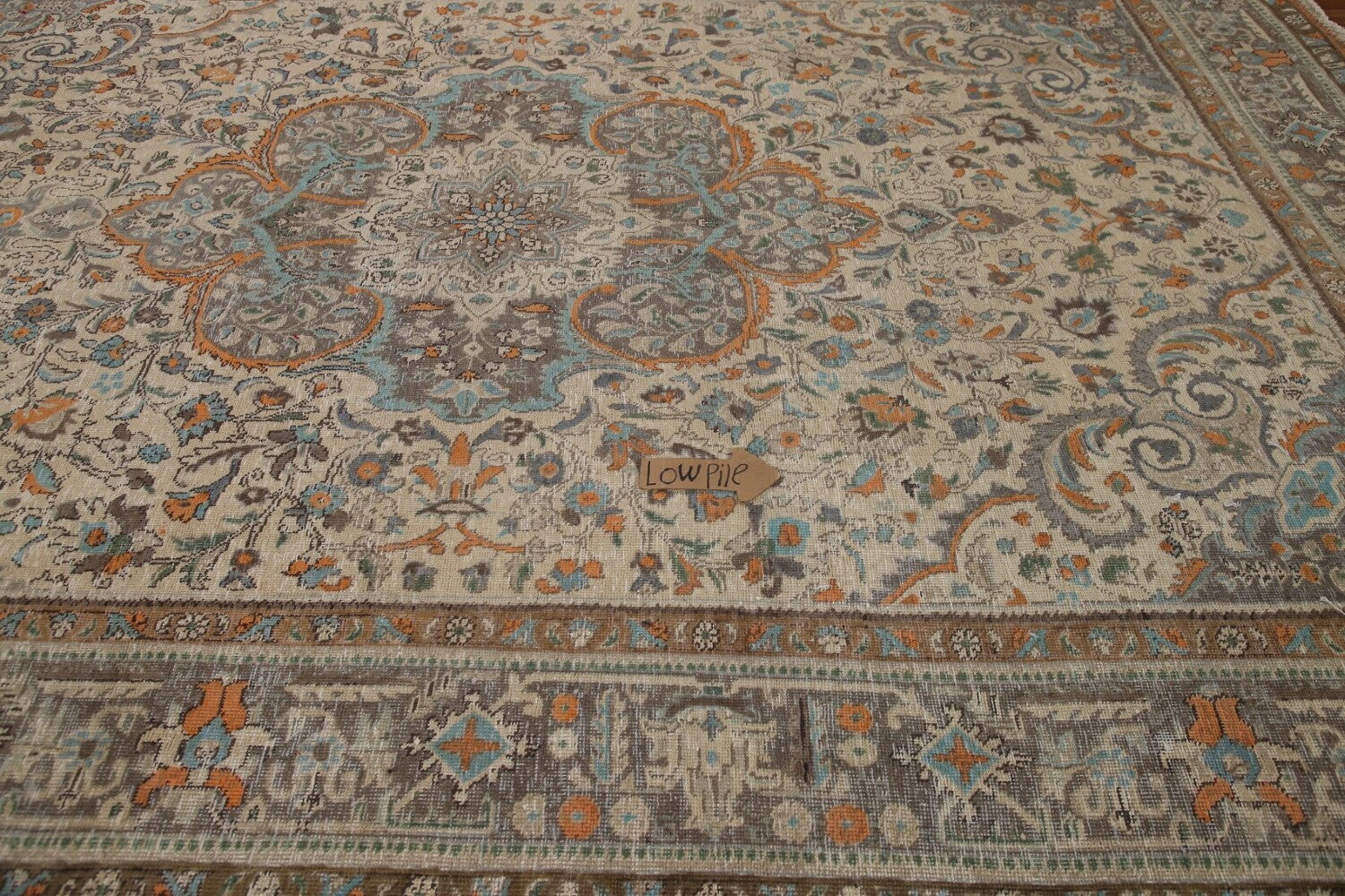A Beautiful Genuine Persia ( Persia ) Tabriz rug is Hand Knotted by skillful weavers in Persia ( Persia ) with 100% Wool Material. This rug is in Very Good (Low Pile) condition. dimensions are 11' 0'' X 7' 9'' in foot and 335 X 236 in centimeter. the primary color is Beige & Ivories.