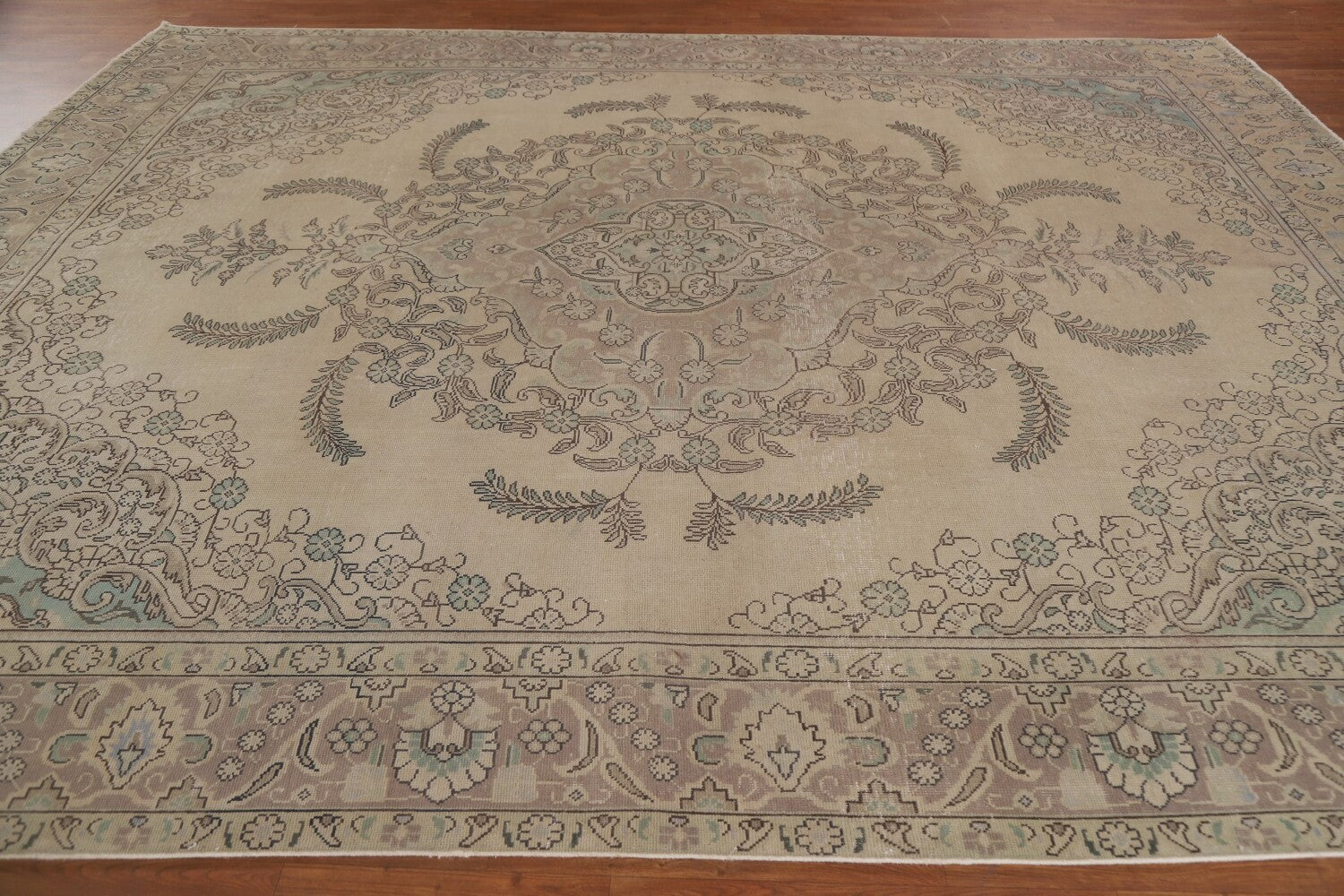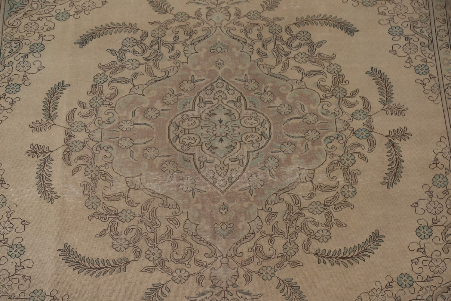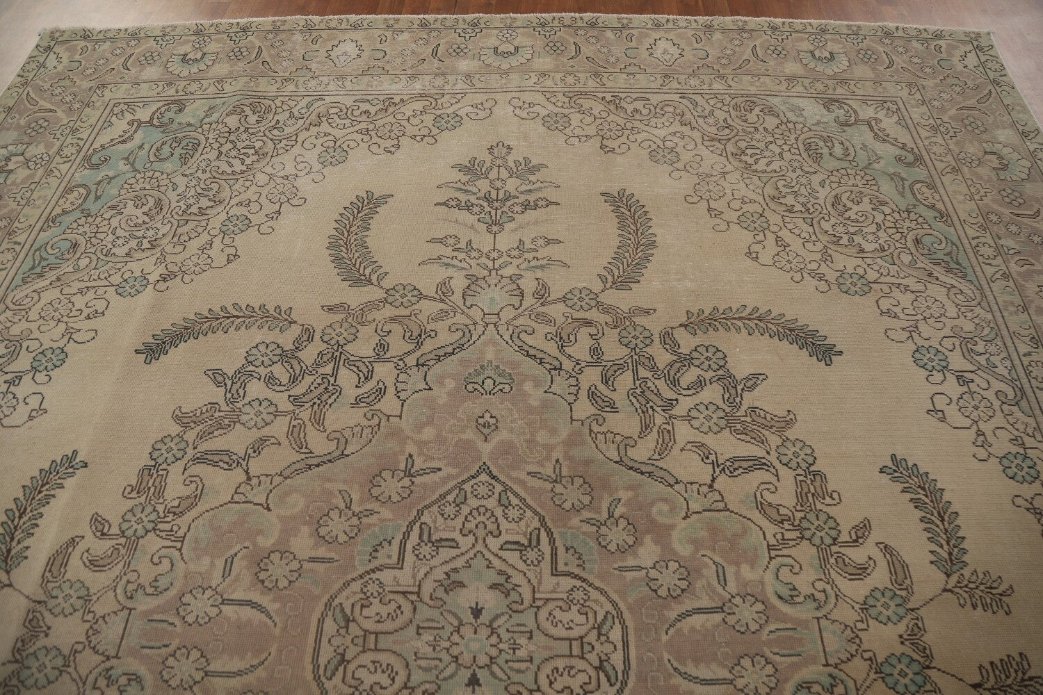 A Beautiful Genuine Persia ( Persia ) Tabriz rug is Hand Knotted by skillful weavers in Persia ( Persia ) with 100% Wool Material. This rug is in Very Good (Evenly Low Pile) condition. dimensions are 11' 10'' X 9' 5'' in foot and 361 X 287 in centimeter. the primary color is Beige & Ivories.