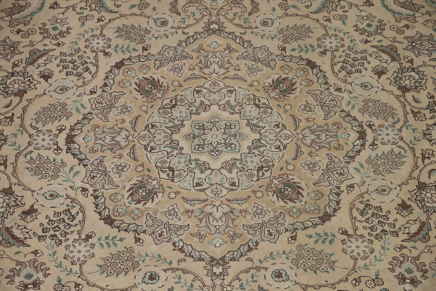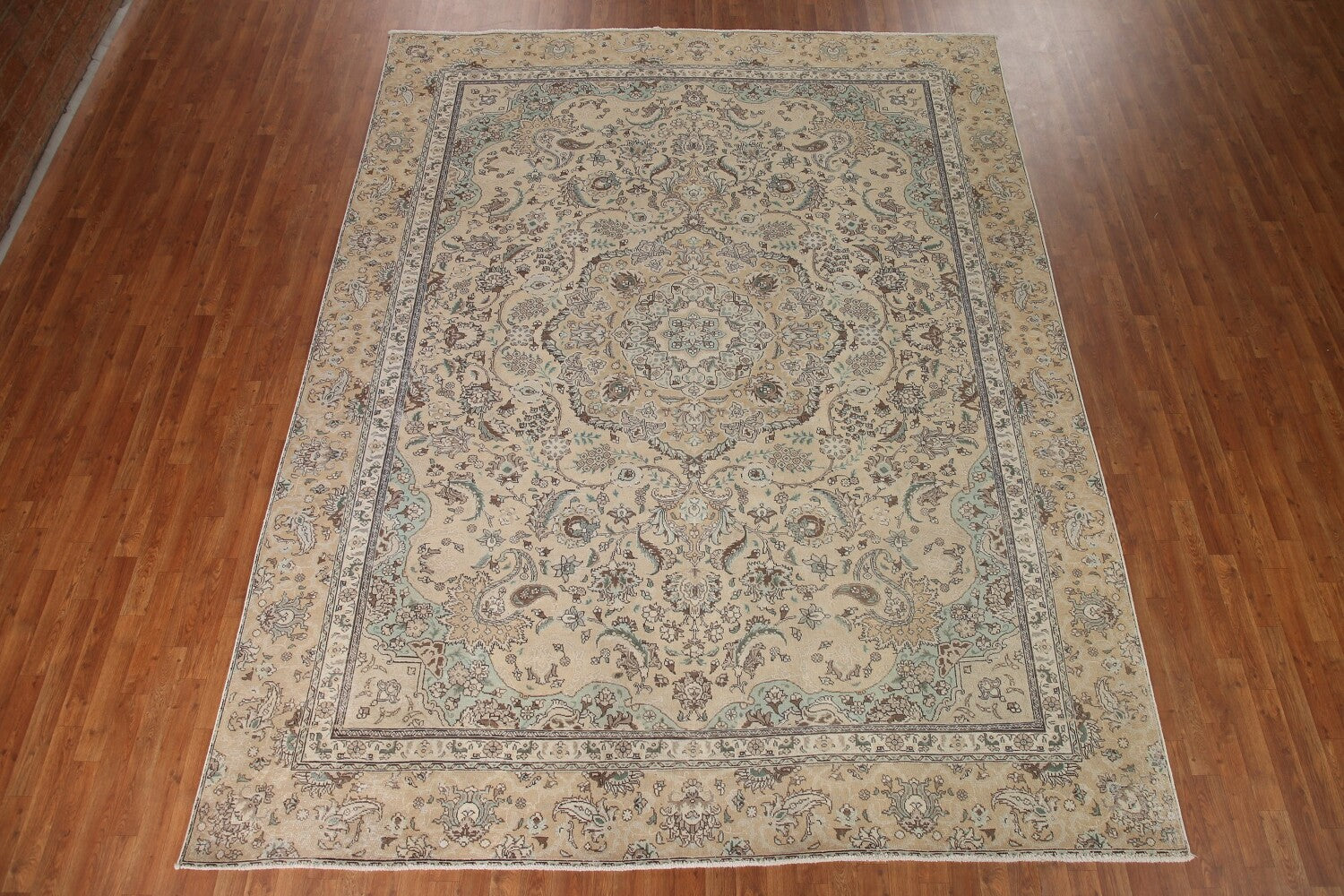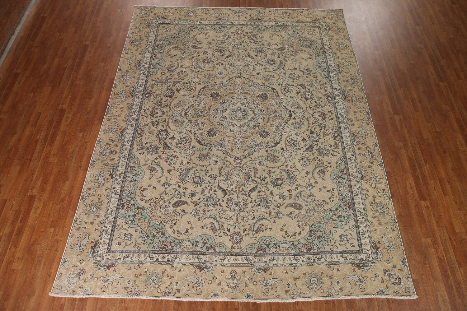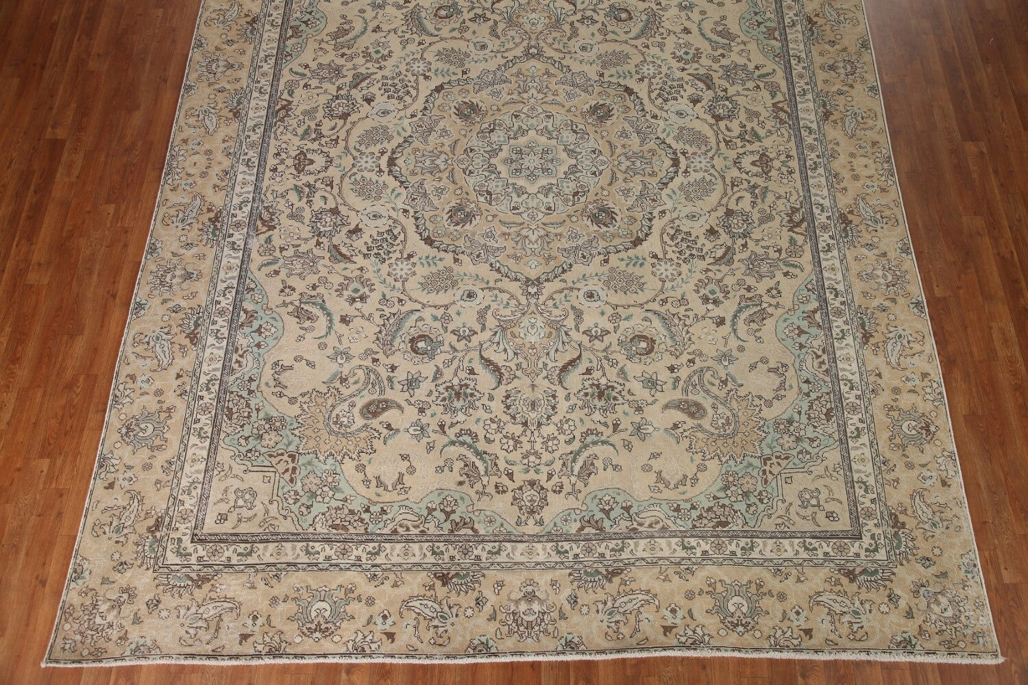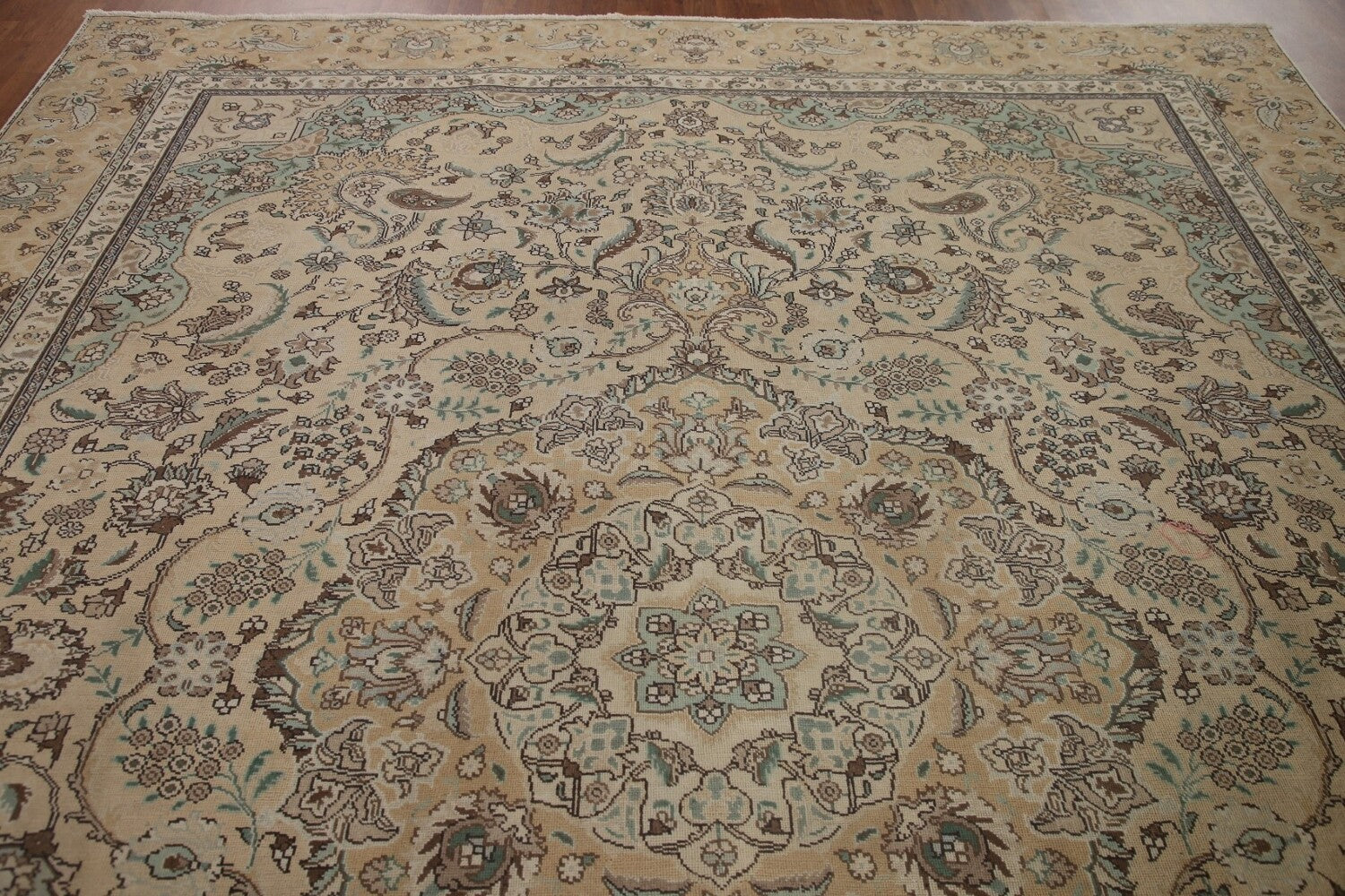 A Beautiful Genuine Persia ( Persia ) Tabriz rug is Hand Knotted by skillful weavers in Persia ( Persia ) with 100% Wool Material. This rug is in Very Good (Evenly Low Pile) condition. dimensions are 11' 10'' X 9' 3'' in foot and 361 X 282 in centimeter. the primary color is Peach.