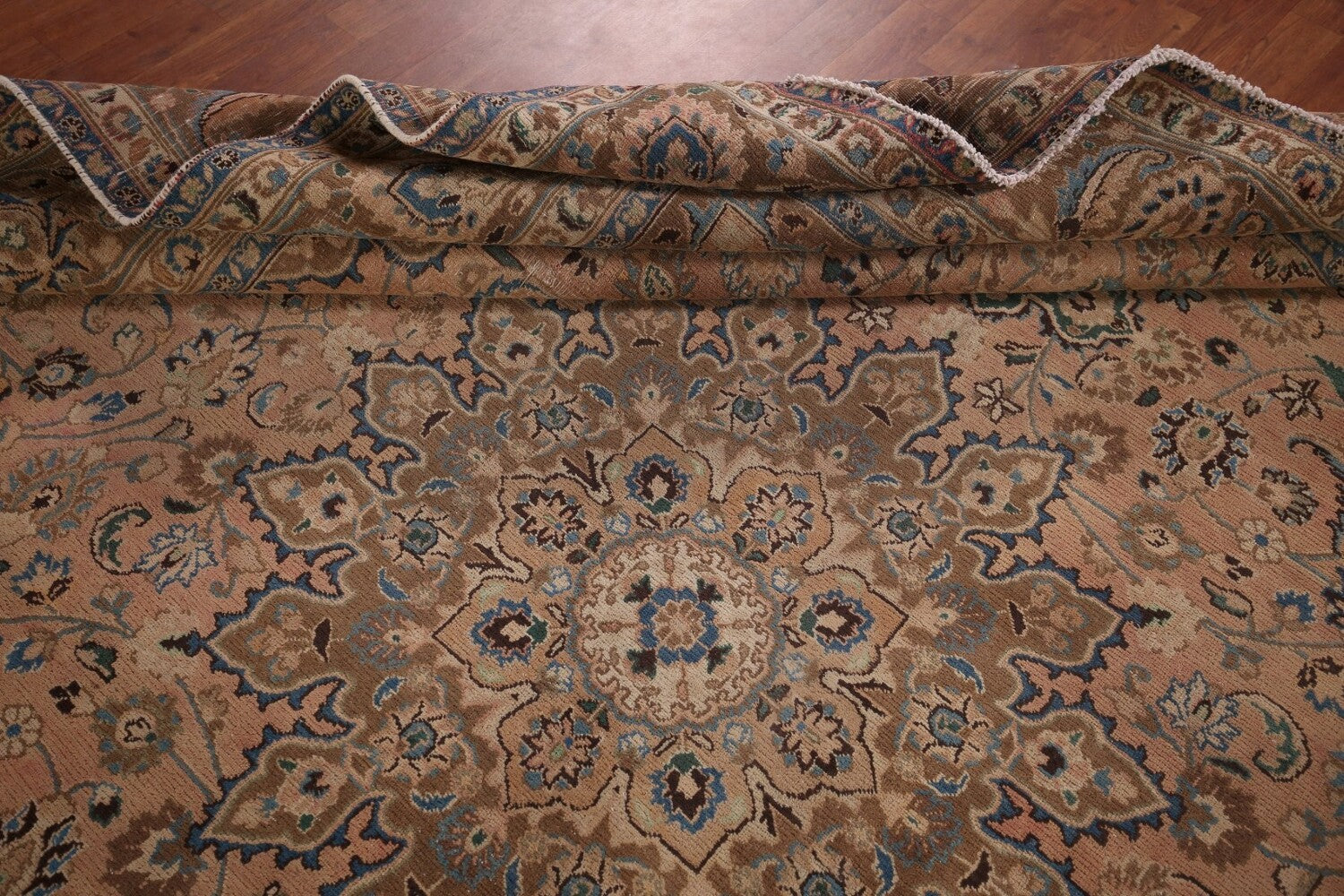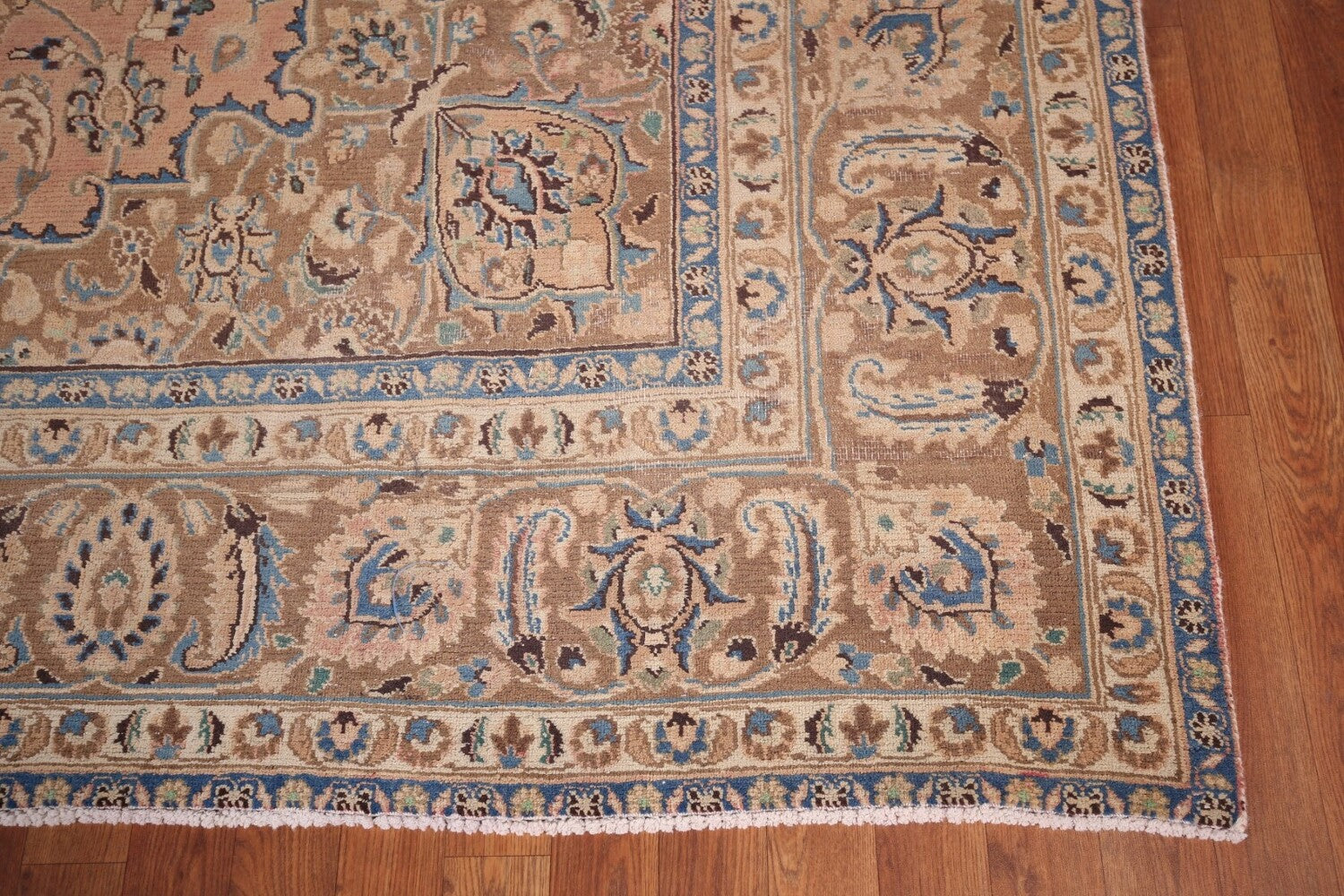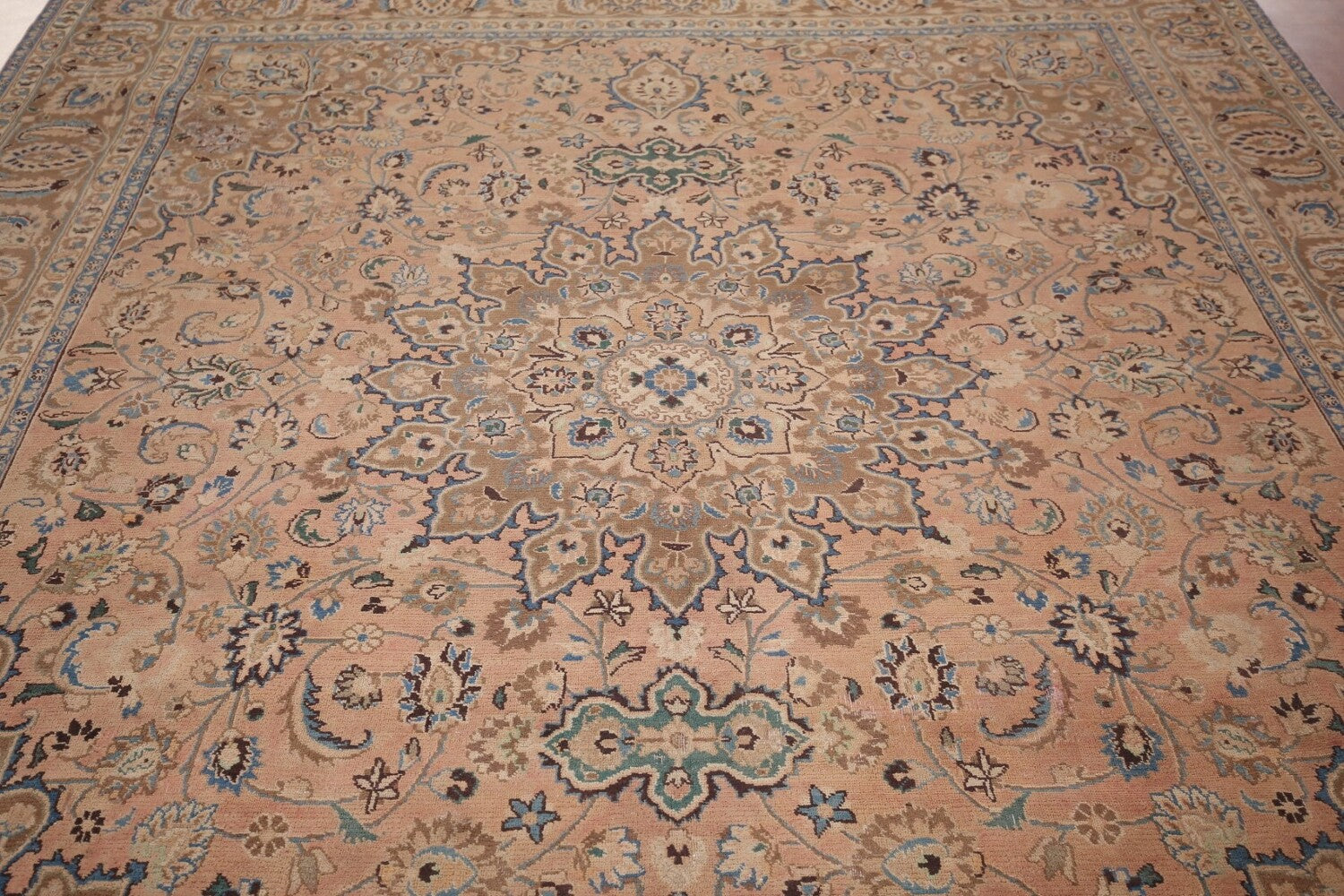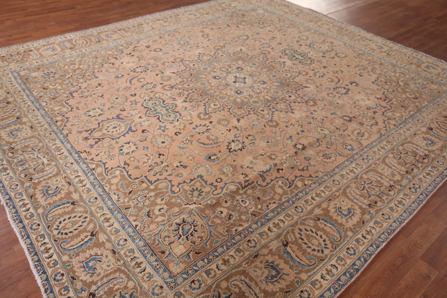 A Beautiful Genuine Persia ( Persia ) Mashad rug is Hand Knotted by skillful weavers in Persia ( Persia ) with 100% Wool Material. This rug is in Very Good (Evenly Low Pile) condition. dimensions are 10' 7'' X 9' 3'' in foot and 323 X 282 in centimeter. the primary color is Coral.