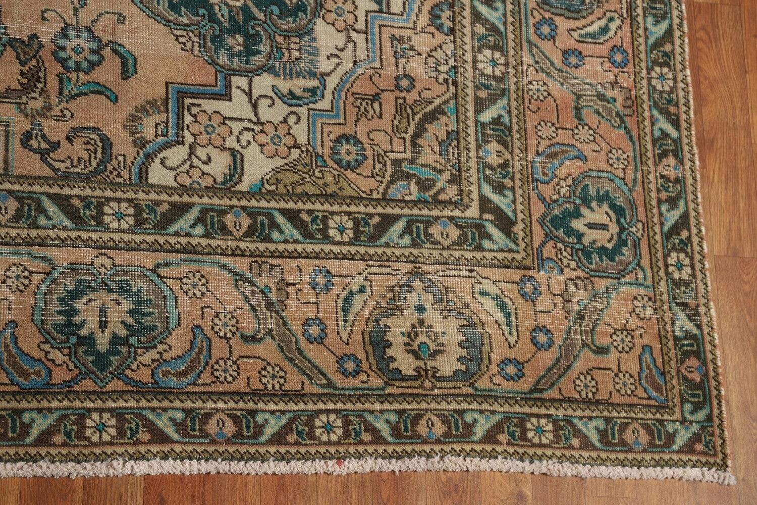A Beautiful Genuine Persia ( Persia ) Tabriz rug is Hand Knotted by skillful weavers in Persia ( Persia ) with 100% Wool Material. This rug is in Very Good (Repair) condition. dimensions are 12' 8'' X 9' 6'' in foot and 386 X 290 in centimeter. the primary color is Peach.