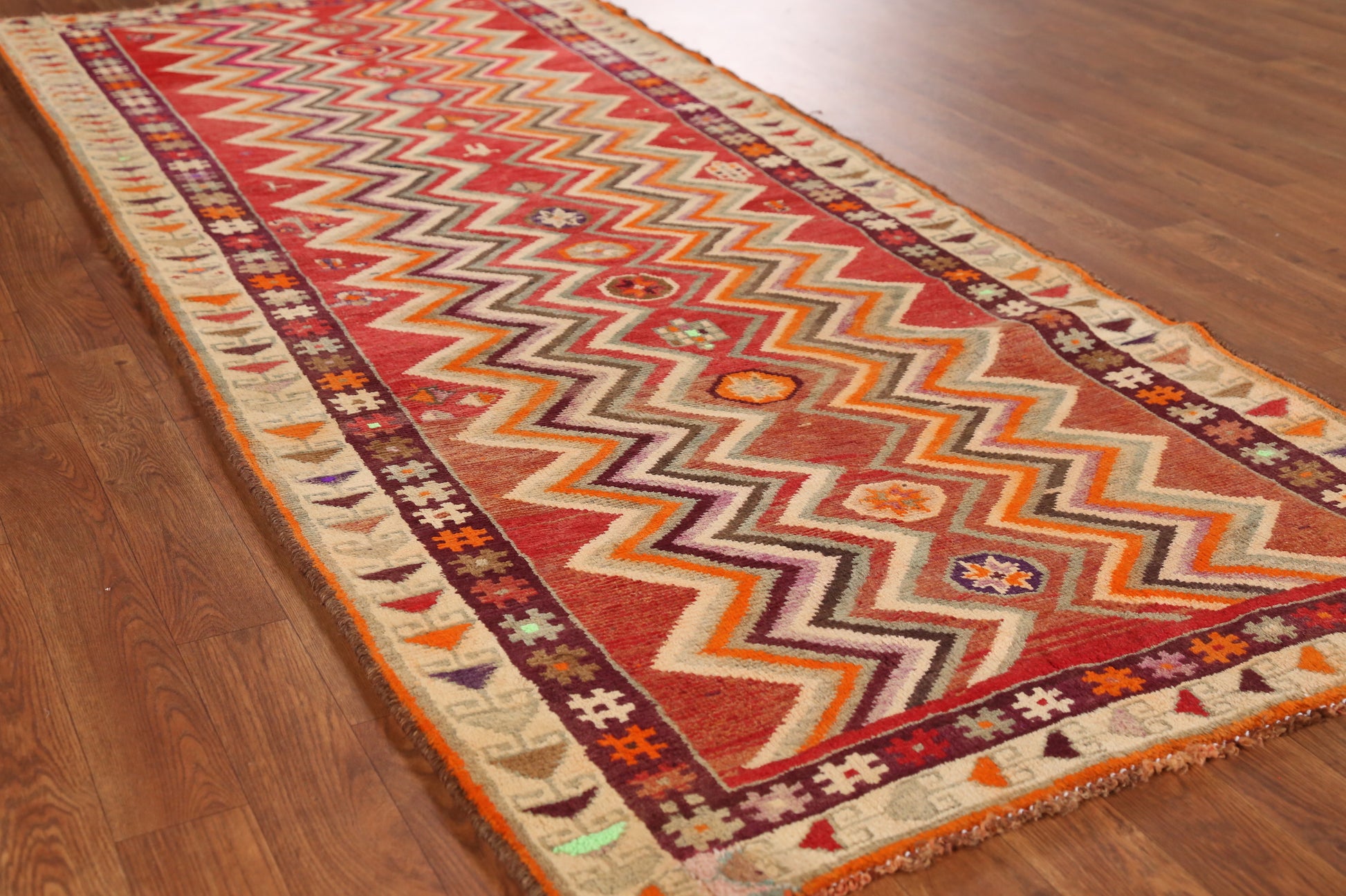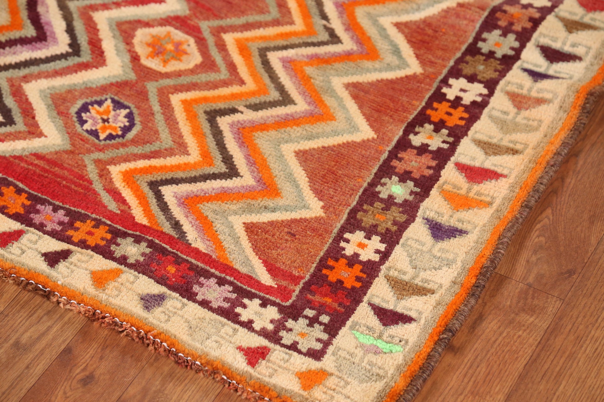 A Beautiful Genuine Persia ( Persia ) Gabbeh rug is Hand Knotted by skillful weavers in Persia ( Persia ) with 100% Wool Material. This rug is in Very Good (Abrash) condition. dimensions are 7' 7'' X 3' 3'' in foot and 231 X 99 in centimeter. the primary color is Oranges & Rust.