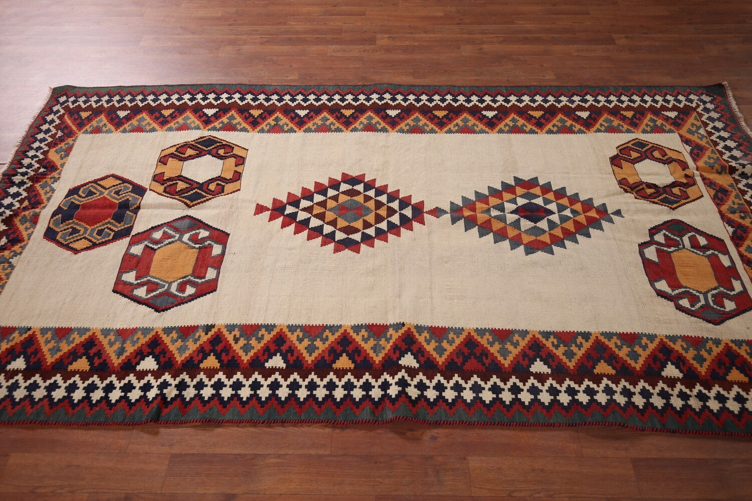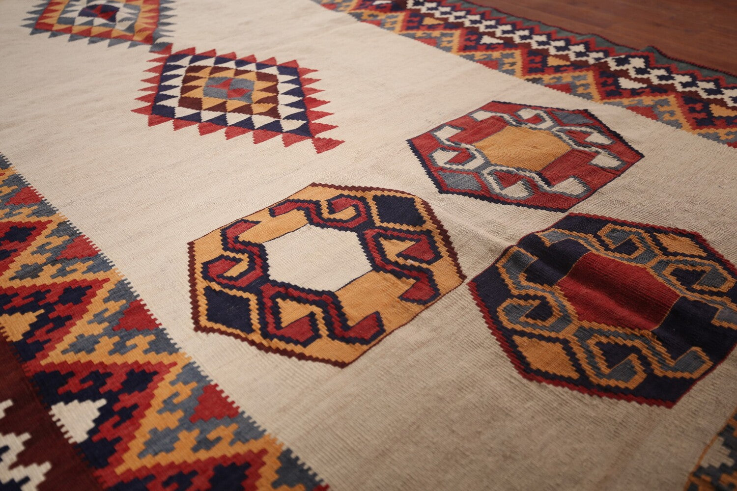 A Beautiful Genuine Persia ( Persia ) Kilim (Qashqai) rug is Hand Woven by skillful weavers in Persia ( Persia ) with 100% Wool Material. This rug is in Very Good (Abrash) condition. dimensions are 8' 1'' X 4' 5'' in foot and 246 X 135 in centimeter. the primary color is Beige & Ivories.