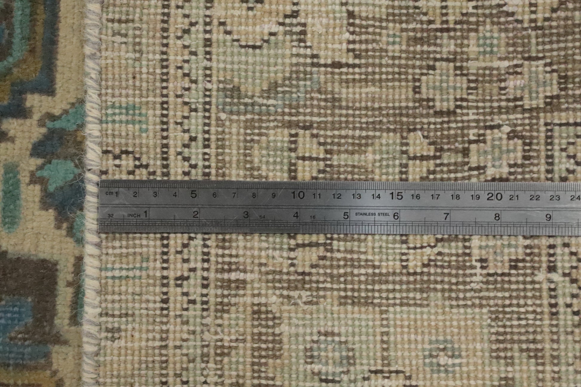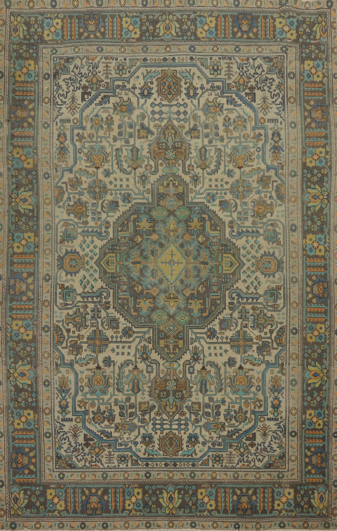 A Beautiful Genuine Persia ( Persia ) Tabriz rug is Hand Knotted by skillful weavers in Persia ( Persia ) with 100% Wool Material. This rug is in Very Good (Evenly Low Pile) condition. dimensions are 9' 6'' X 6' 8'' in foot and 290 X 203 in centimeter. the primary color is Beige & Ivories.