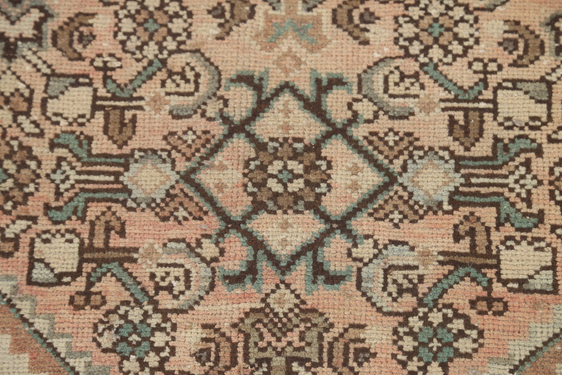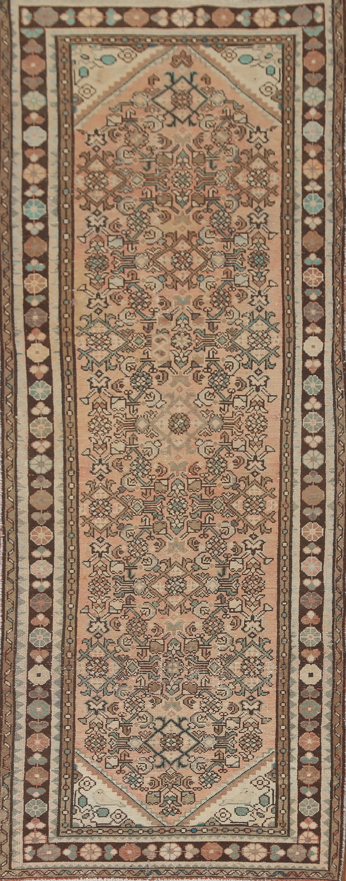 A Beautiful Genuine Persia ( Persia ) Hamedan rug is Hand Knotted by skillful weavers in Persia ( Persia ) with 100% Wool Material. This rug is in Very Good (Evenly Low Pile-Repair) condition. dimensions are 9' 11'' X 3' 5'' in foot and 302 X 104 in centimeter. the primary color is Peach.