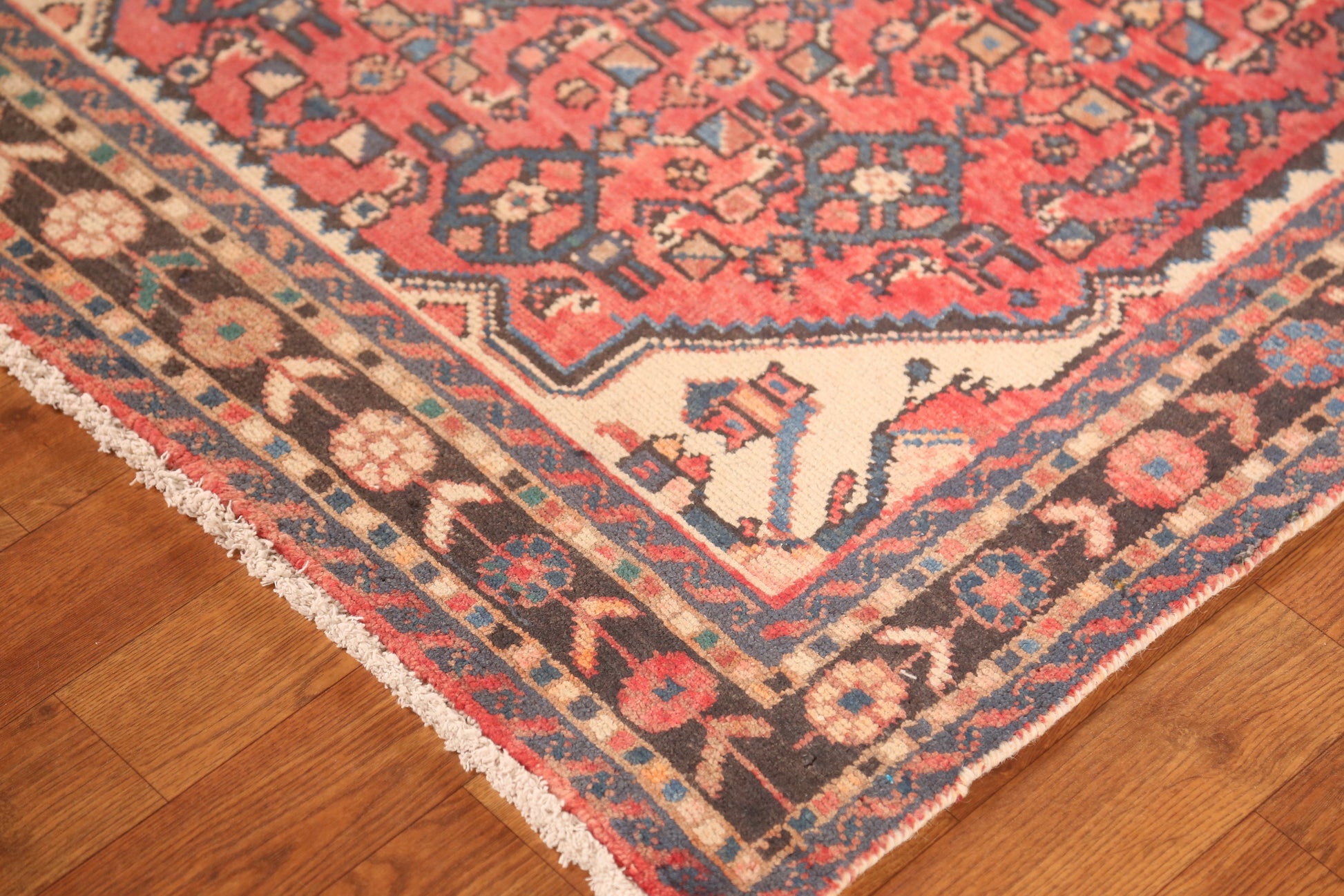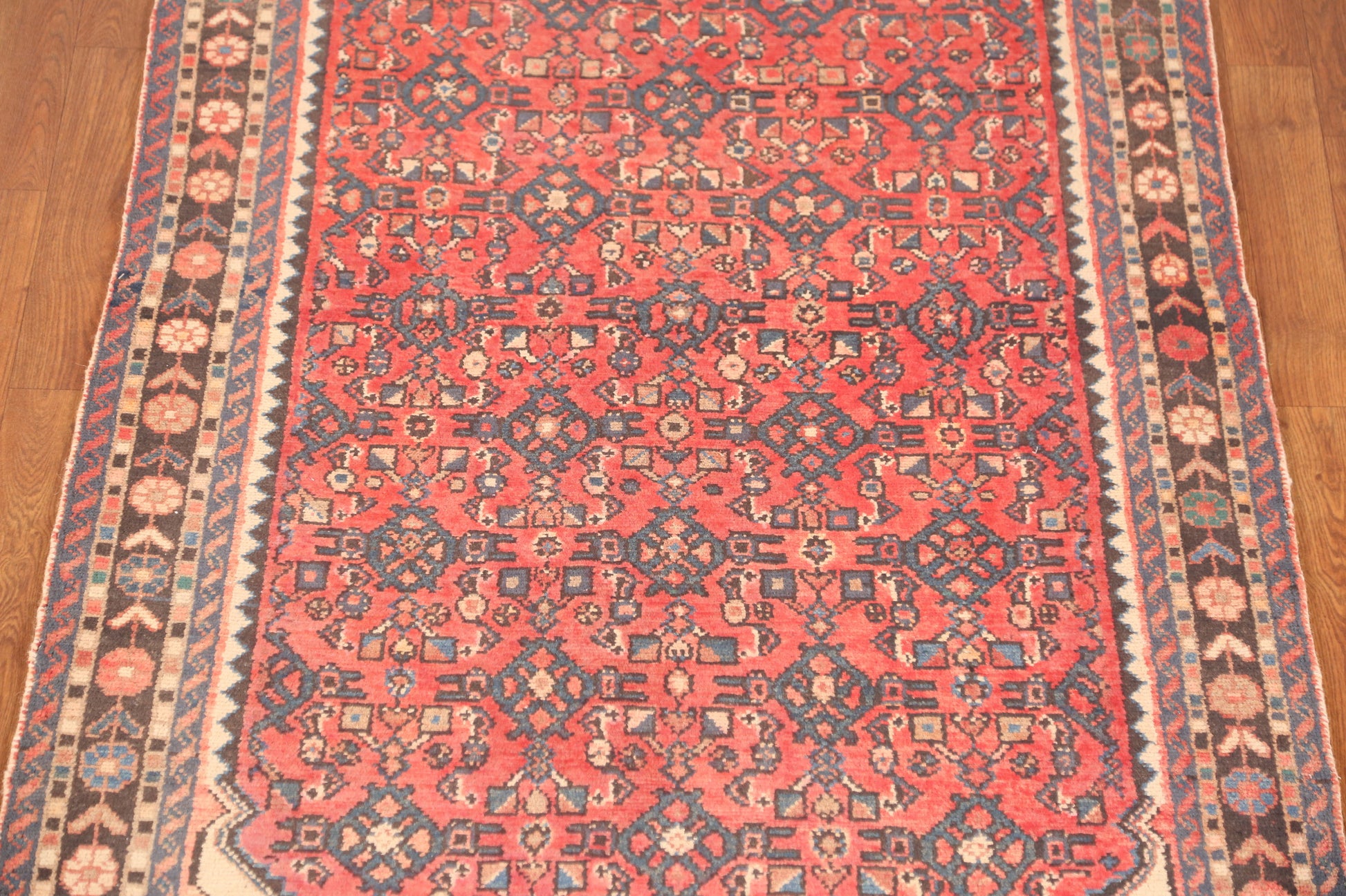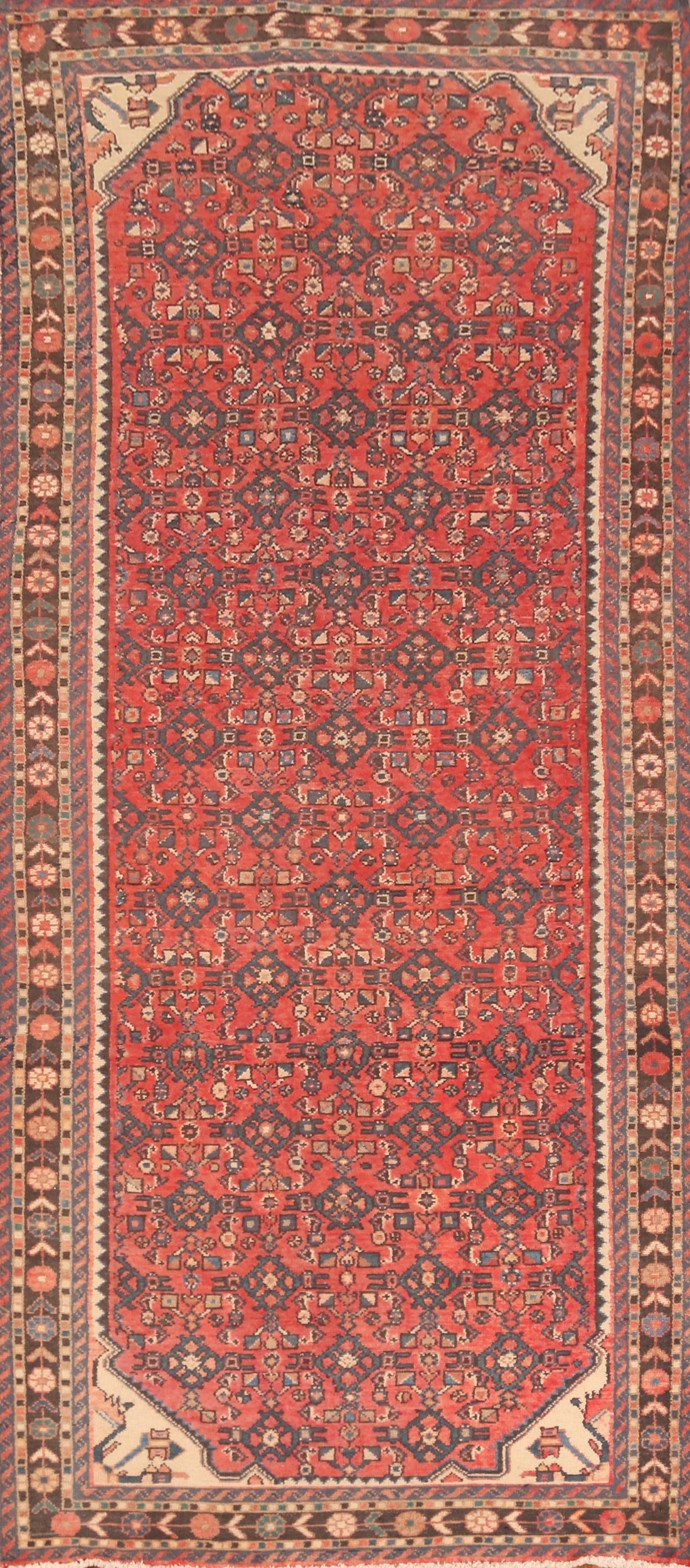 A Beautiful Genuine Persia ( Persia ) Hamedan rug is Hand Knotted by skillful weavers in Persia ( Persia ) with 100% Wool Material. This rug is in Very Good condition. dimensions are 9' 10'' X 3' 6'' in foot and 300 X 107 in centimeter. the primary color is Oranges & Rust.