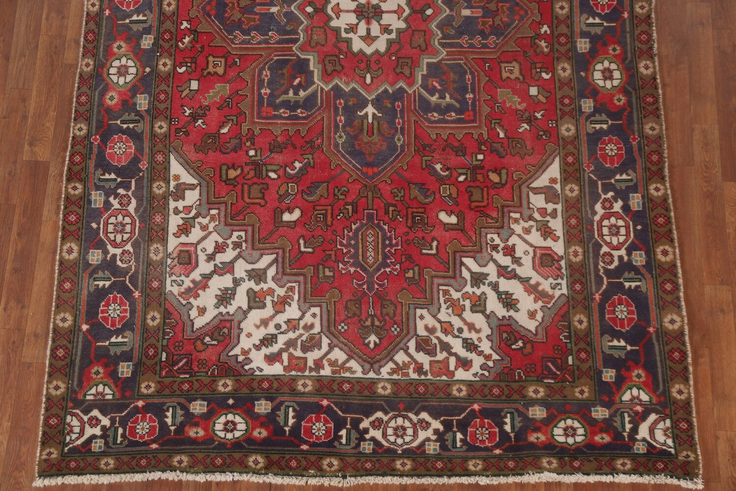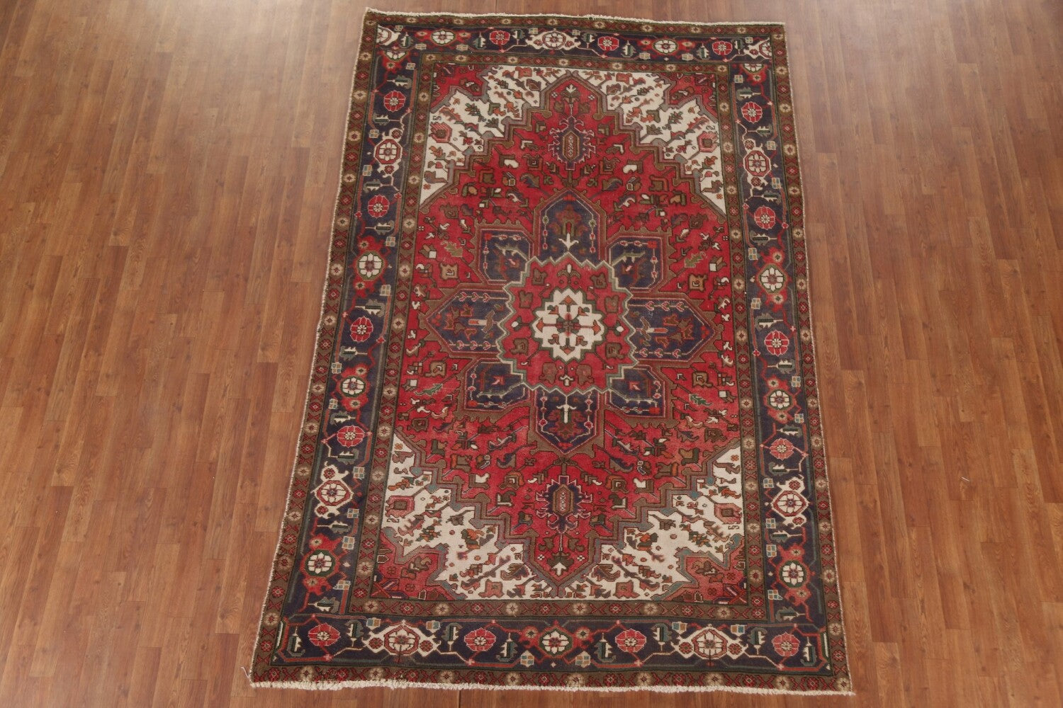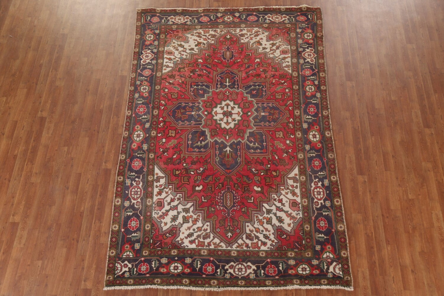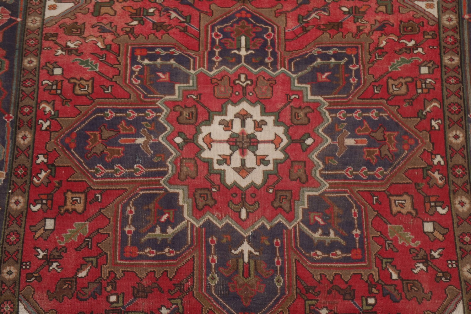 A Beautiful Genuine Persia ( Persia ) Heriz rug is Hand Knotted by skillful weavers in Persia ( Persia ) with 100% Wool Material. This rug is in Very Good (Evenly Low Pile) condition. dimensions are 9' 6'' X 6' 3'' in foot and 290 X 191 in centimeter. the primary color is Red.