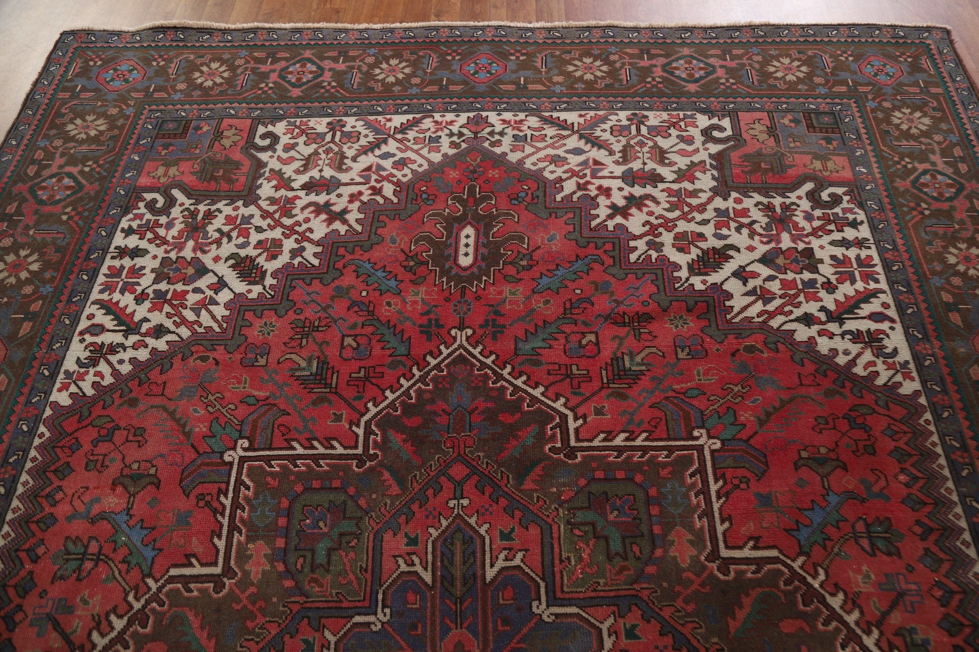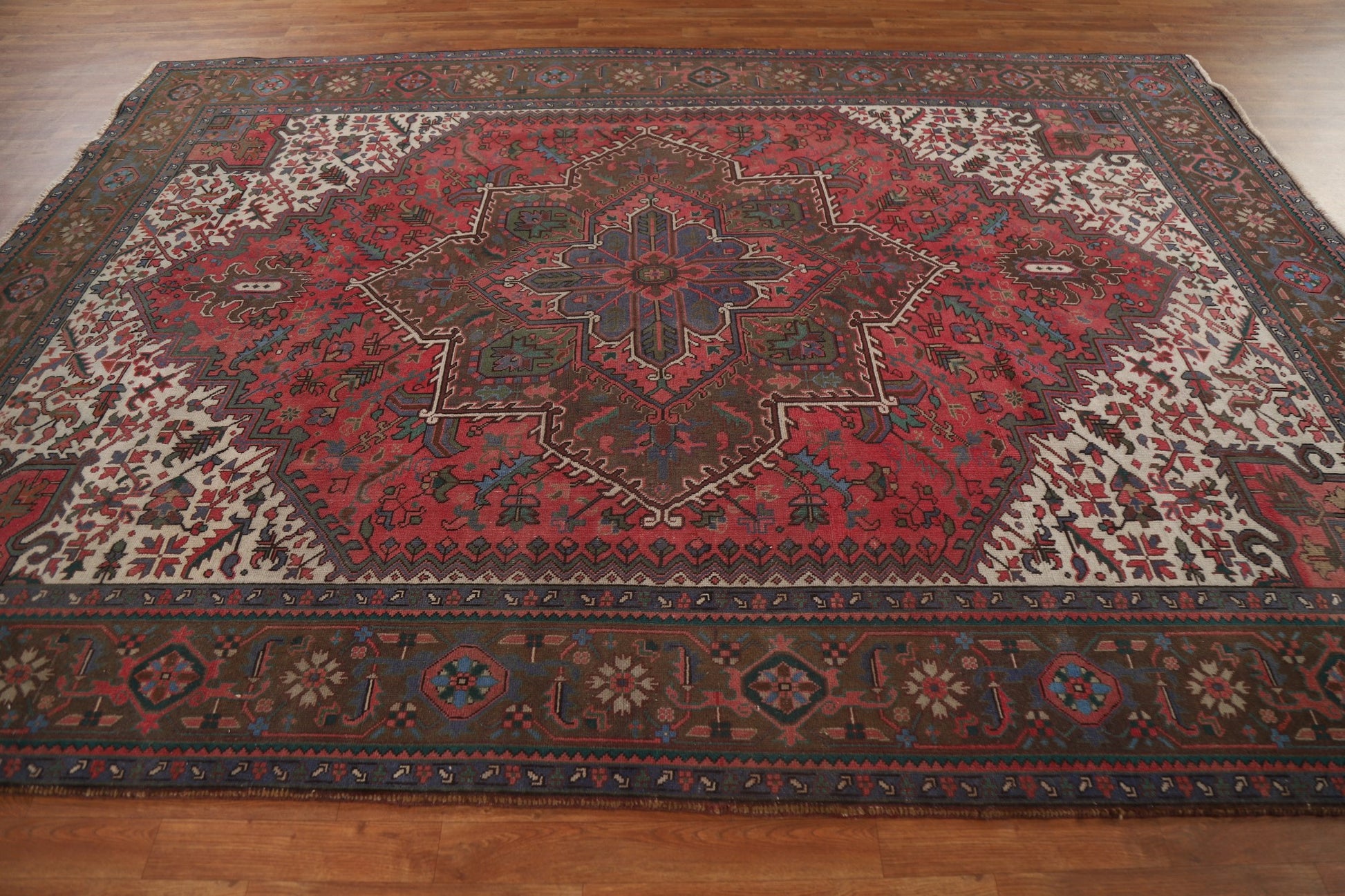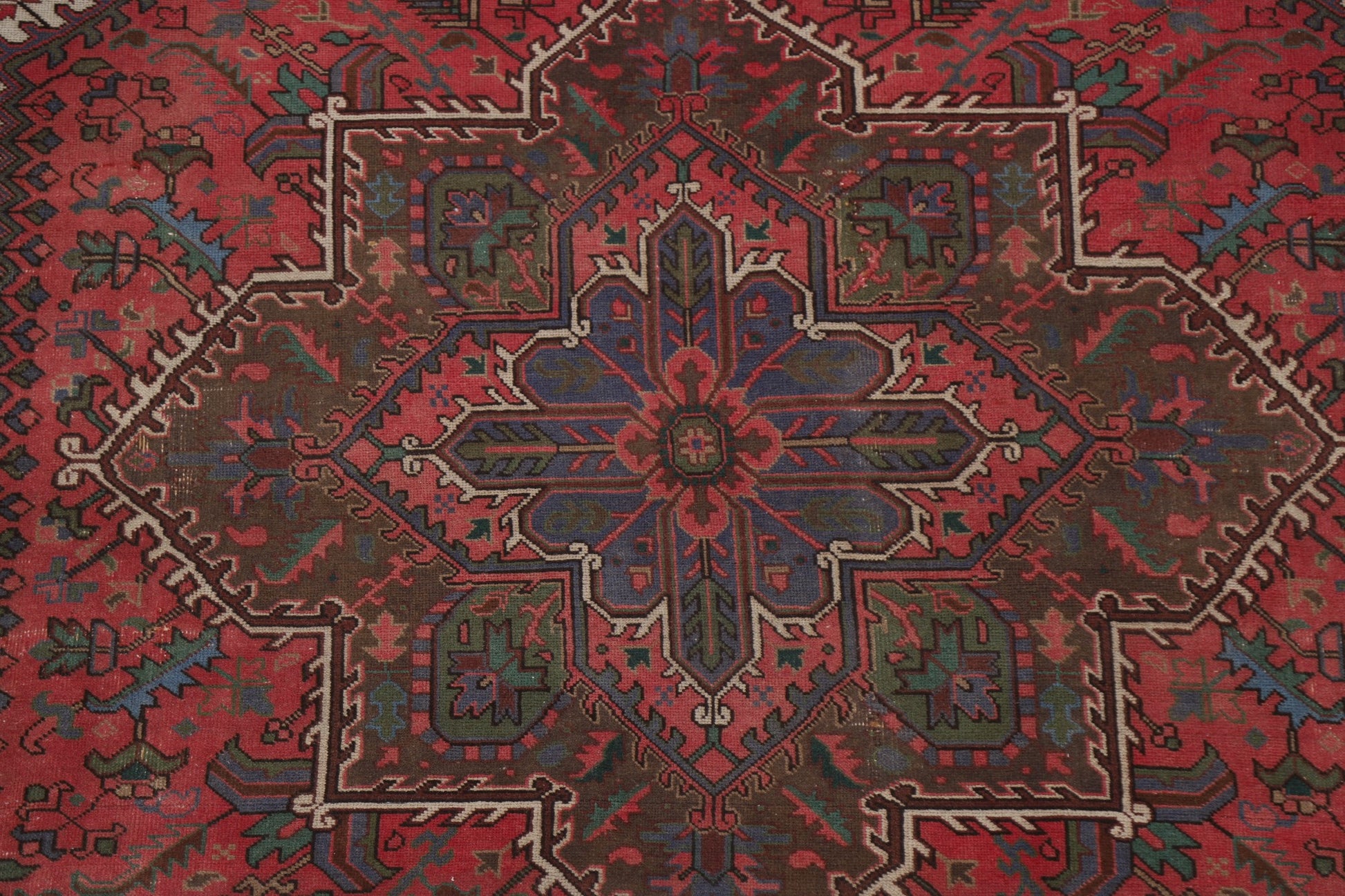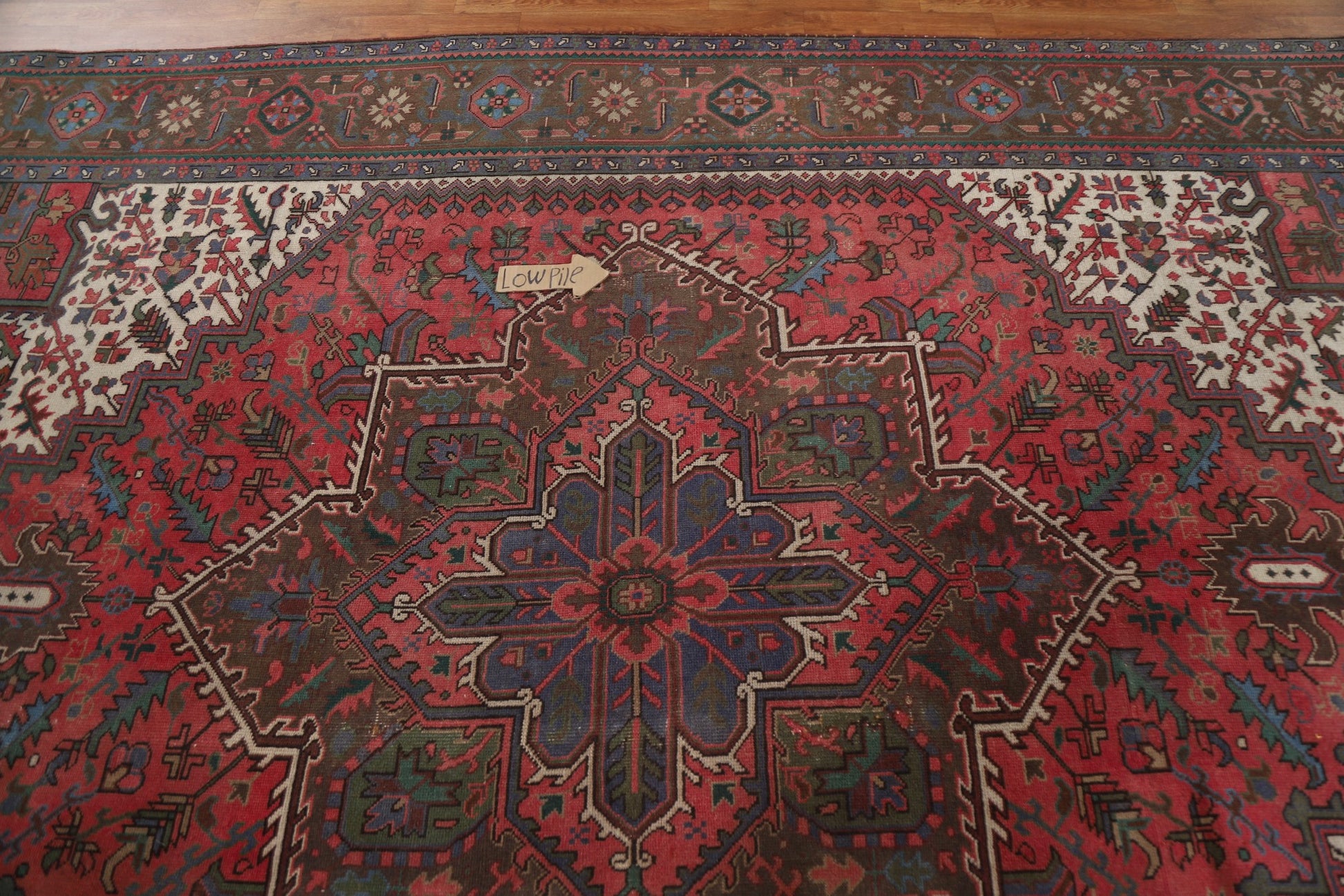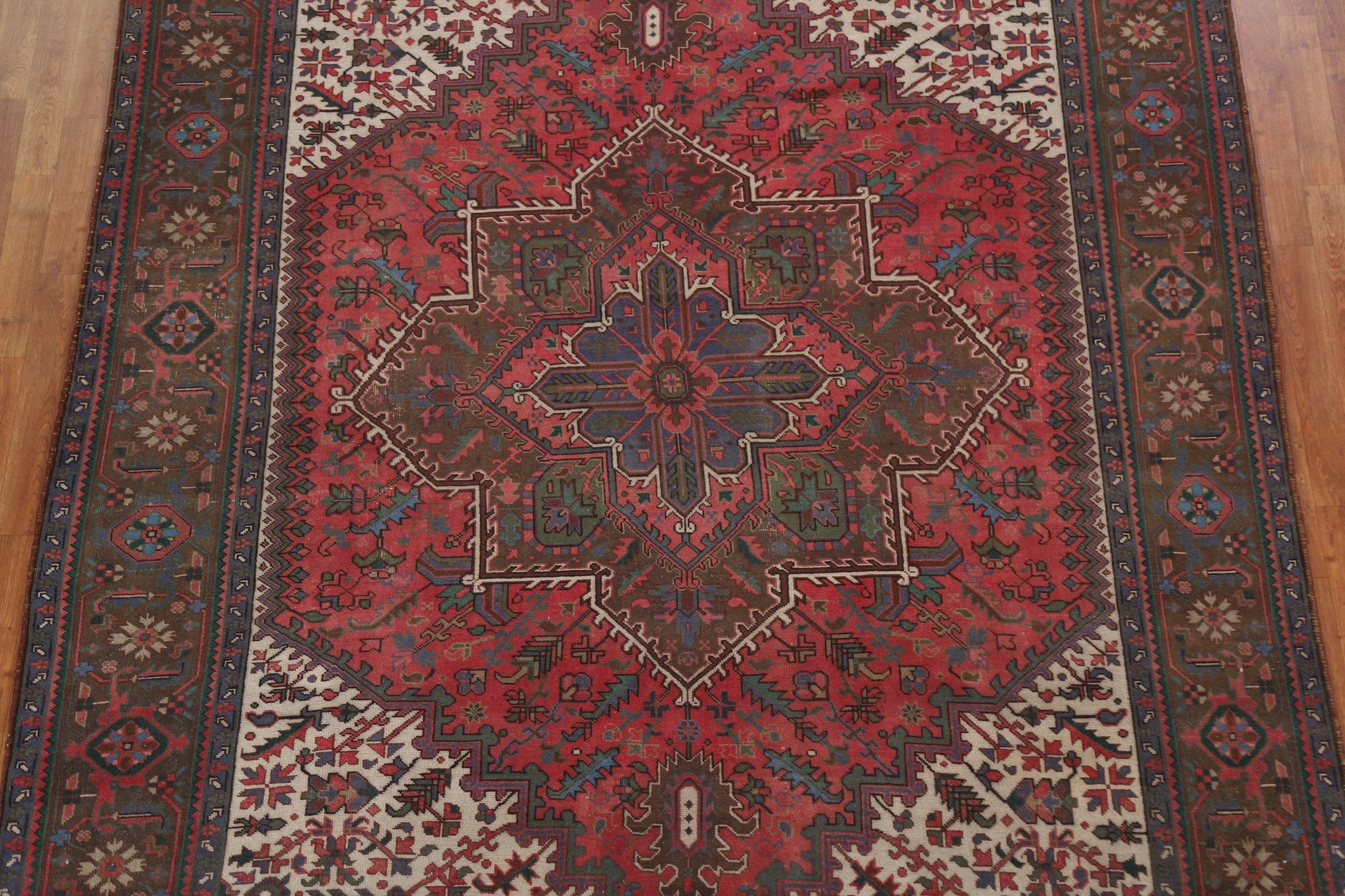 A Beautiful Genuine Persia ( Persia ) Heriz rug is Hand Knotted by skillful weavers in Persia ( Persia ) with 100% Wool Material. This rug is in Very Good ( Low Pile ) condition. dimensions are 11' 0'' X 8' 0'' in foot and 335 X 244 in centimeter. the primary color is Pink.