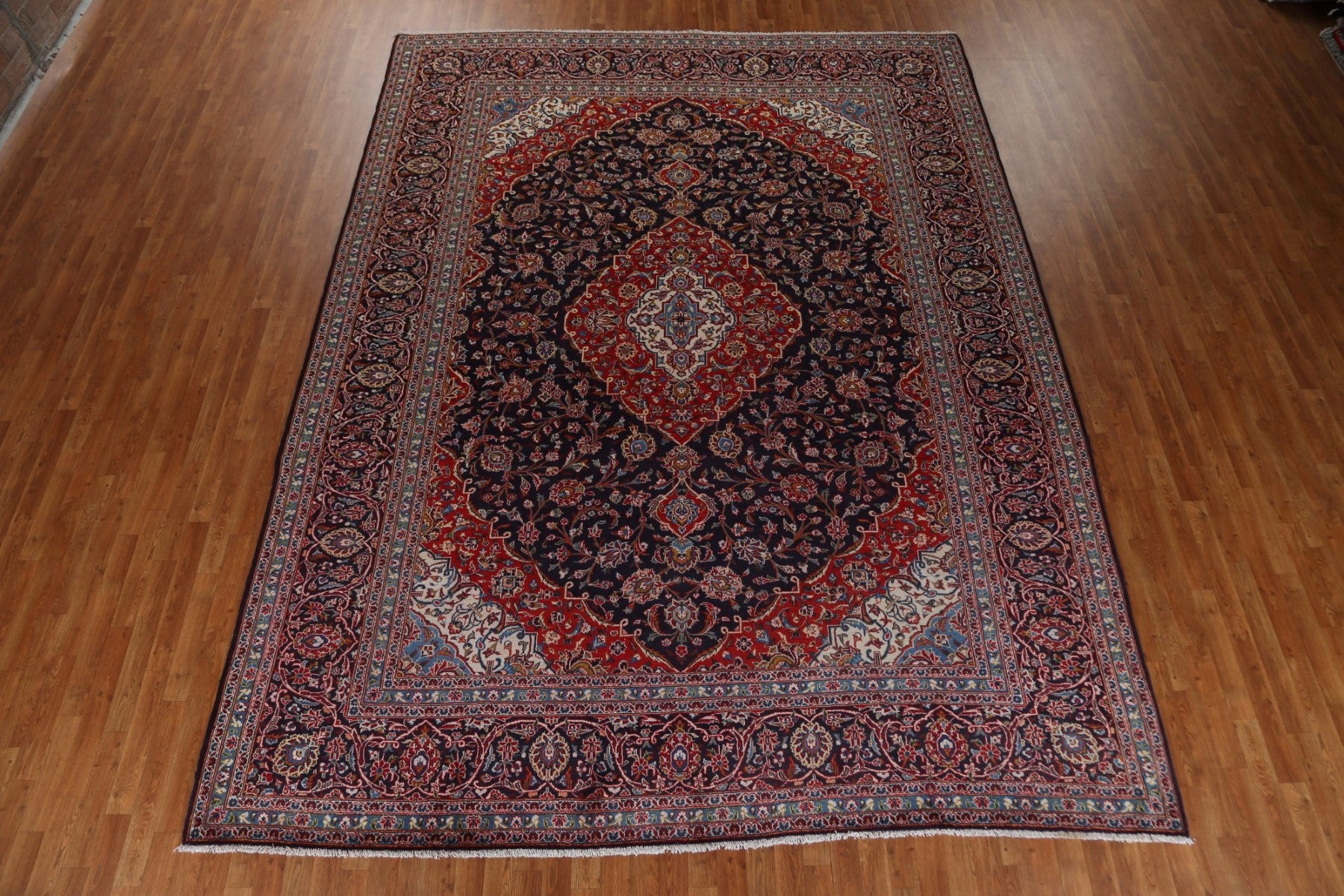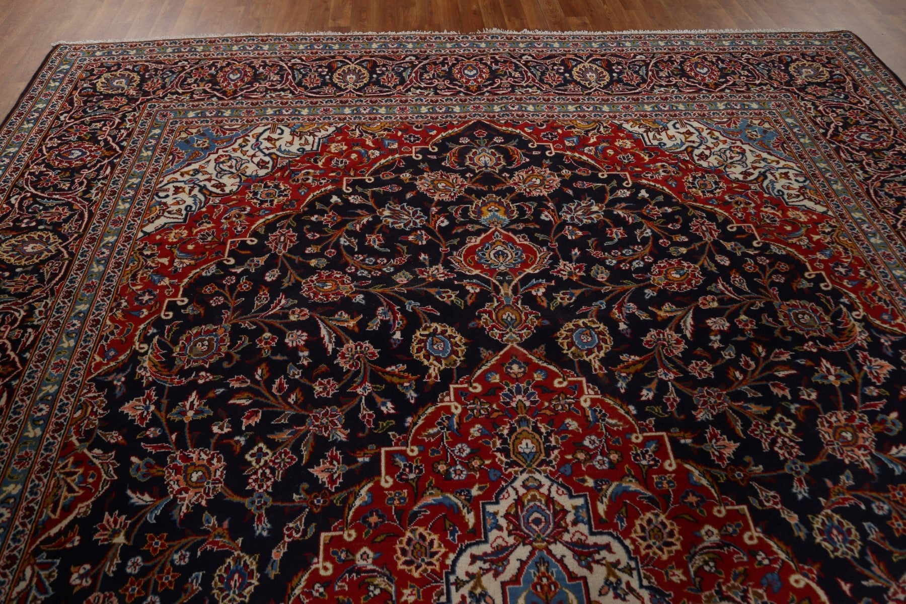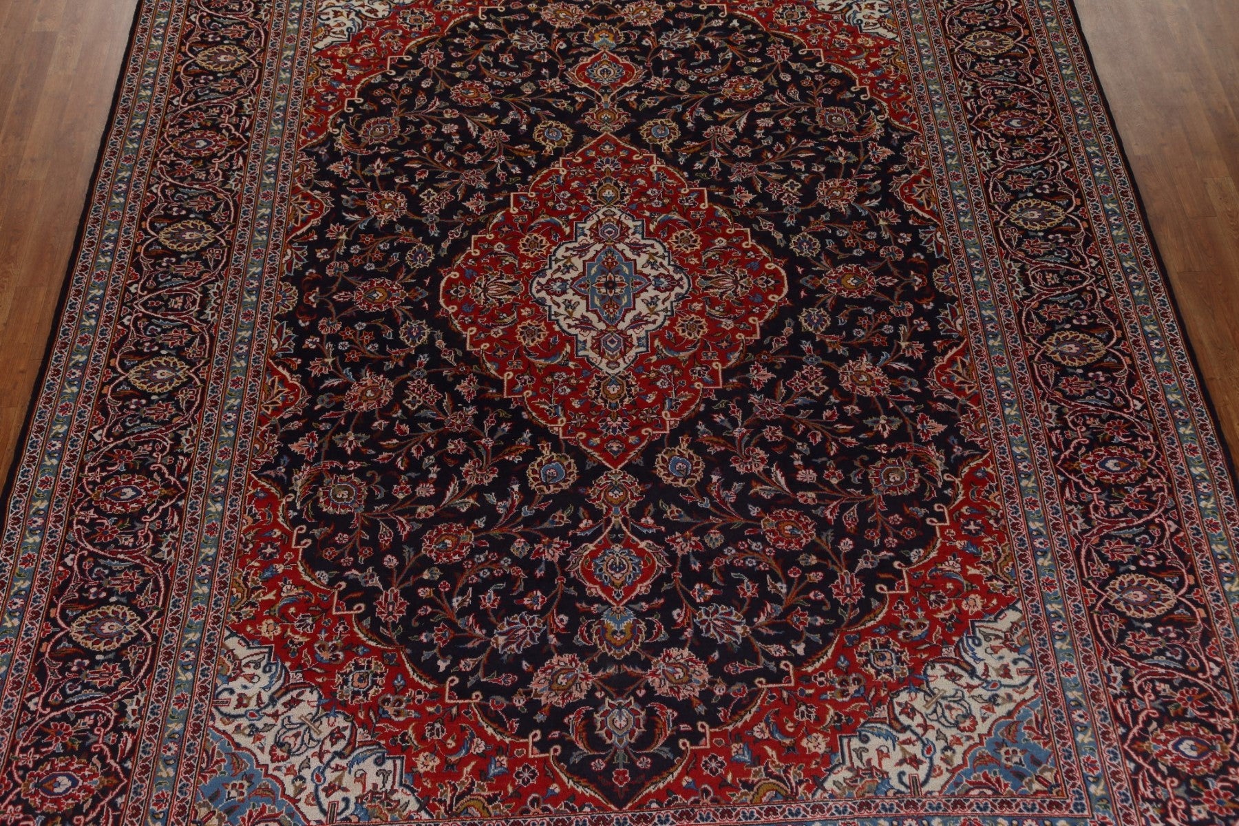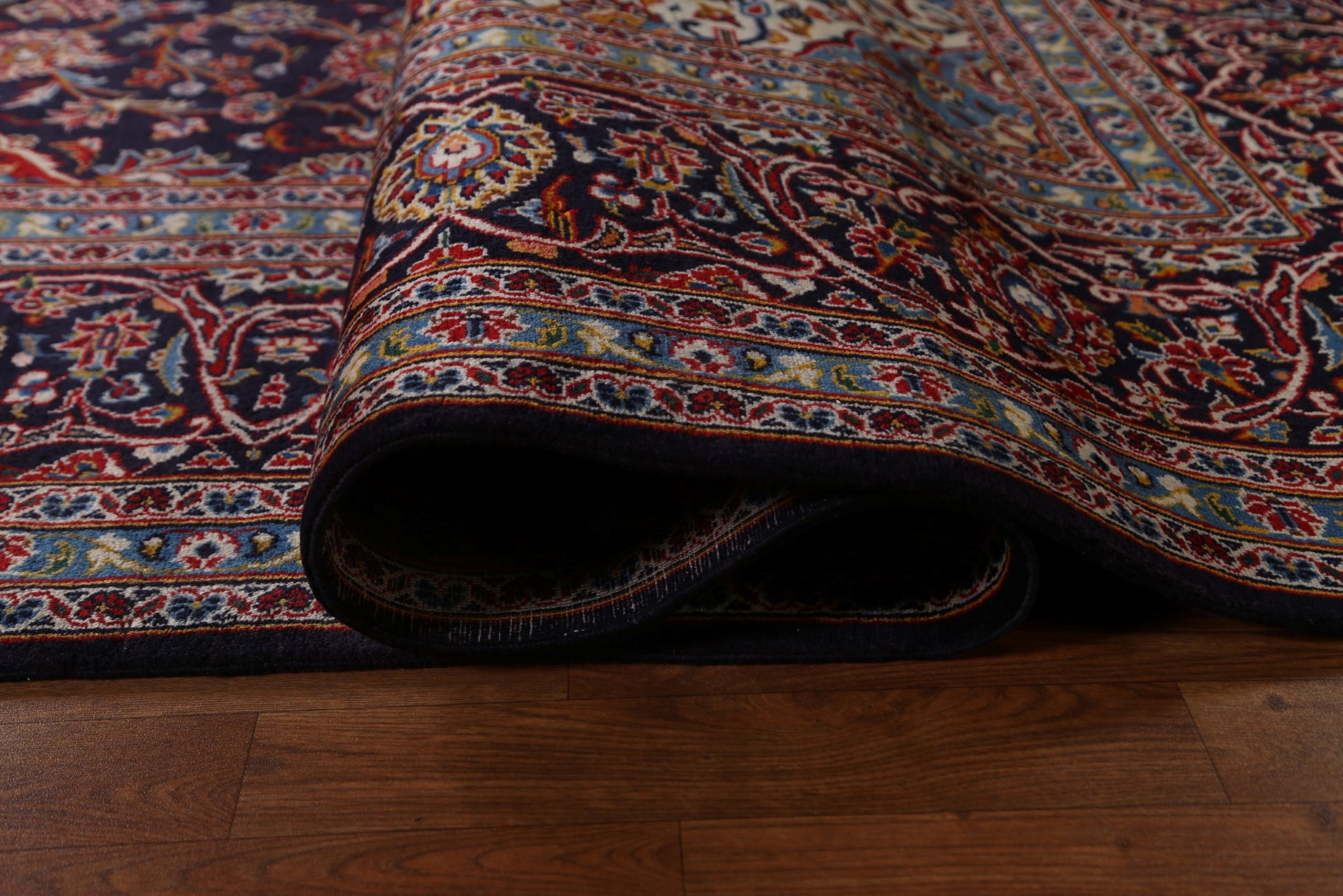 A Beautiful Genuine Persia ( Persia ) Kashan rug is Hand Knotted by skillful weavers in Persia ( Persia ) with 100% Wool Material. This rug is in Excellent condition. dimensions are 13' 1'' X 9' 11'' in foot and 399 X 302 in centimeter. the primary color is Navy Blue & Blues.