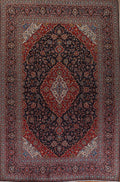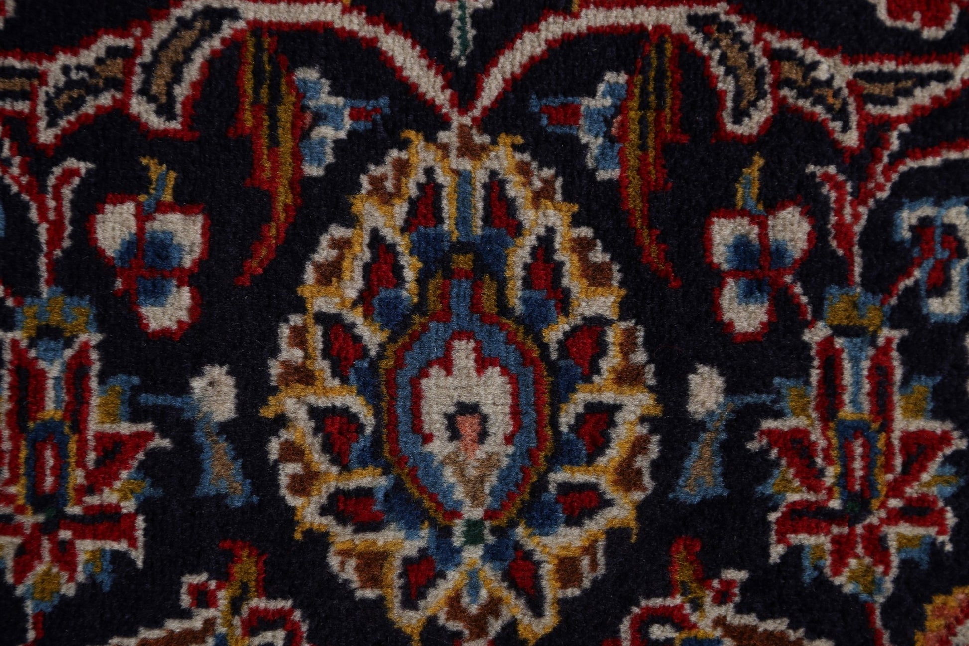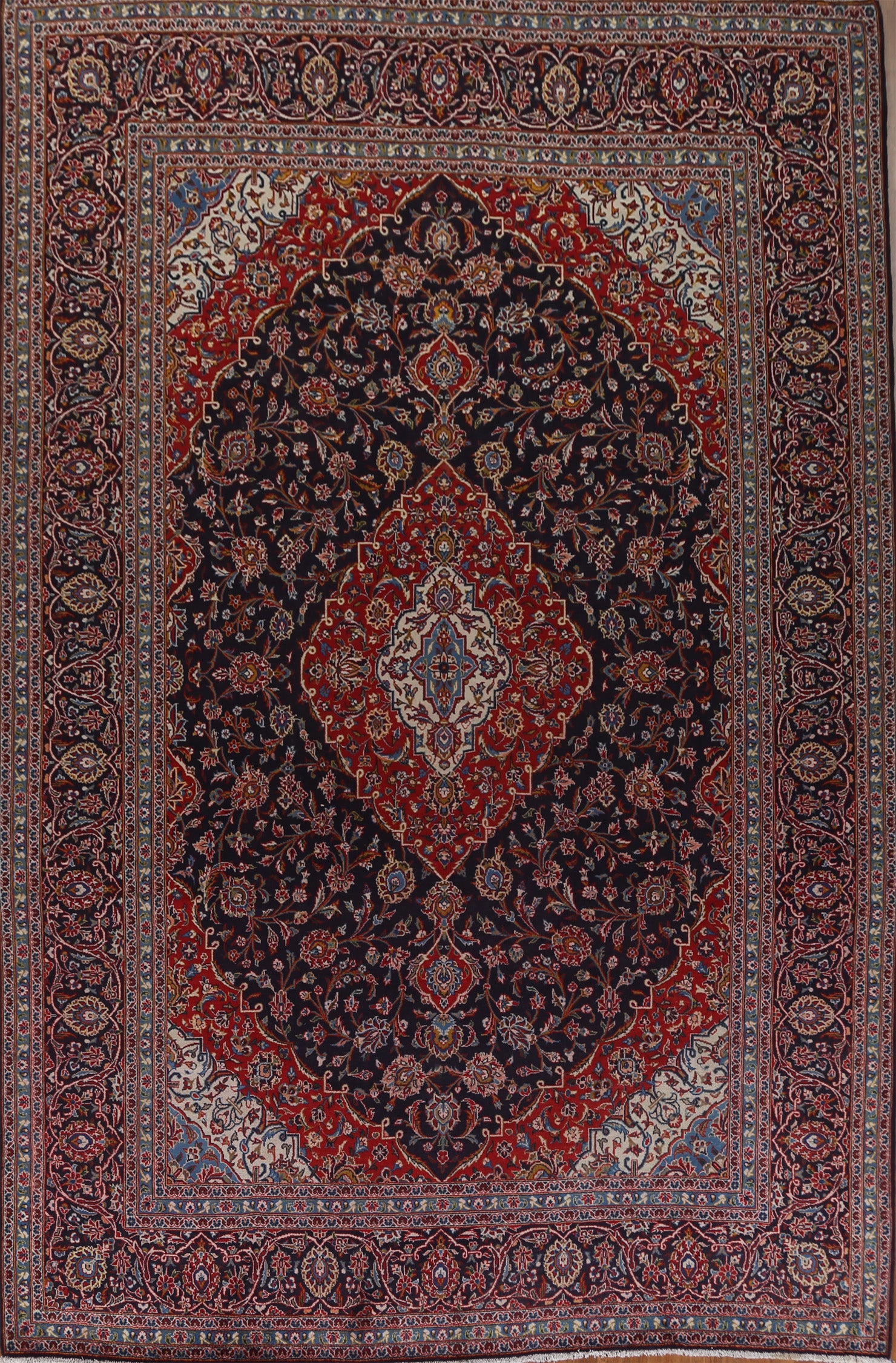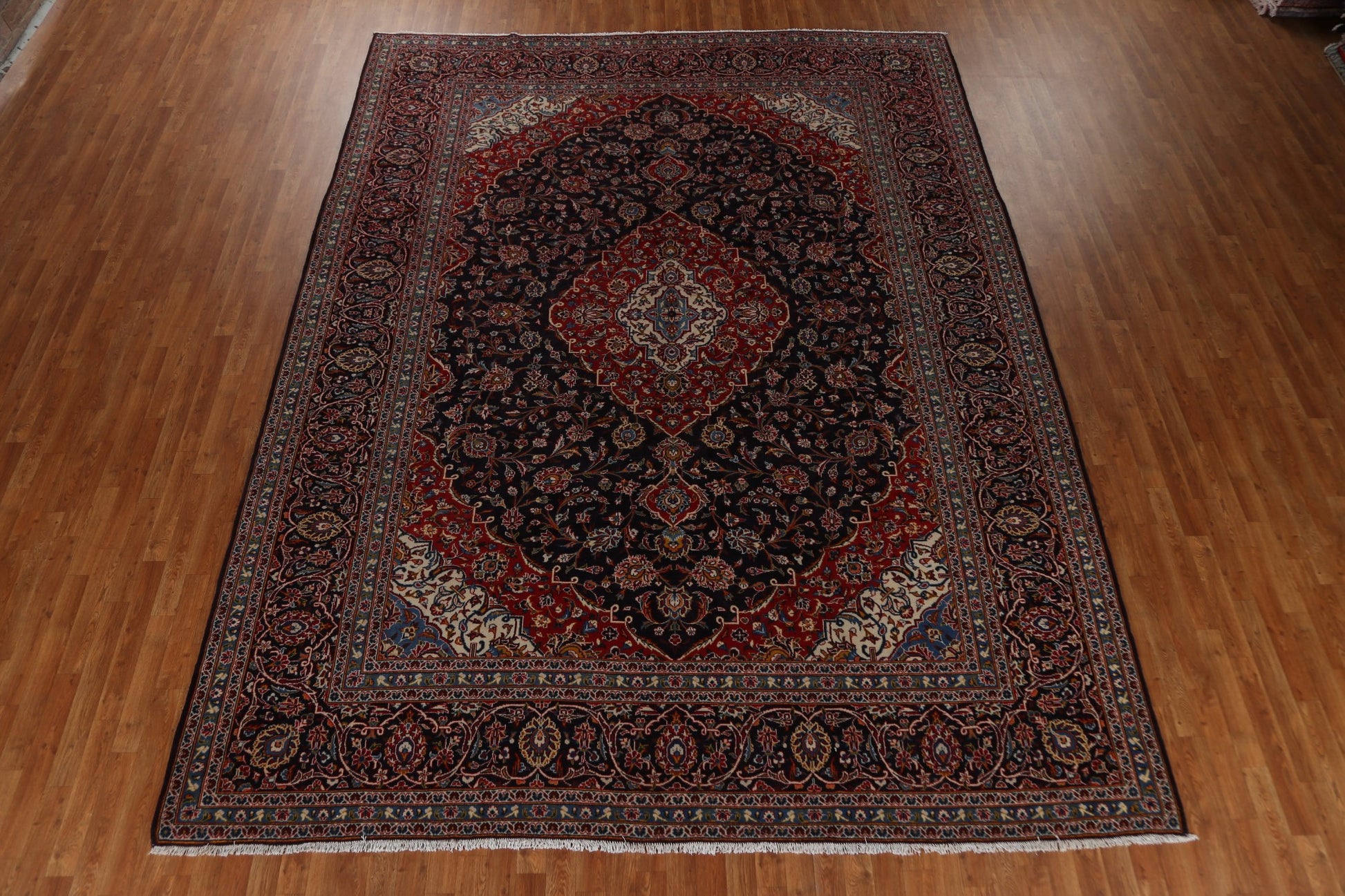 A Beautiful Genuine Persia ( Persia ) Kashan rug is Hand Knotted by skillful weavers in Persia ( Persia ) with 100% Wool Material. This rug is in Excellent condition. dimensions are 13' 1'' X 9' 11'' in foot and 399 X 302 in centimeter. the primary color is Navy Blue & Blues.