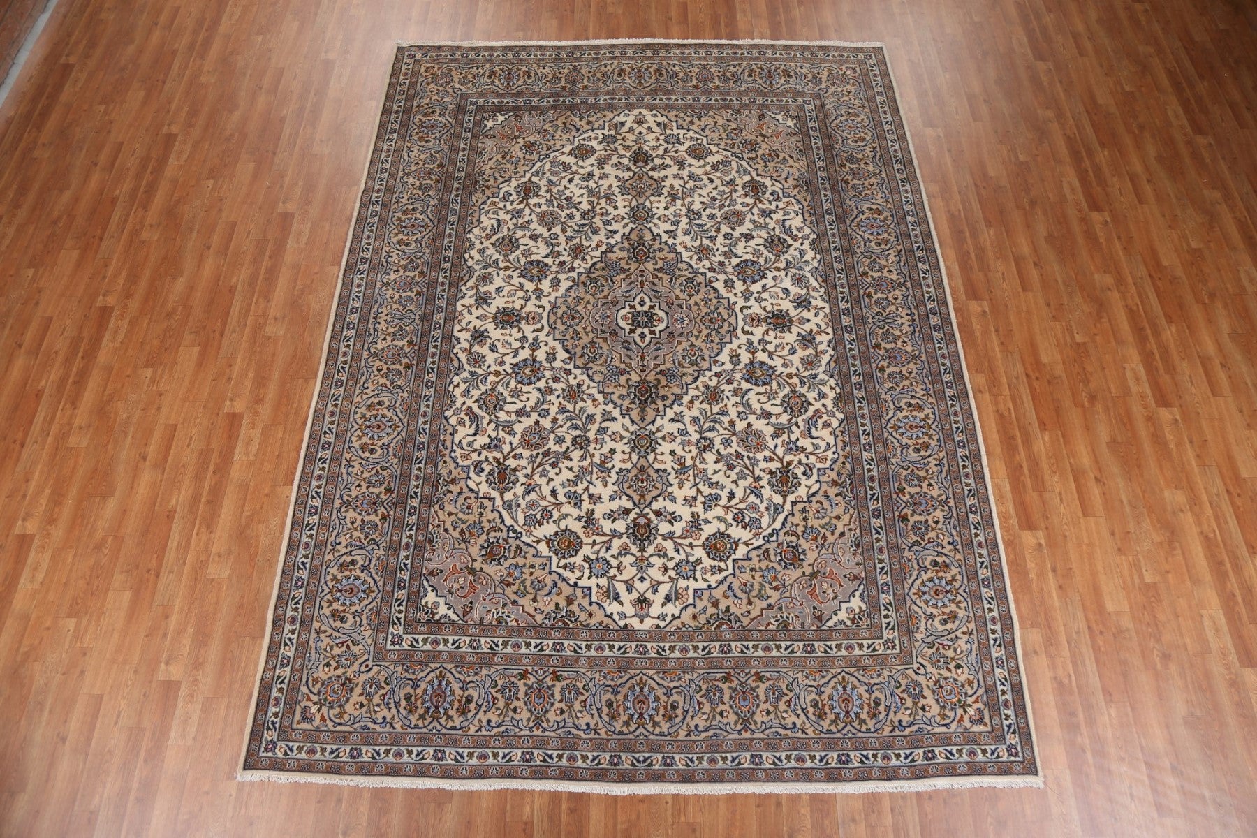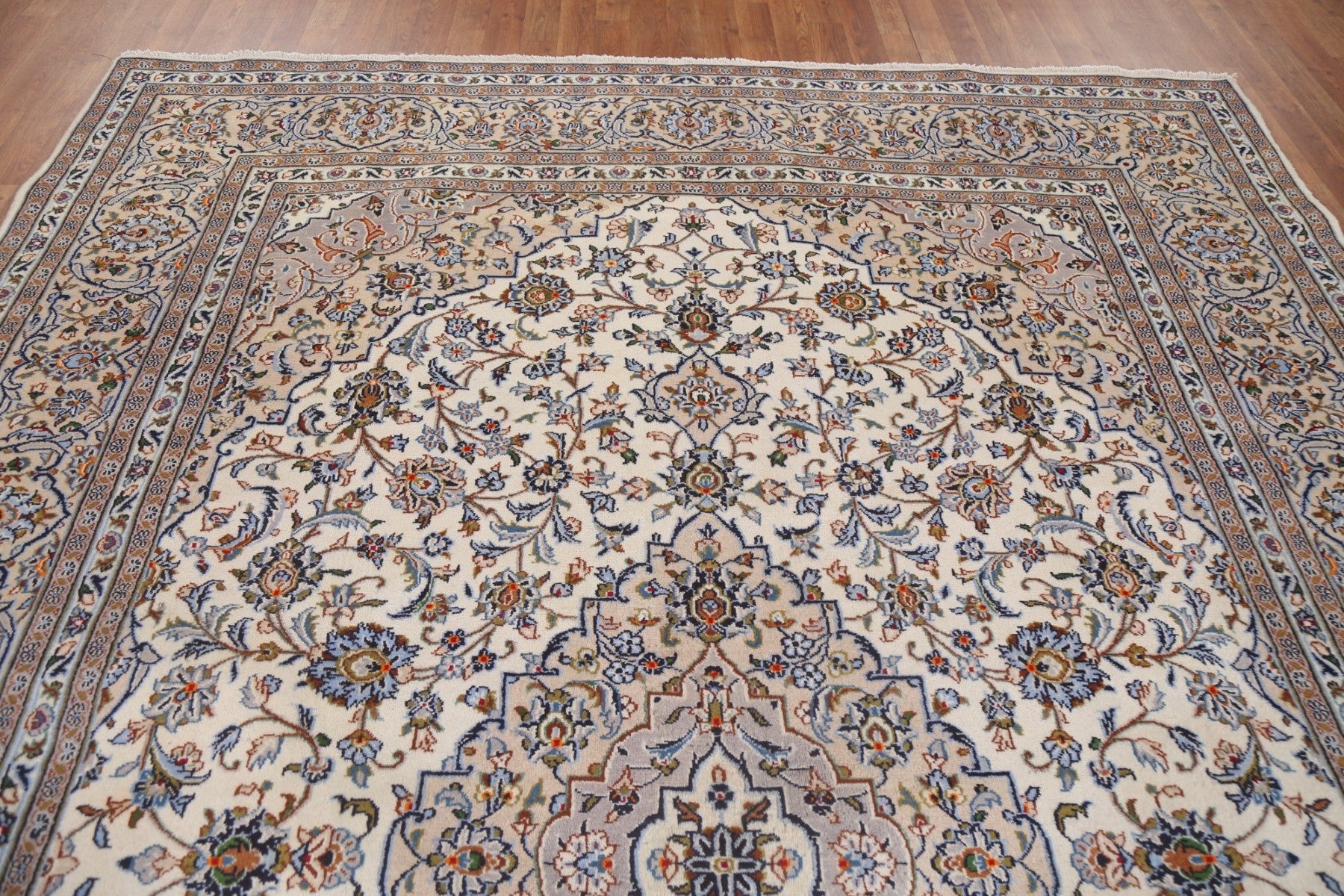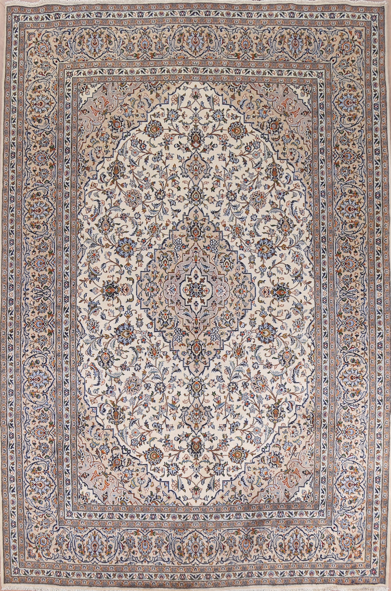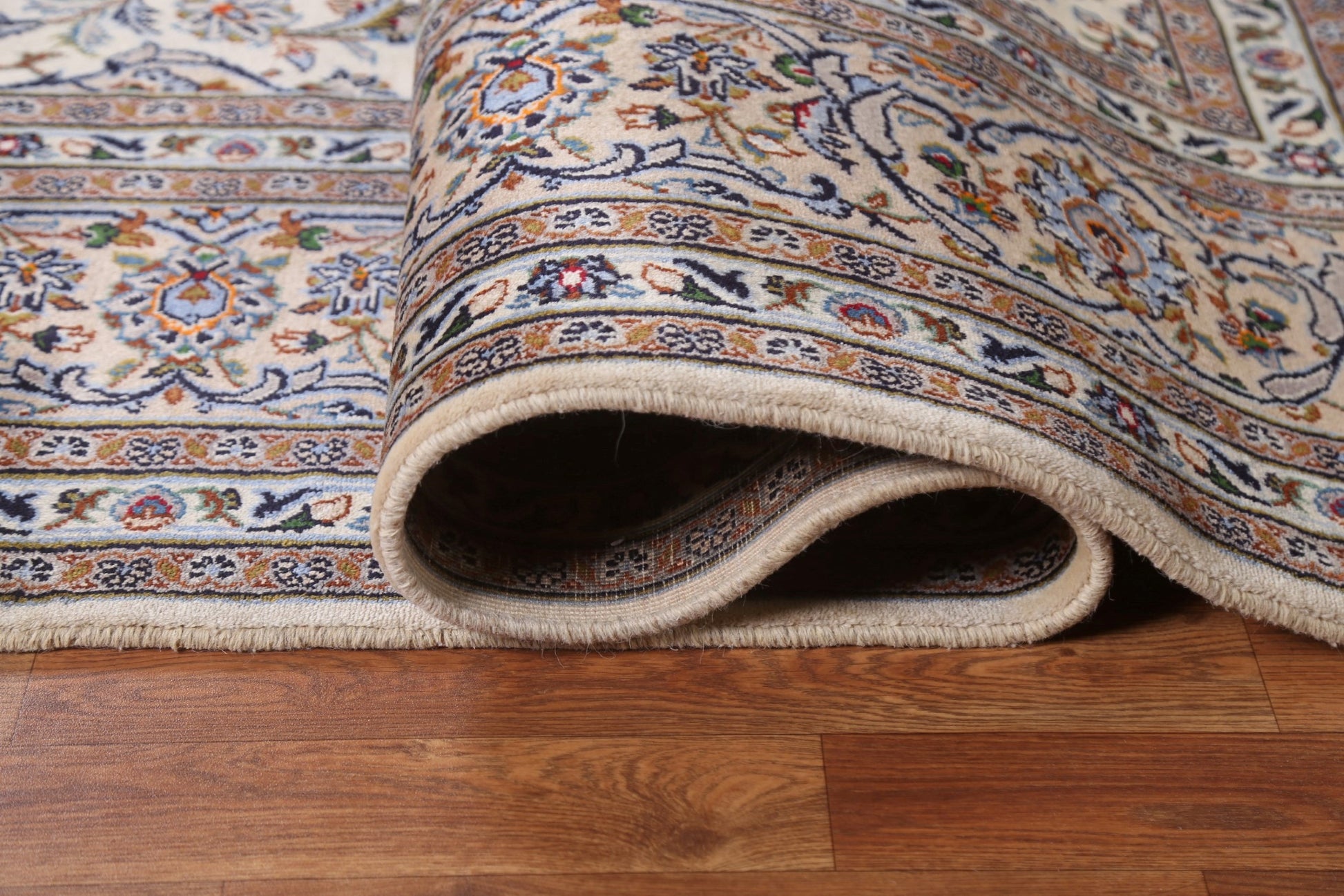 A Beautiful Genuine Persia ( Persia ) Kashan rug is Hand Knotted by skillful weavers in Persia ( Persia ) with 100% Wool Material. This rug is in Very Good condition. dimensions are 11' 2'' X 8' 3'' in foot and 340 X 251 in centimeter. the primary color is Beige & Ivories.