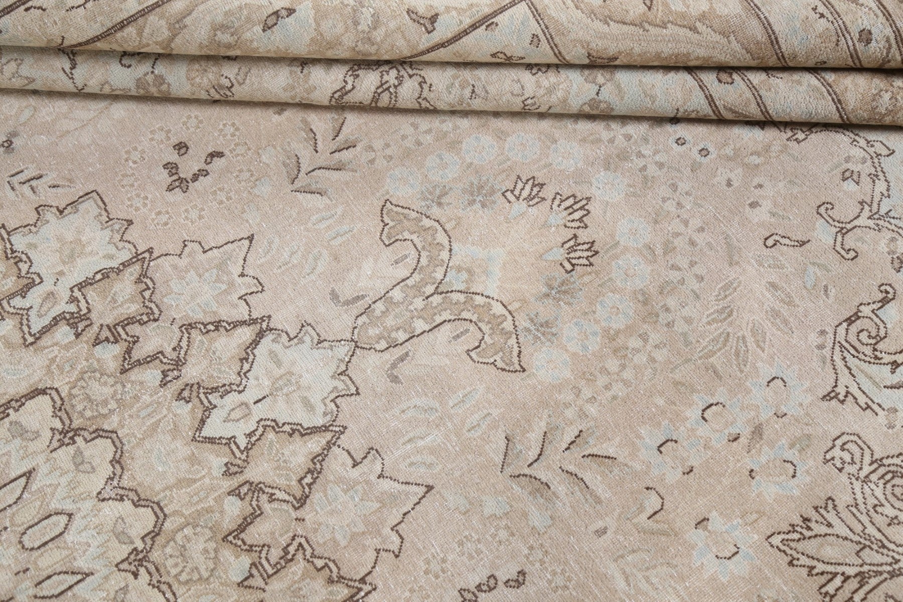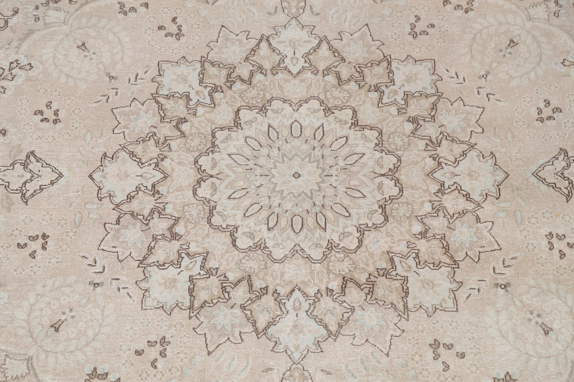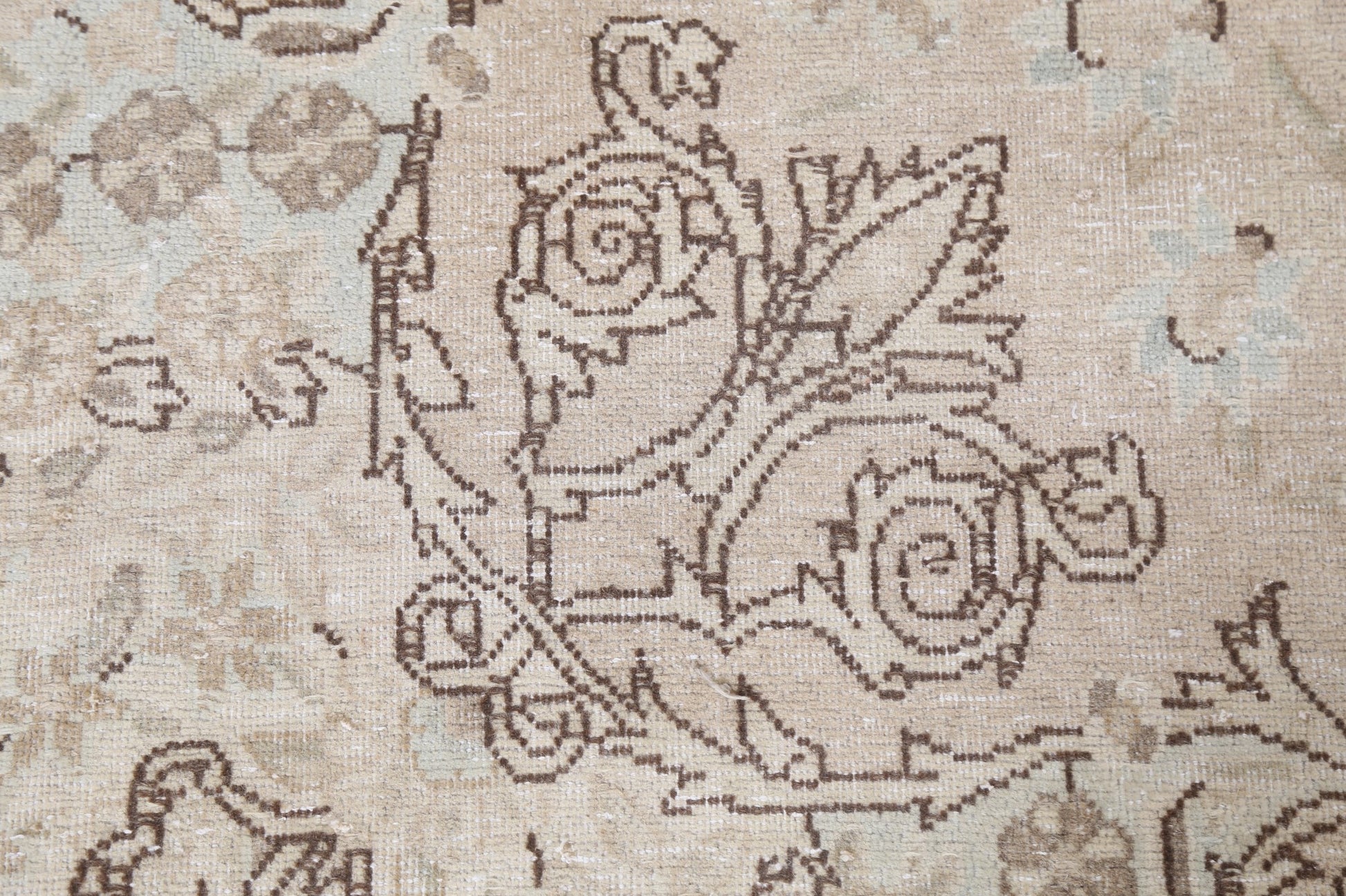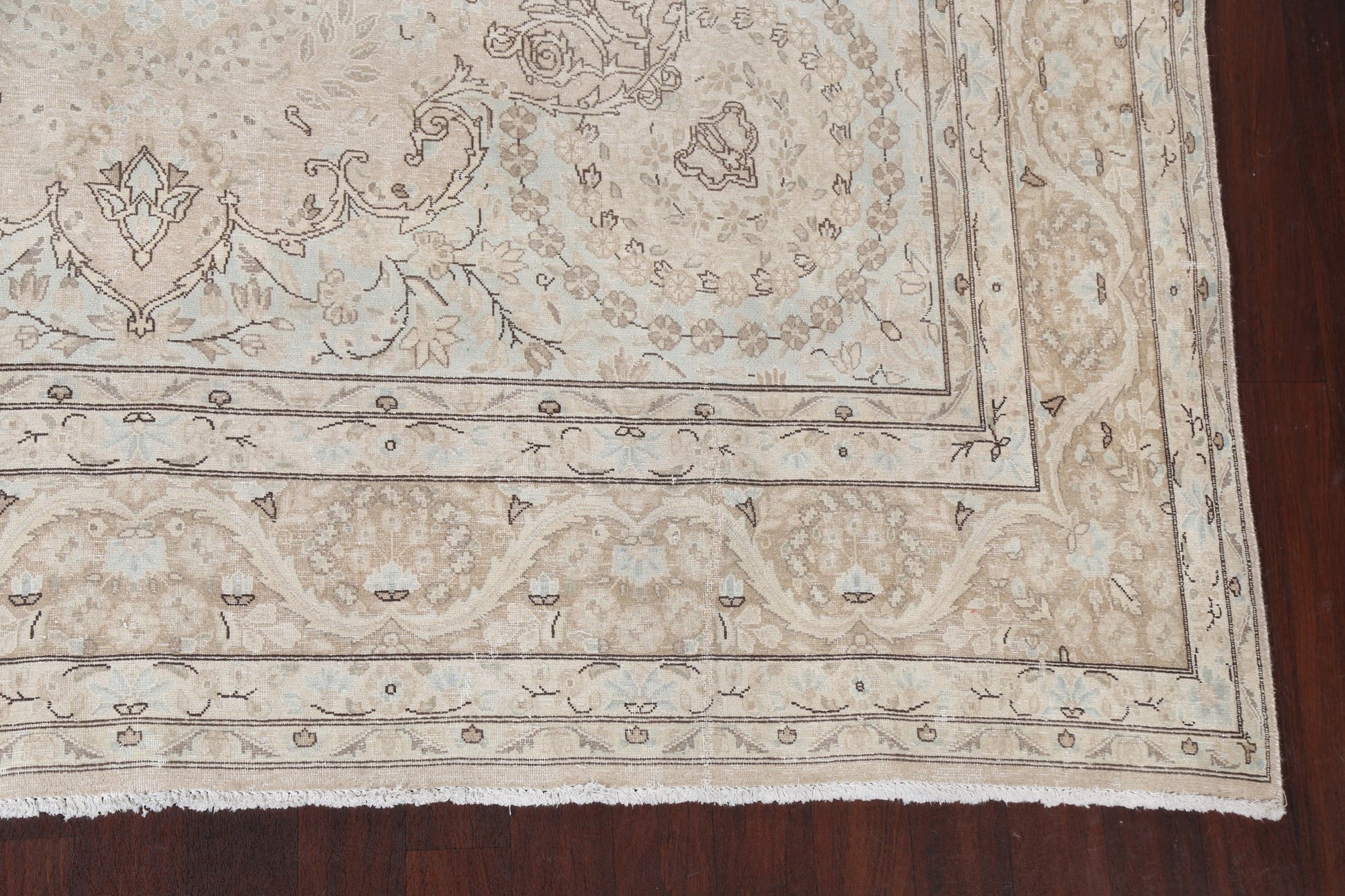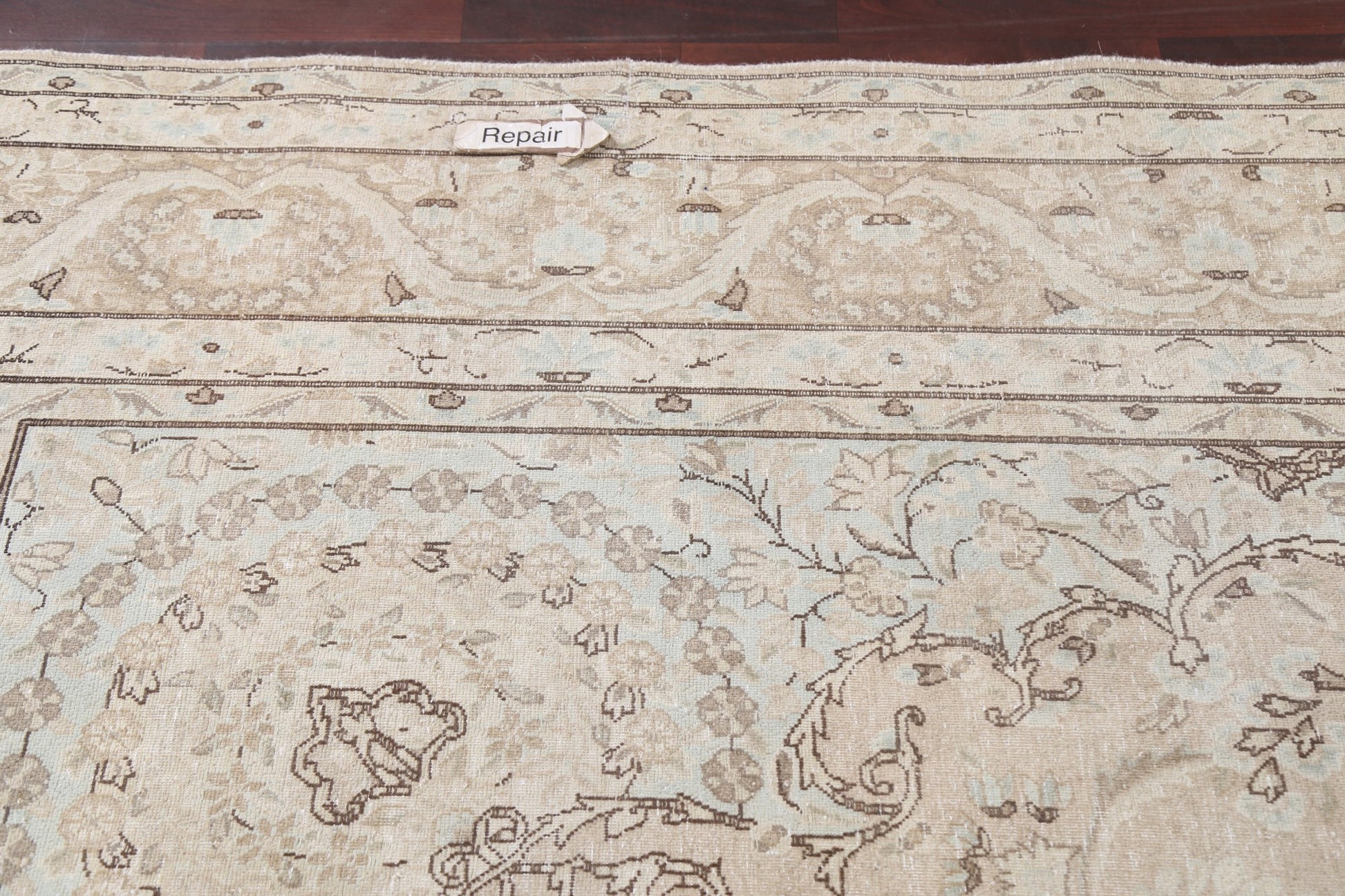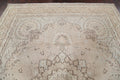 A Beautiful Genuine Persia ( Persia ) Kerman rug is Hand Knotted by skillful weavers in Persia ( Persia ) with 100% Wool Material. This rug is in Very Good (Evenly Low Pile-Repair) condition. dimensions are 12' 10'' X 9' 8'' in foot and 391 X 295 in centimeter. the primary color is Beige & Ivories.
