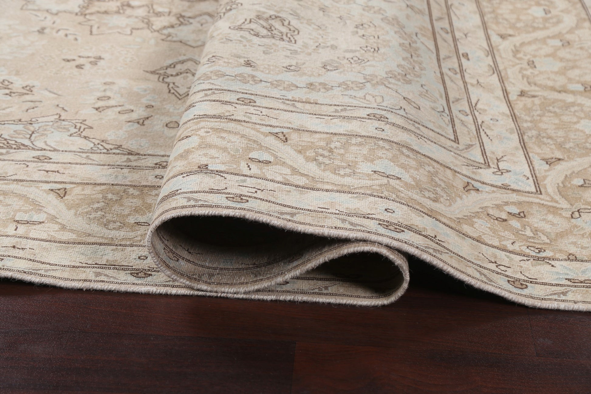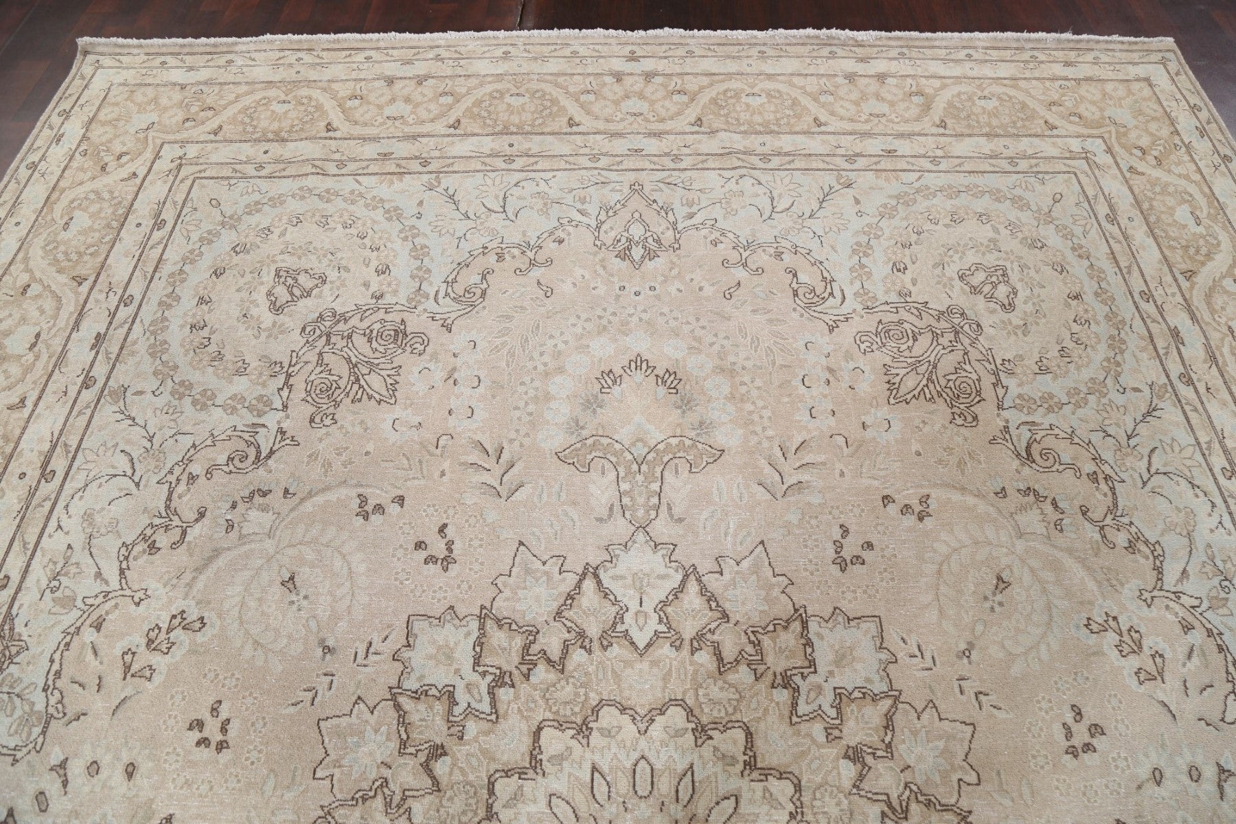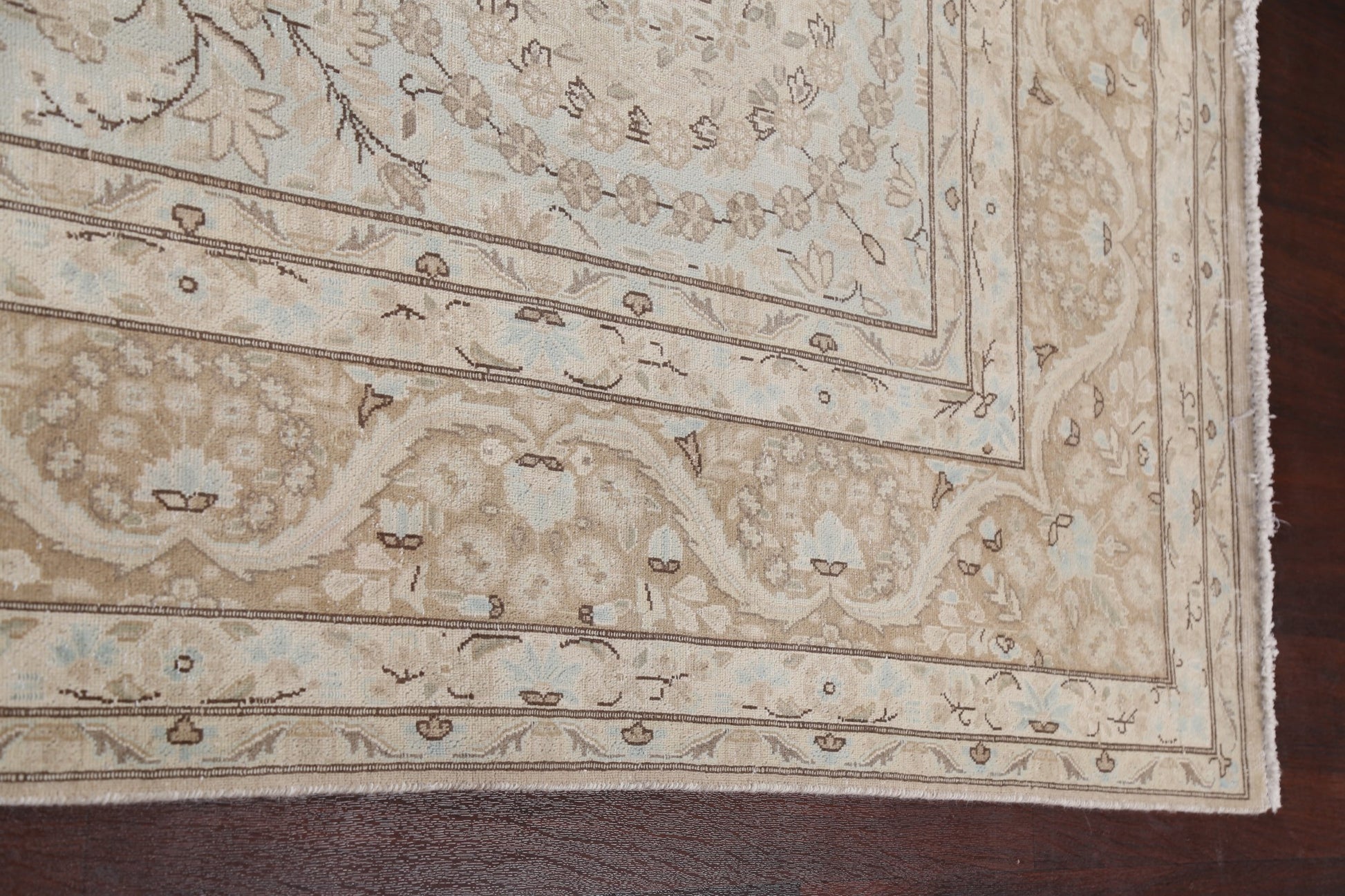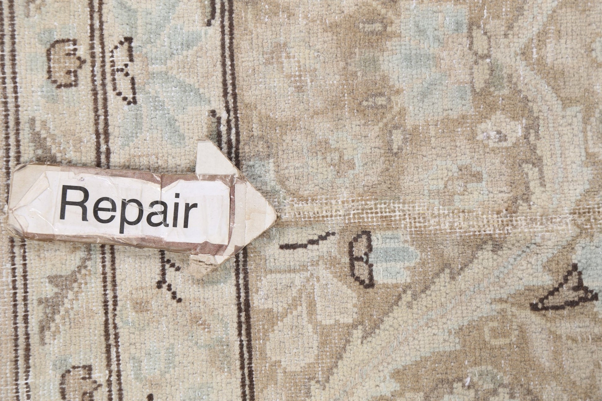 A Beautiful Genuine Persia ( Persia ) Kerman rug is Hand Knotted by skillful weavers in Persia ( Persia ) with 100% Wool Material. This rug is in Very Good (Evenly Low Pile-Repair) condition. dimensions are 12' 10'' X 9' 8'' in foot and 391 X 295 in centimeter. the primary color is Beige & Ivories.